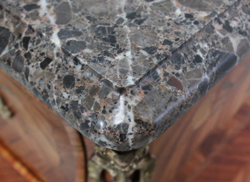 Son dessus est un Marbre Granité foncé au veinage Blanc, taillé en Bec de Corbin sur son pourtour.