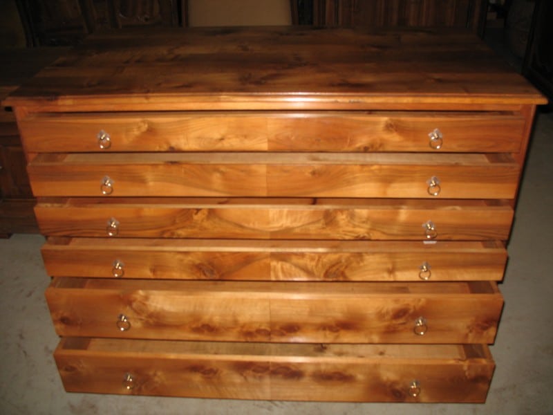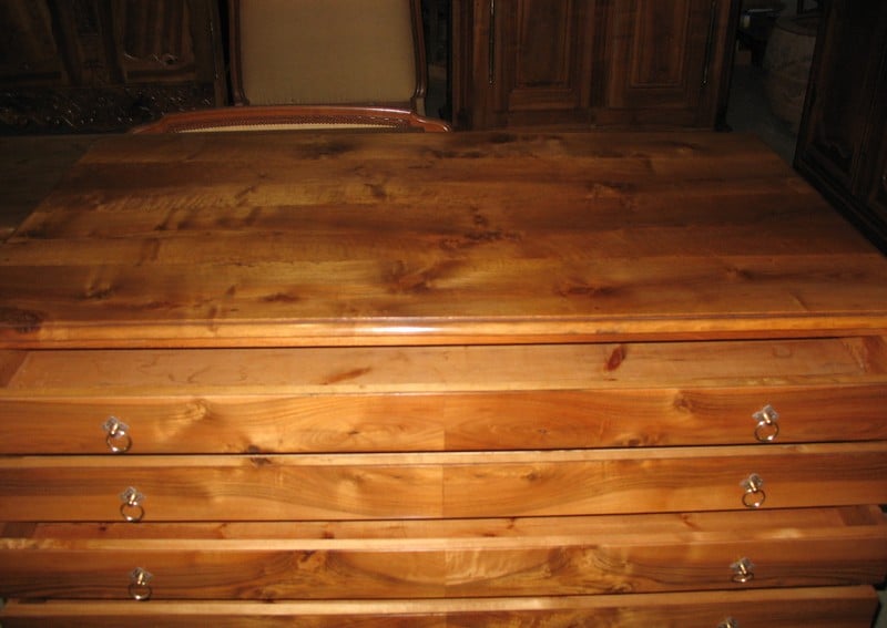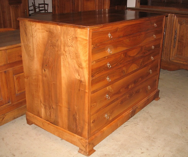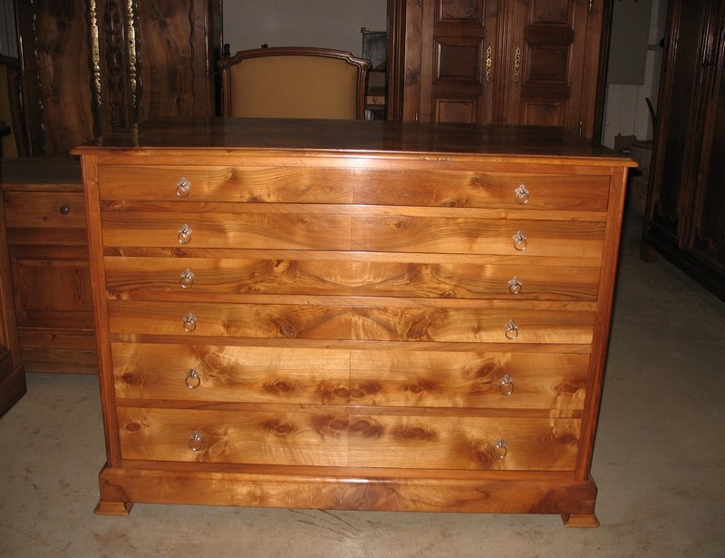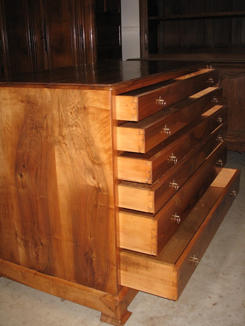 Importante commode ‘pantalonnière’ en noyer massif ouvrant à 6 tiroirs : 2 profonds en partie basse et 4 plus étroits en partie haute. Très beau veinage du noyer sur la façade des tiroirs.