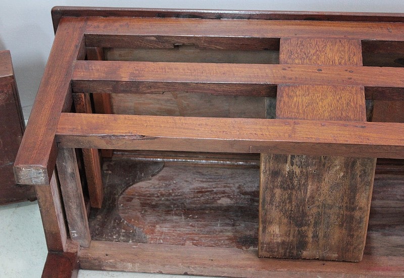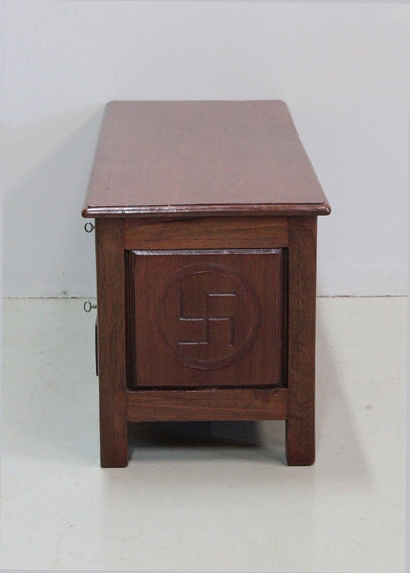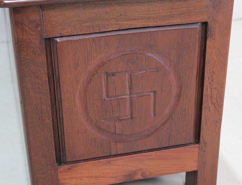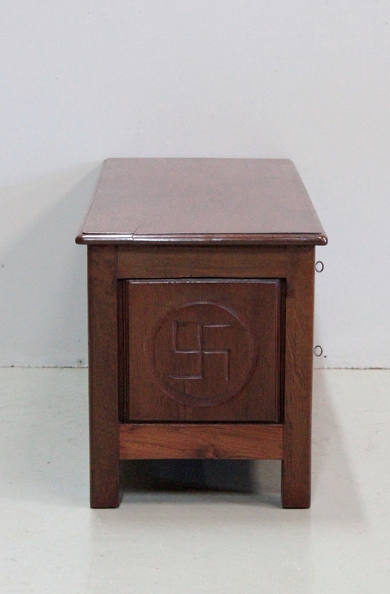 Le dos et les côtés sont ornés de panneaux sculptés moulurés où l’on peut y voir de part et d’autre le symbole de la Svastika*, symbole indien de bon augure.
