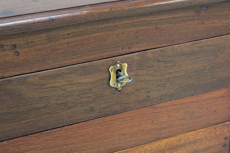 Elle ouvre par 4 tiroirs fermant à clefs dont les entrées de serrures sont en laiton.