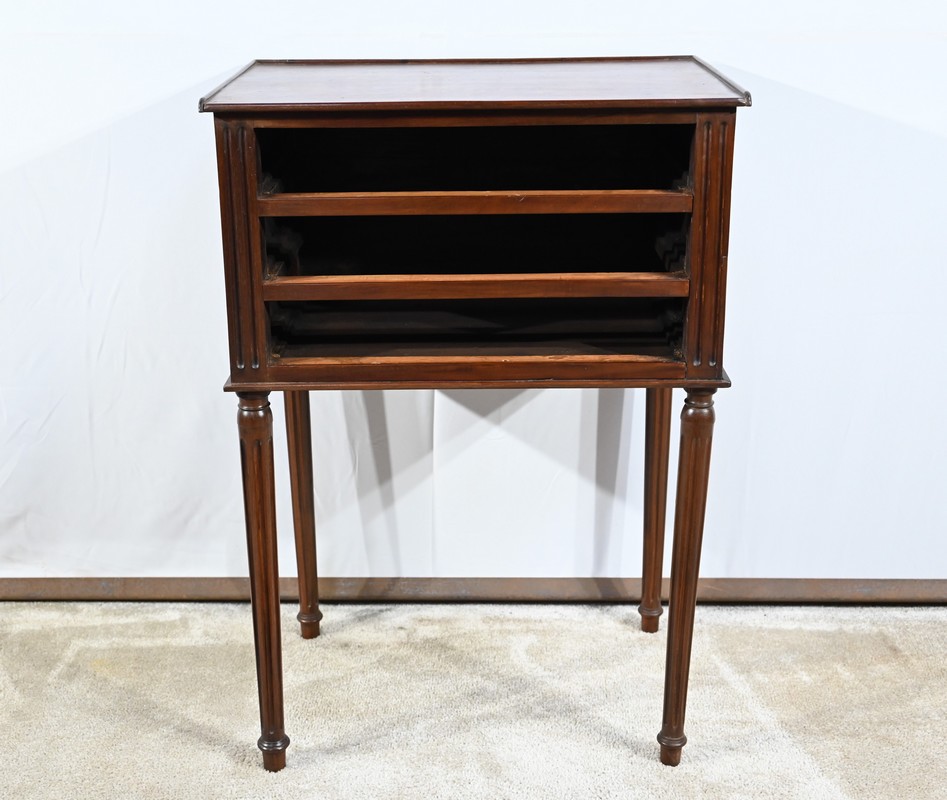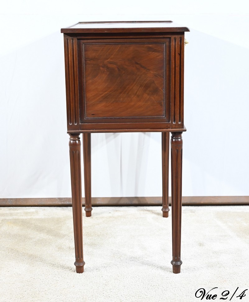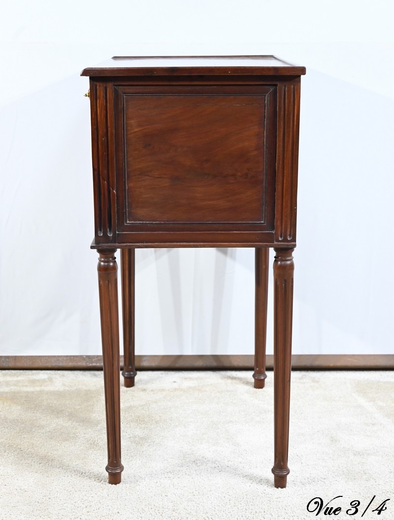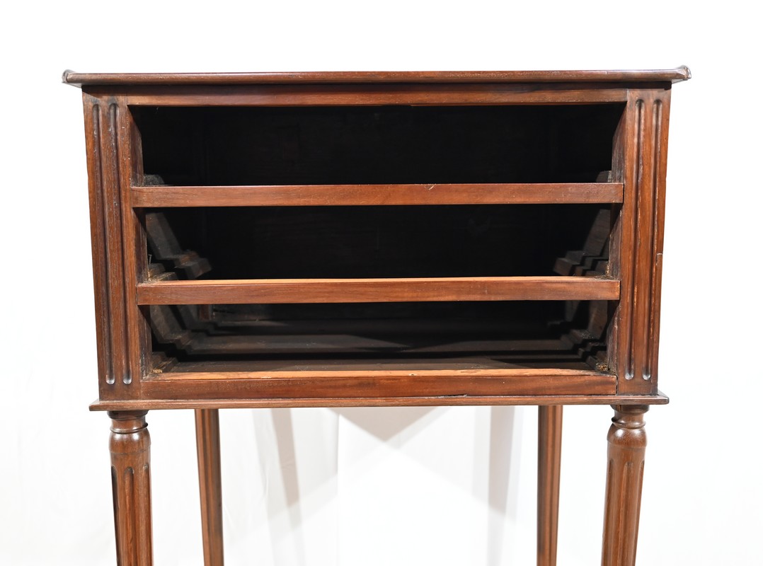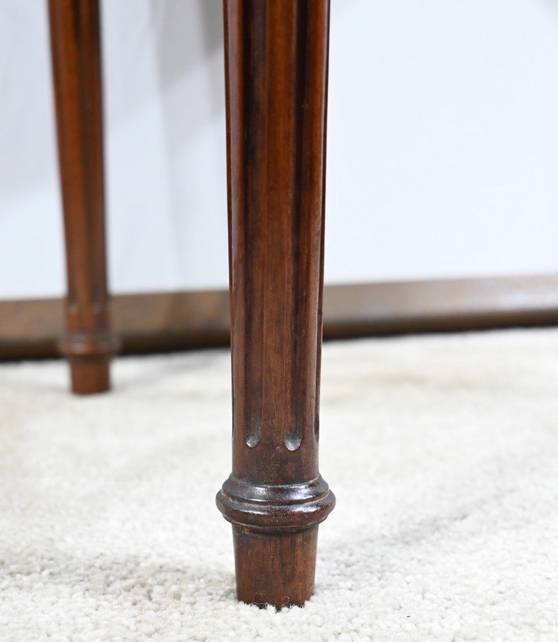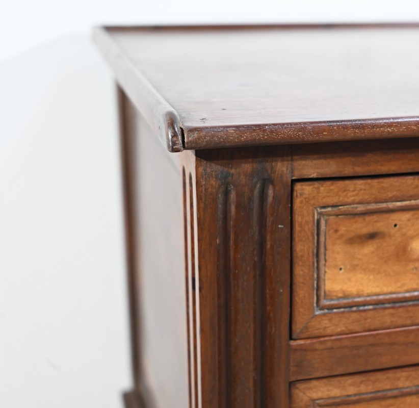 Les montants en façade et sur les côtés sont cannelés, ils se profilent sur quatre pieds massifs tournés en fuseau avec cannelures arrêtées.