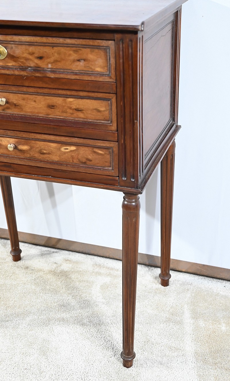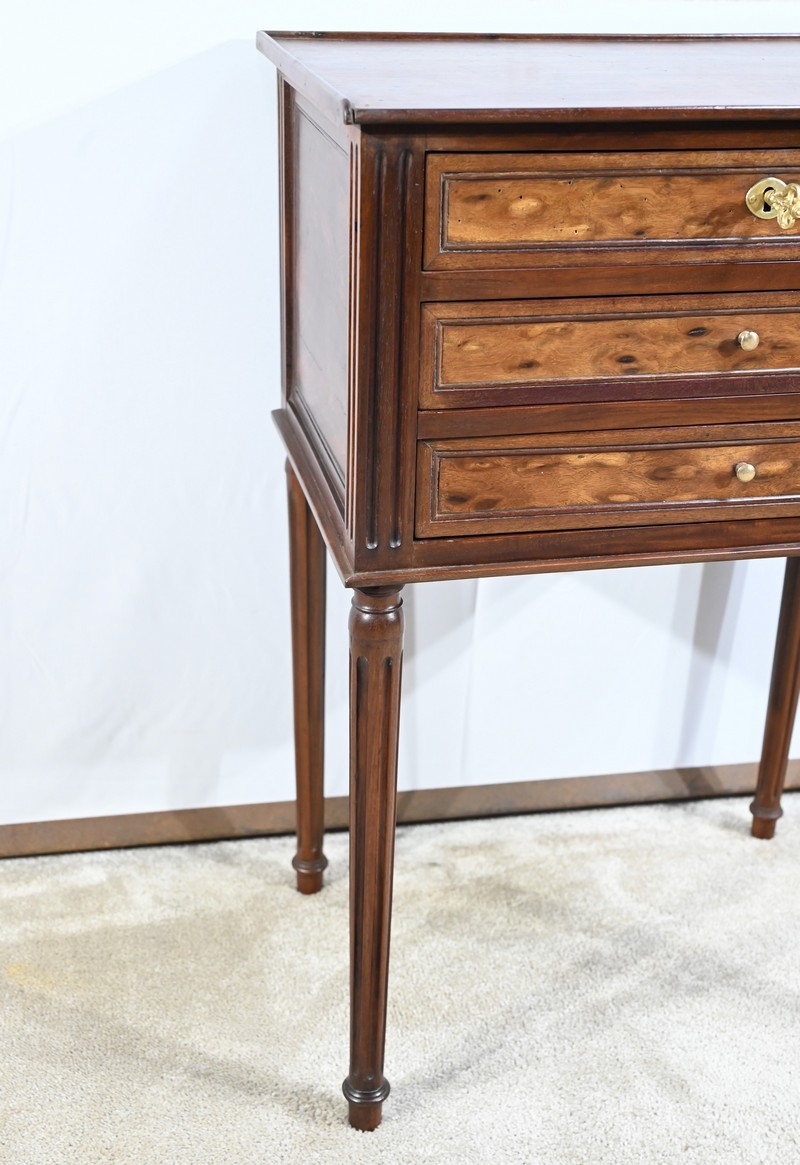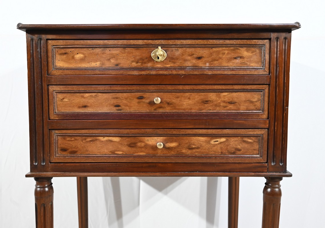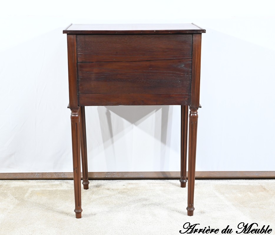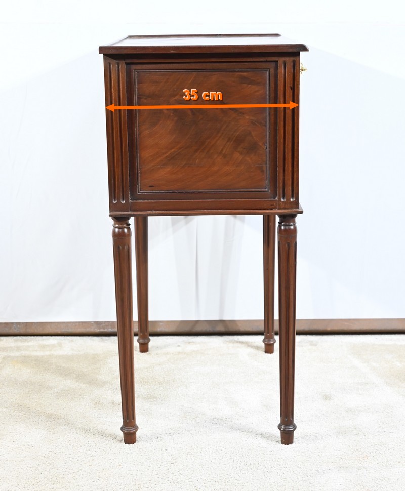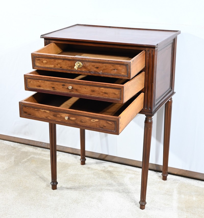 Les montants en façade et sur les côtés sont cannelés, ils se profilent sur quatre pieds massifs tournés en fuseau avec cannelures arrêtées.
