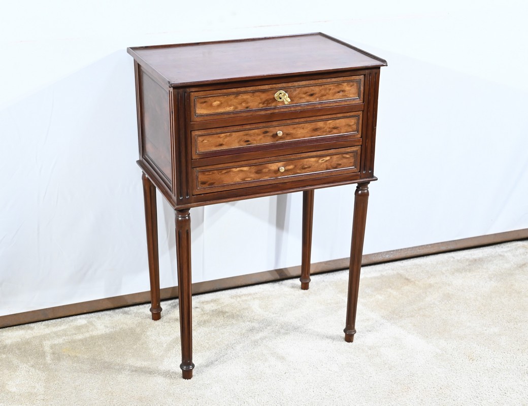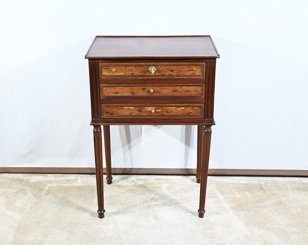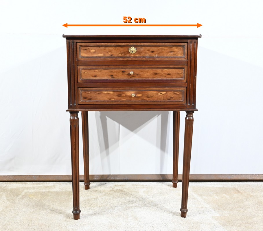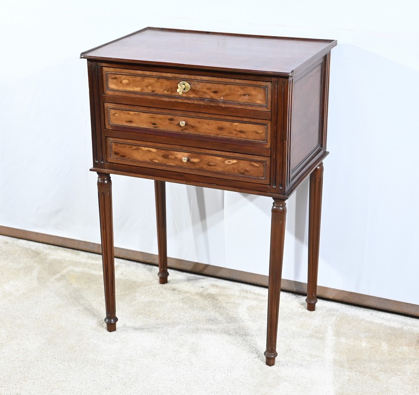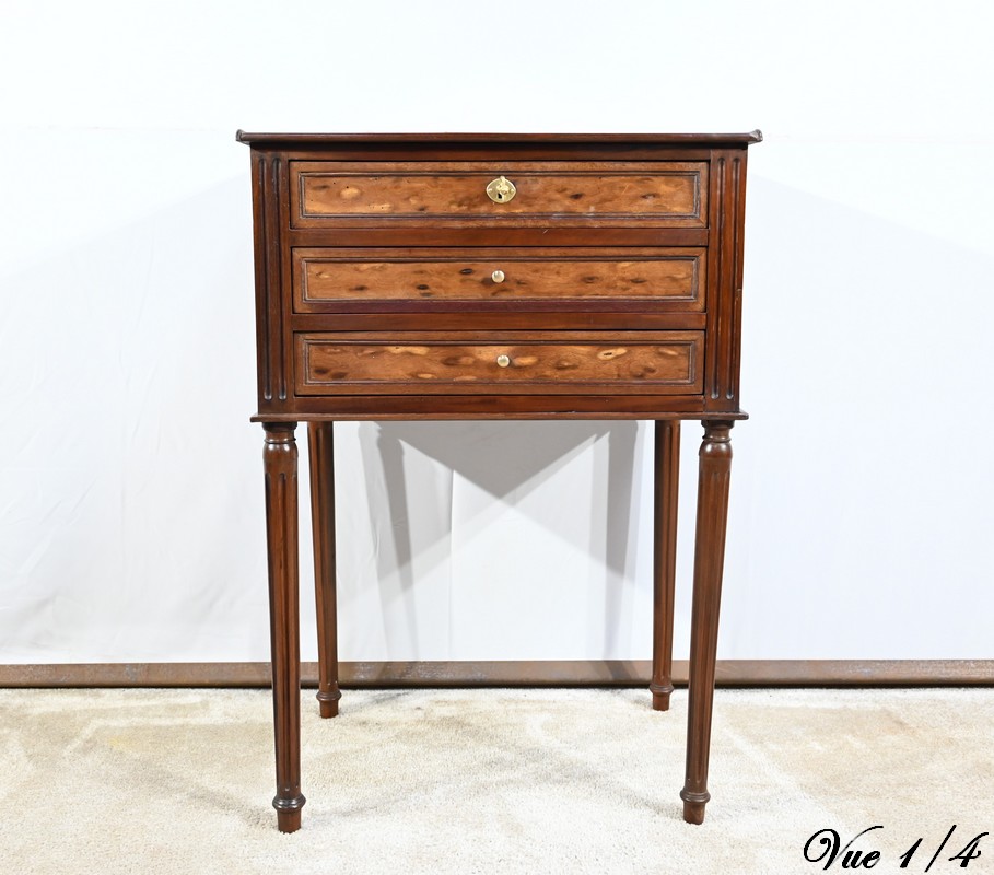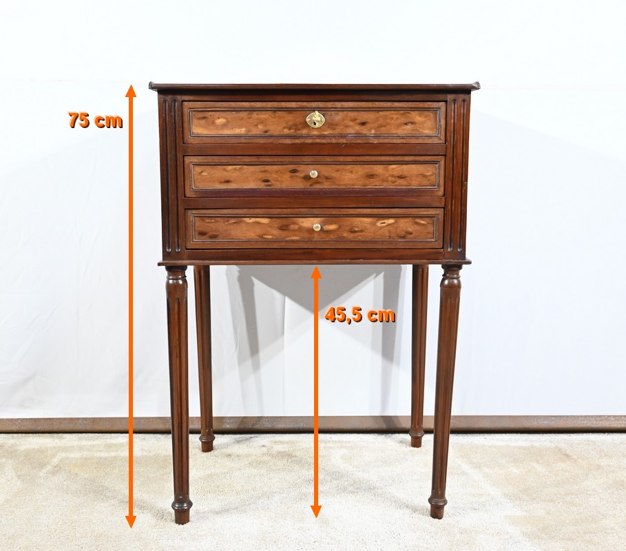 Les montants en façade et sur les côtés sont cannelés, ils se profilent sur quatre pieds massifs tournés en fuseau avec cannelures arrêtées.