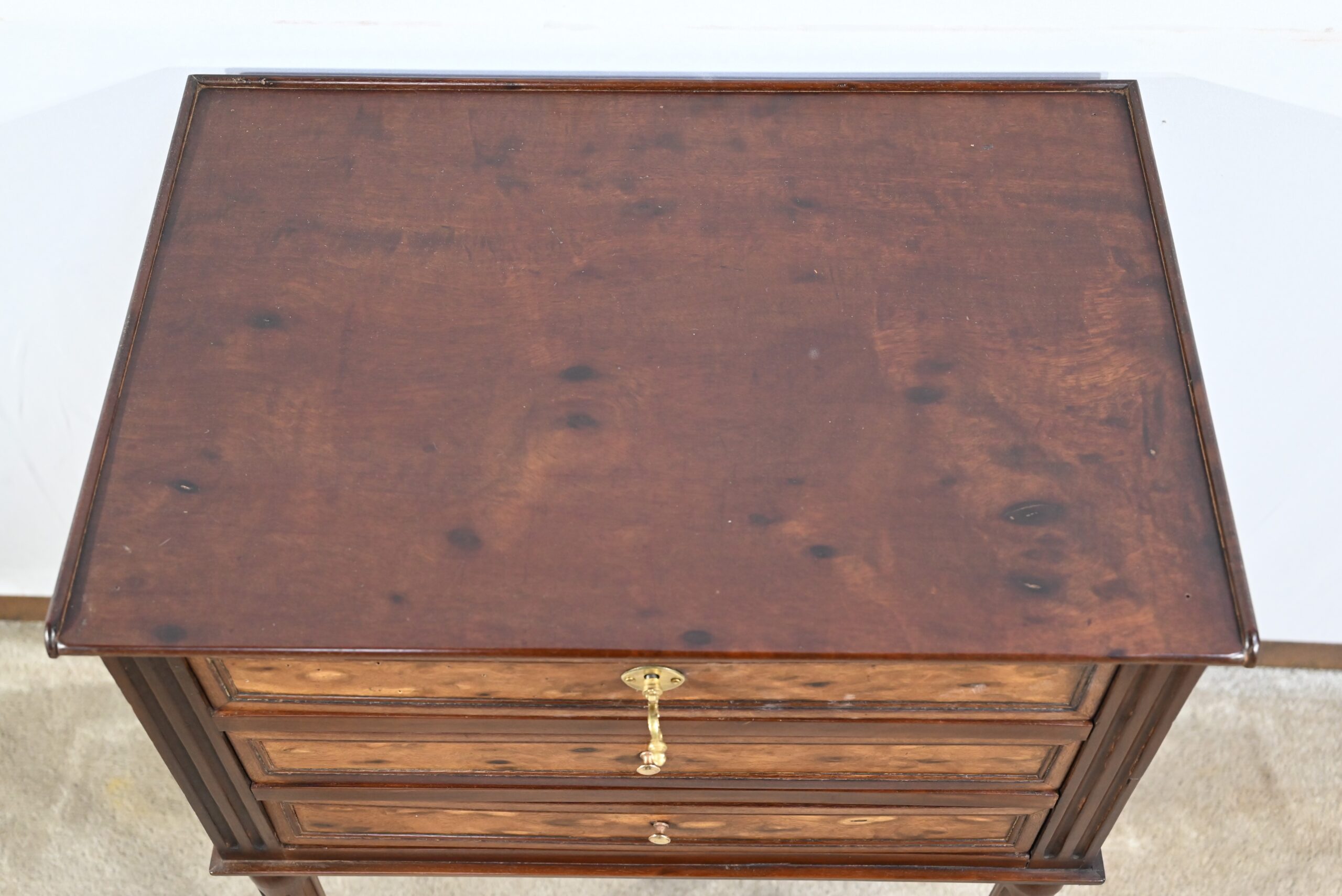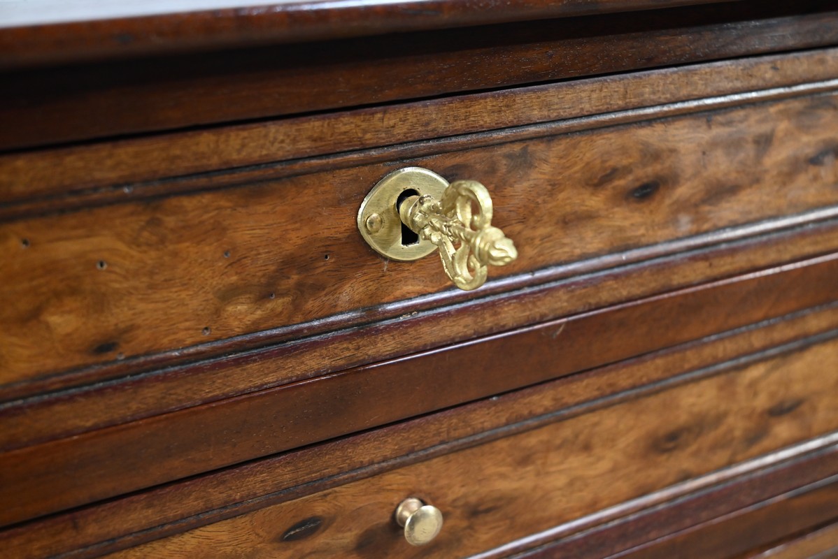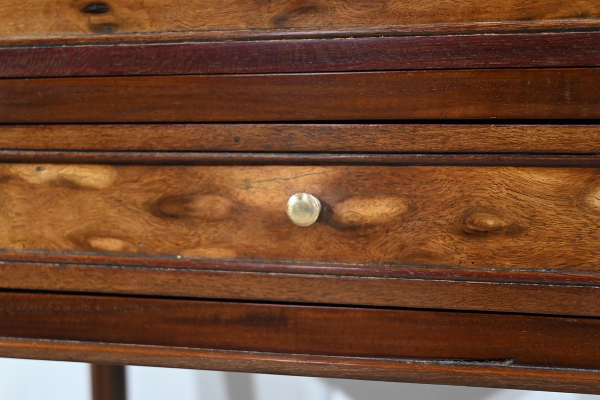 Ce meuble est composé en façade de trois tiroirs identiques dont les façades en acajou moiré sont soulignées de baguettes moulurées.