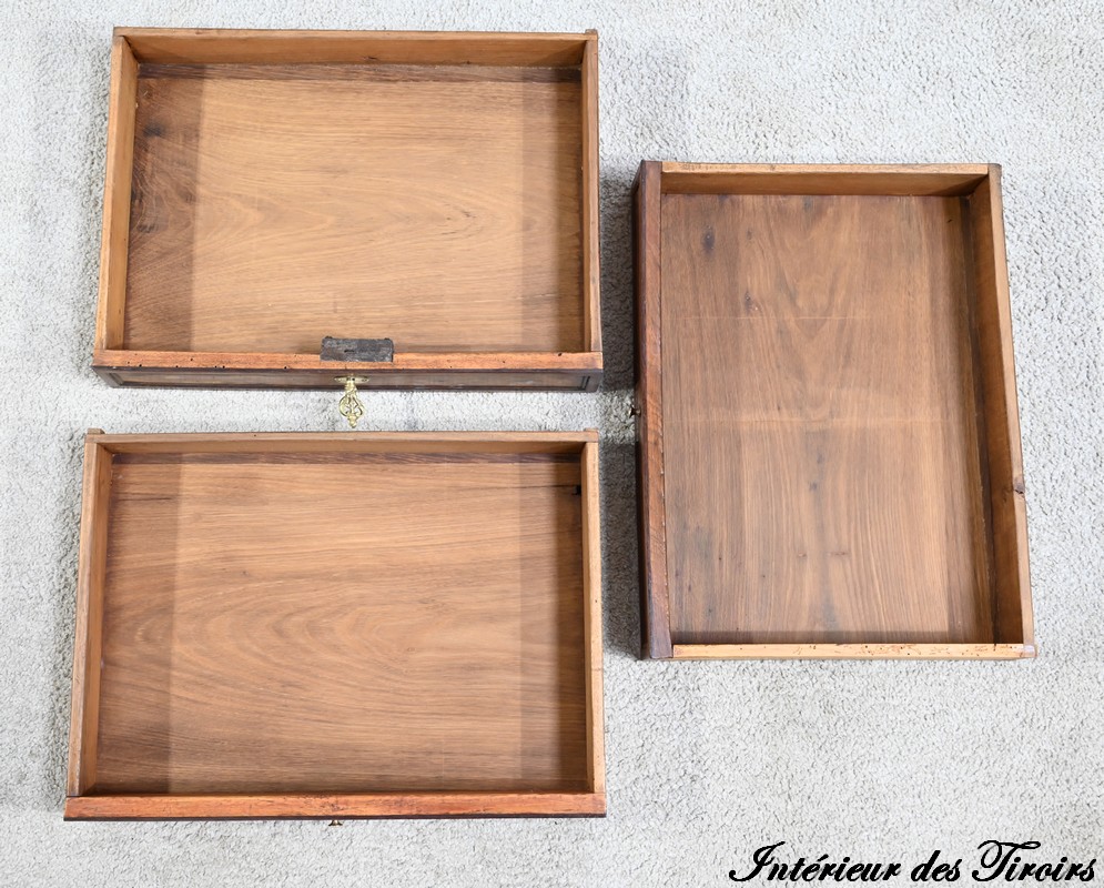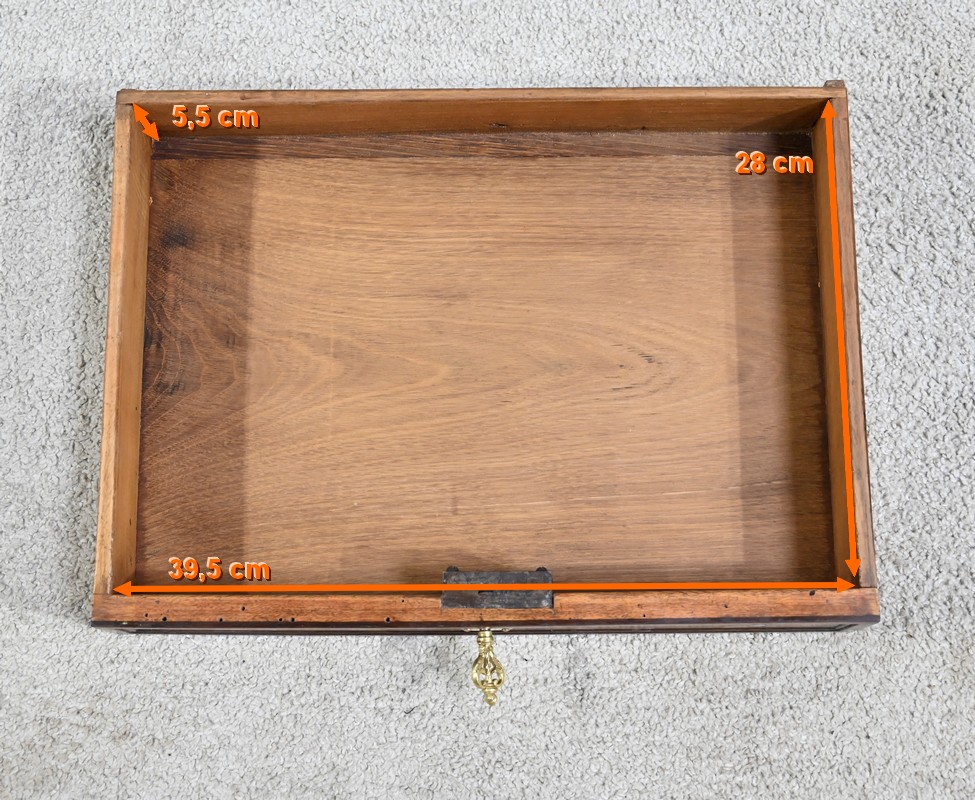 Le tiroir supérieur est munie d’une serrure d’origine fonctionnelle avec clé et entrée laiton.