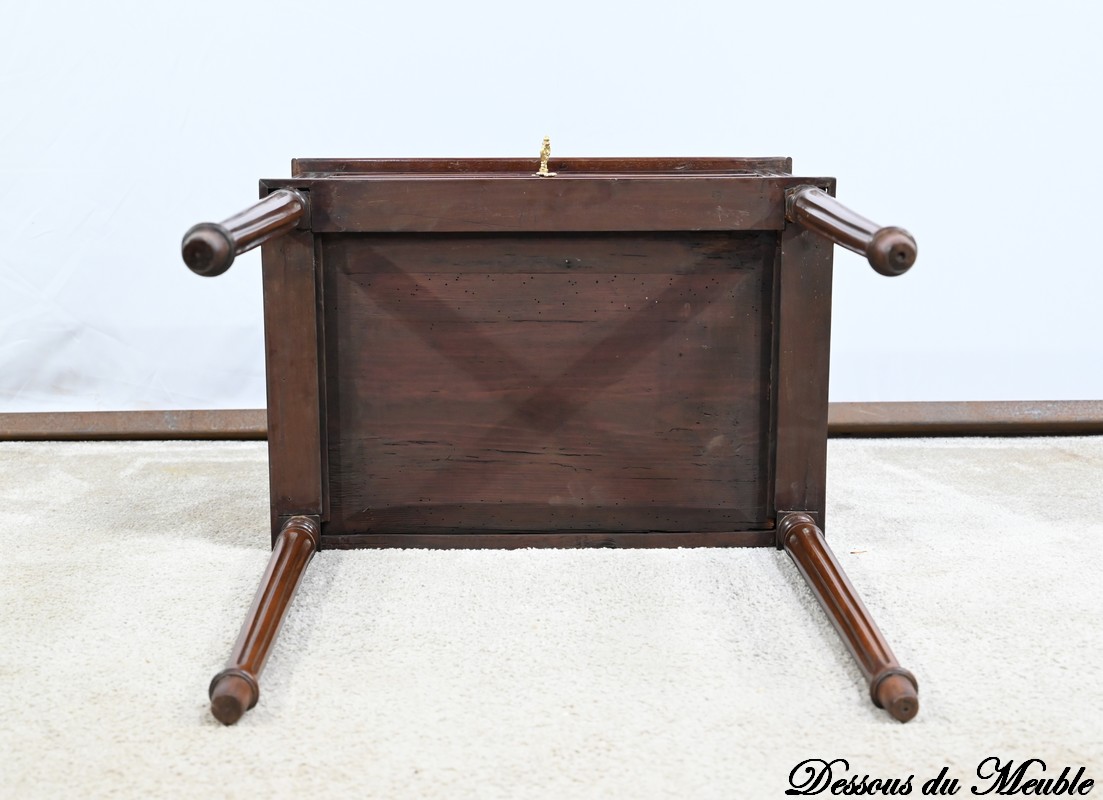 Les côtés sont ouvragés dans le même esprit, à savoir, avec placage d’acajou de cuba et baguette.