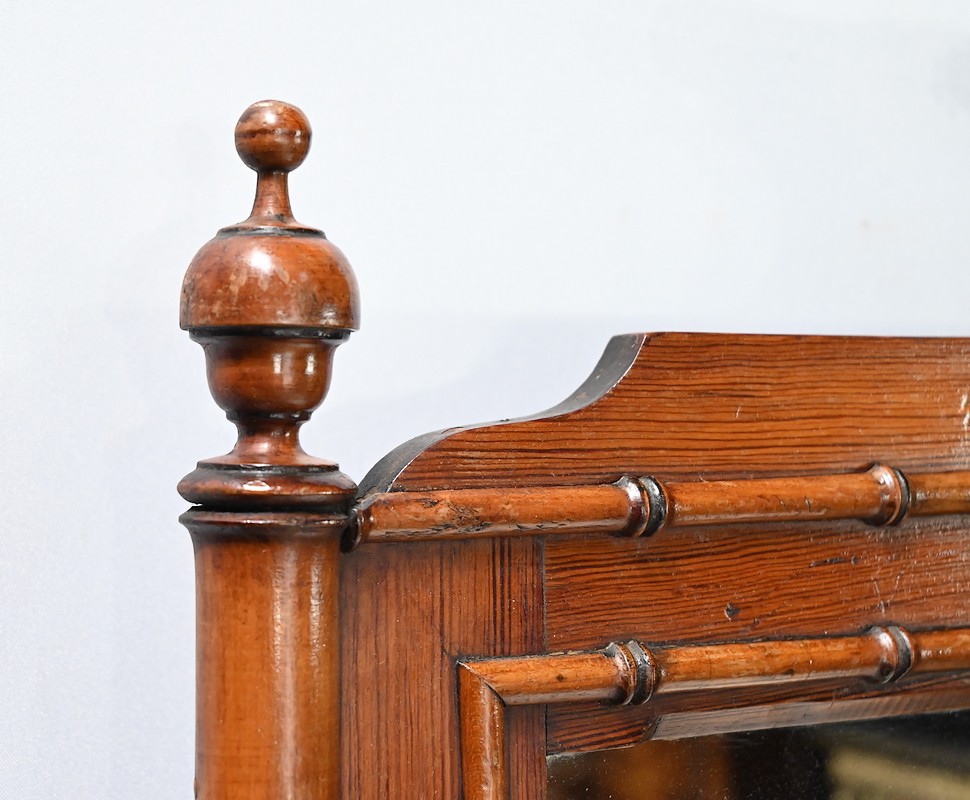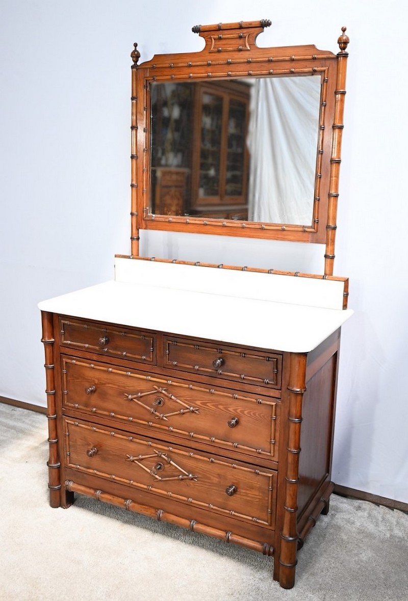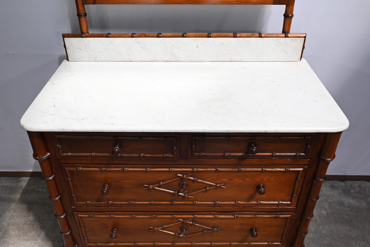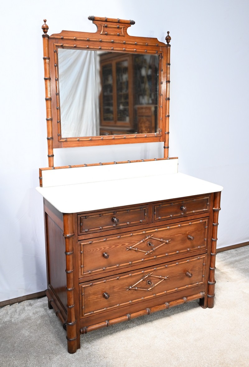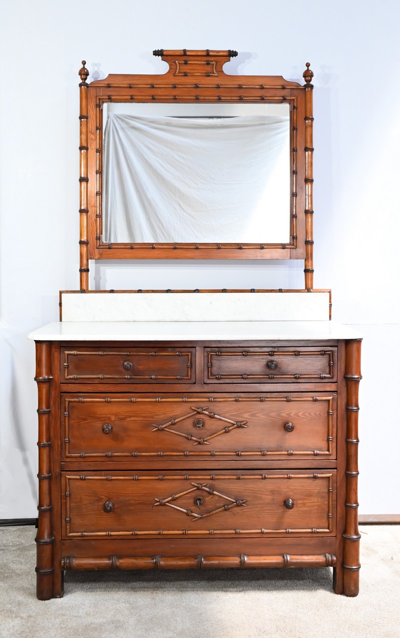 Ce meuble, sommé d’un marbre blanc de Carrare, présente un important miroir authentique foncé dans un cadre en pitchpin reprenant les mêmes décors de cette graminée qu’est le bambou.