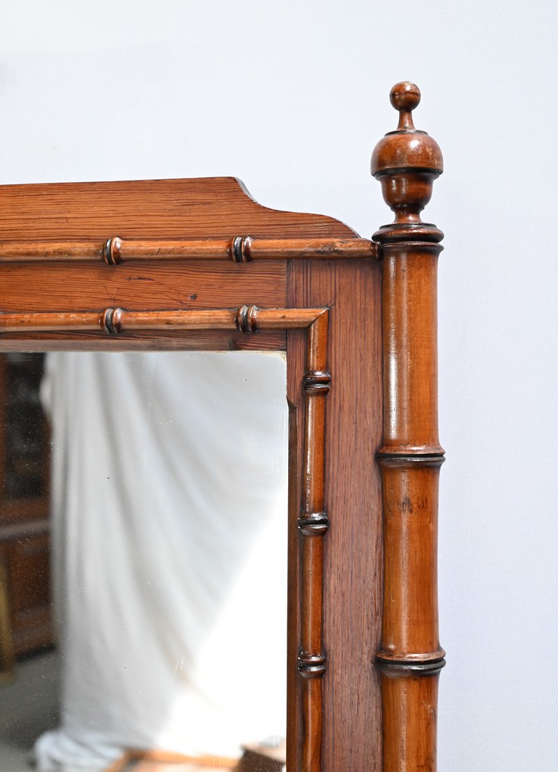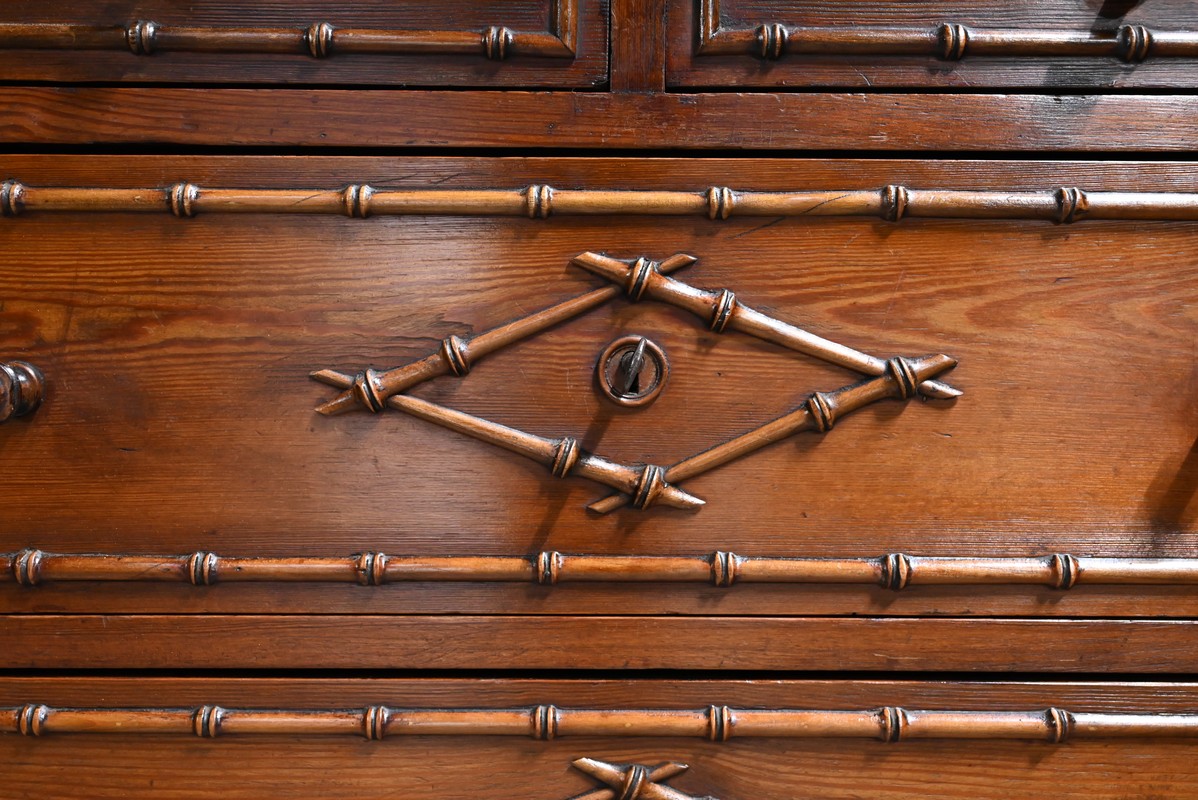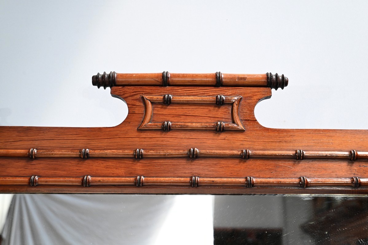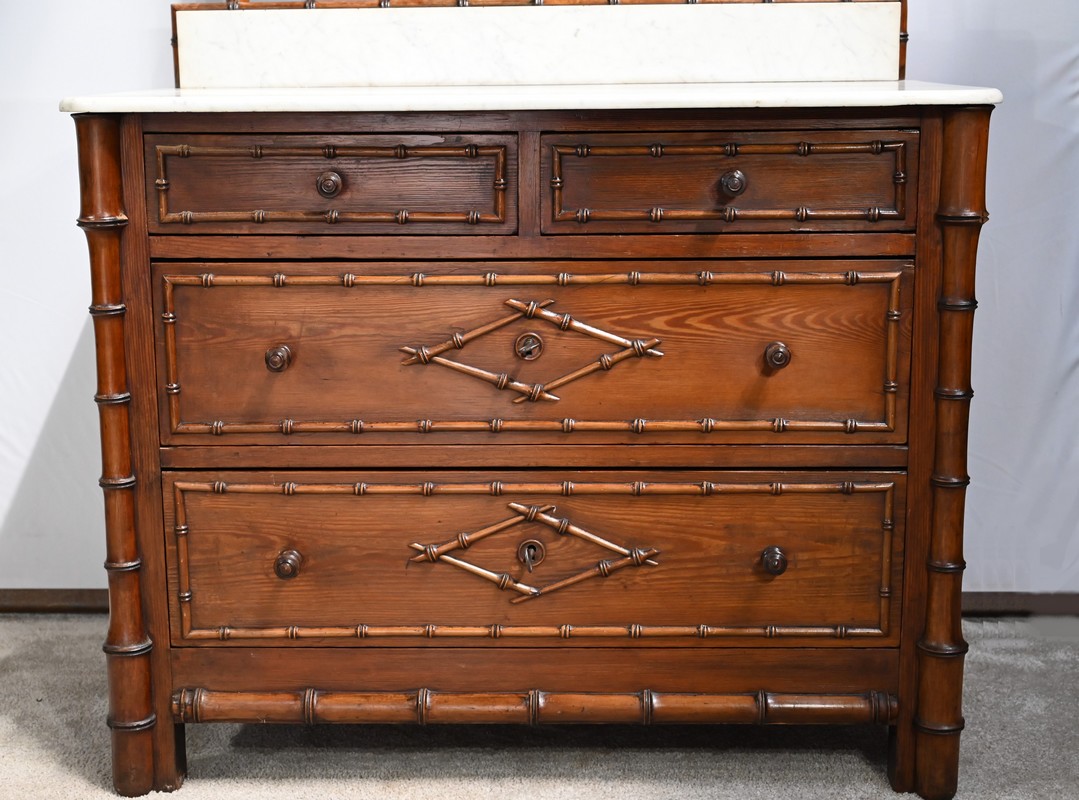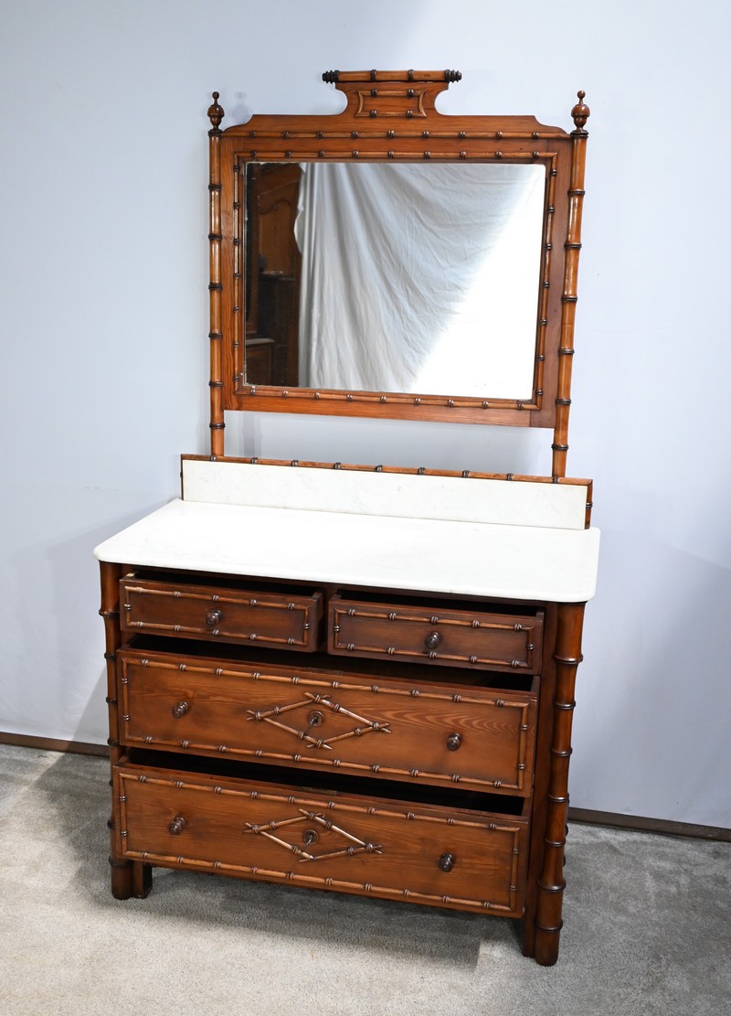 Ce meuble, sommé d’un marbre blanc de Carrare, présente un important miroir authentique foncé dans un cadre en pitchpin reprenant les mêmes décors de cette graminée qu’est le bambou.