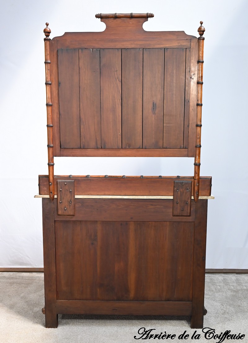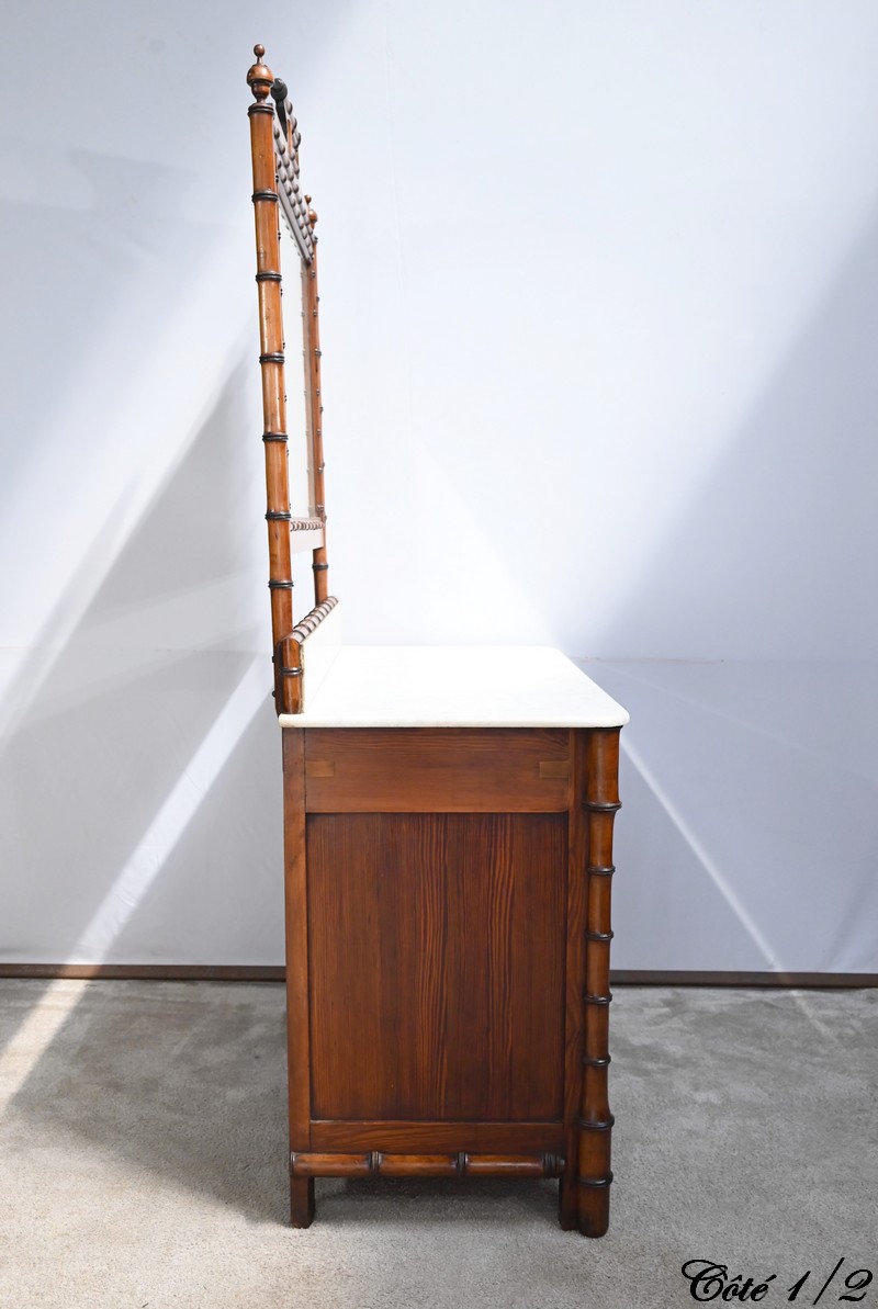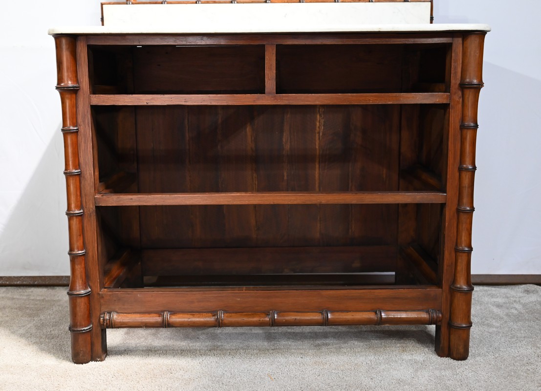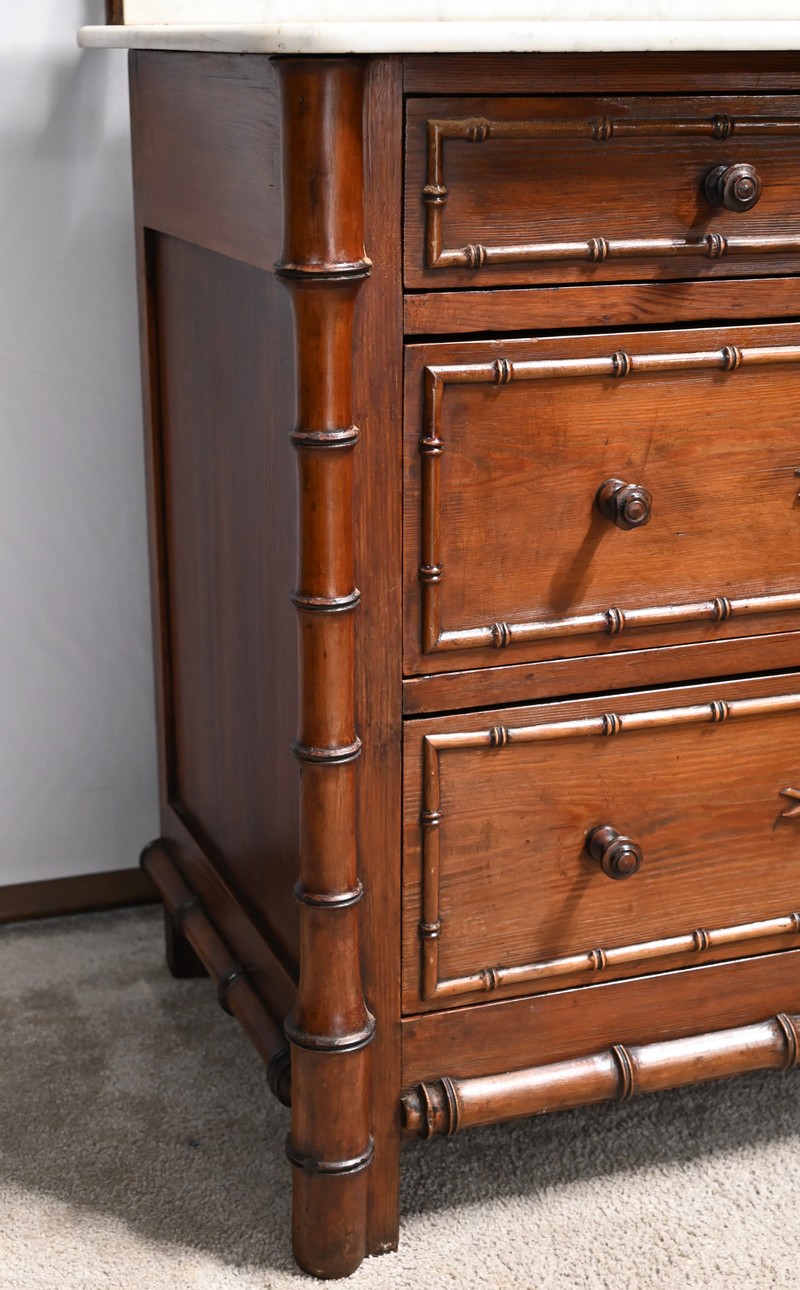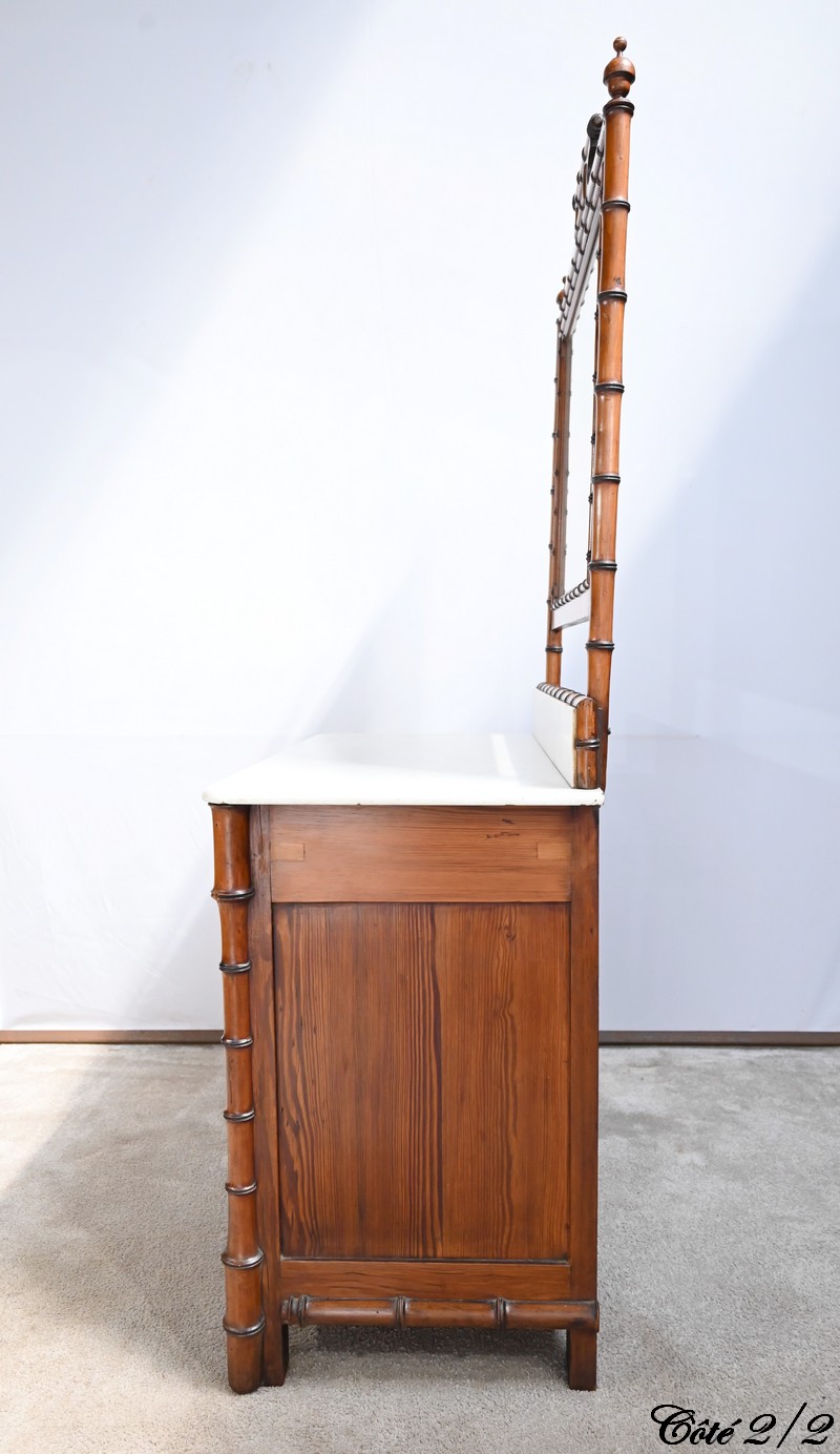 Ce meuble, sommé d’un marbre blanc de Carrare, présente un important miroir authentique foncé dans un cadre en pitchpin reprenant les mêmes décors de cette graminée qu’est le bambou.