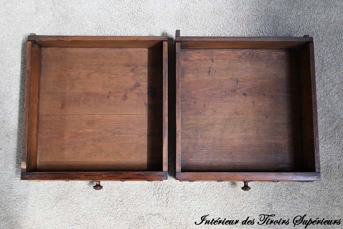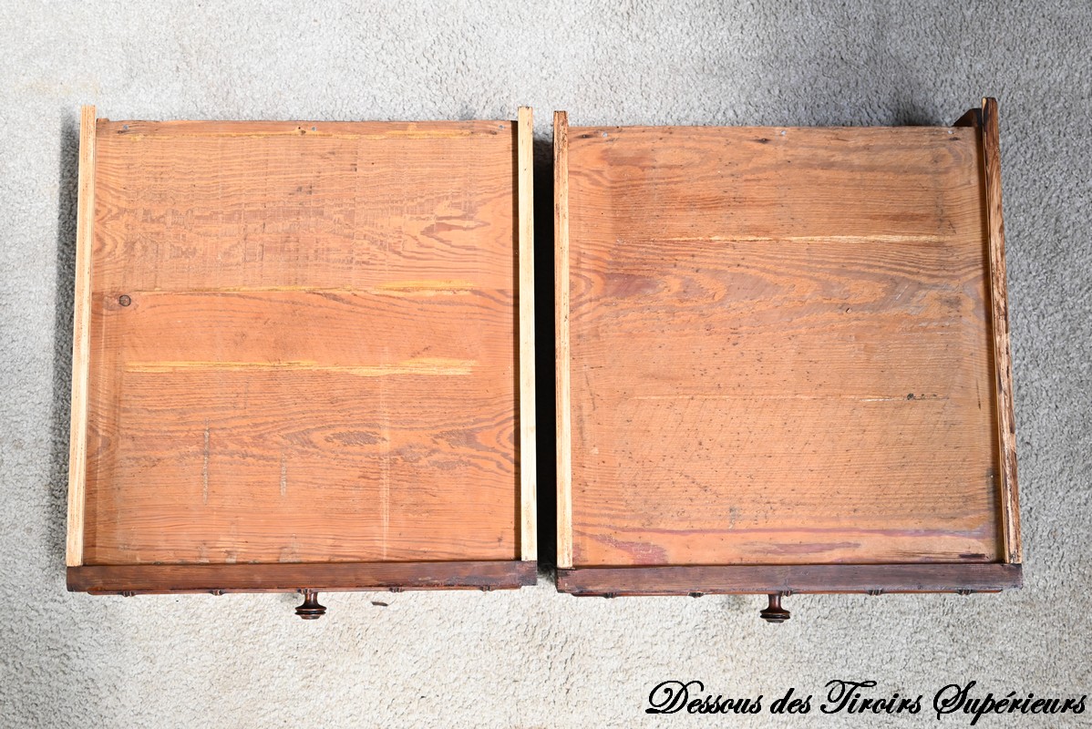 Cette partie commode propose également deux tiroirs inférieurs de plus grande dimension, ouvragés à l’identique, munis de serrures d’origine fonctionnelles avec entrées et boutons bois, soulignés de baguettes disposées en losange.