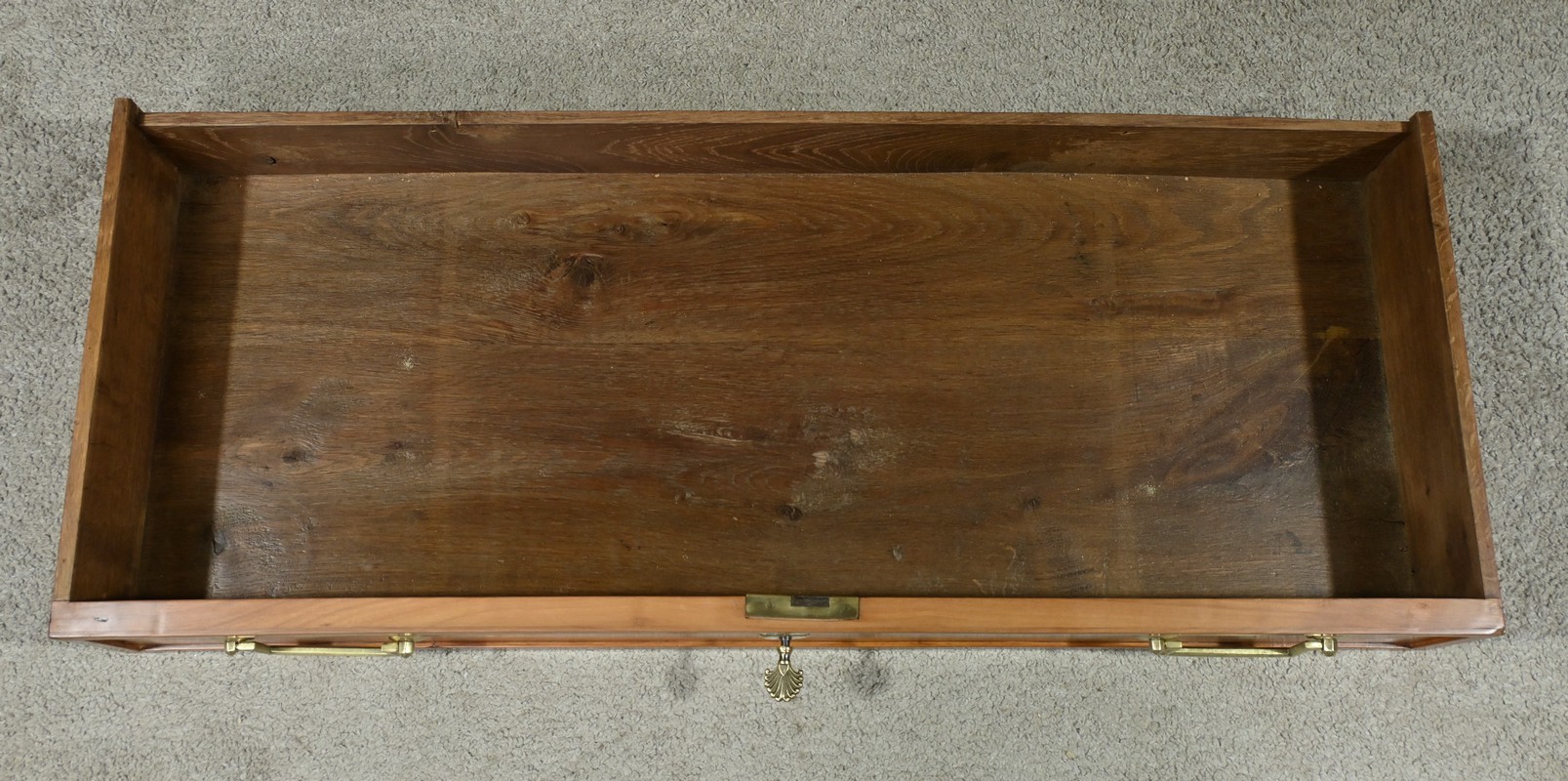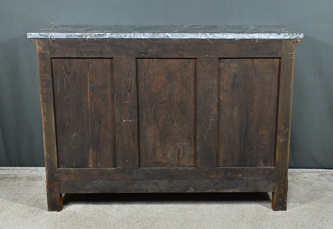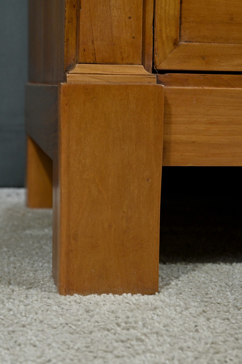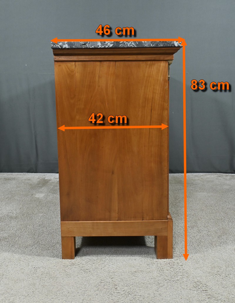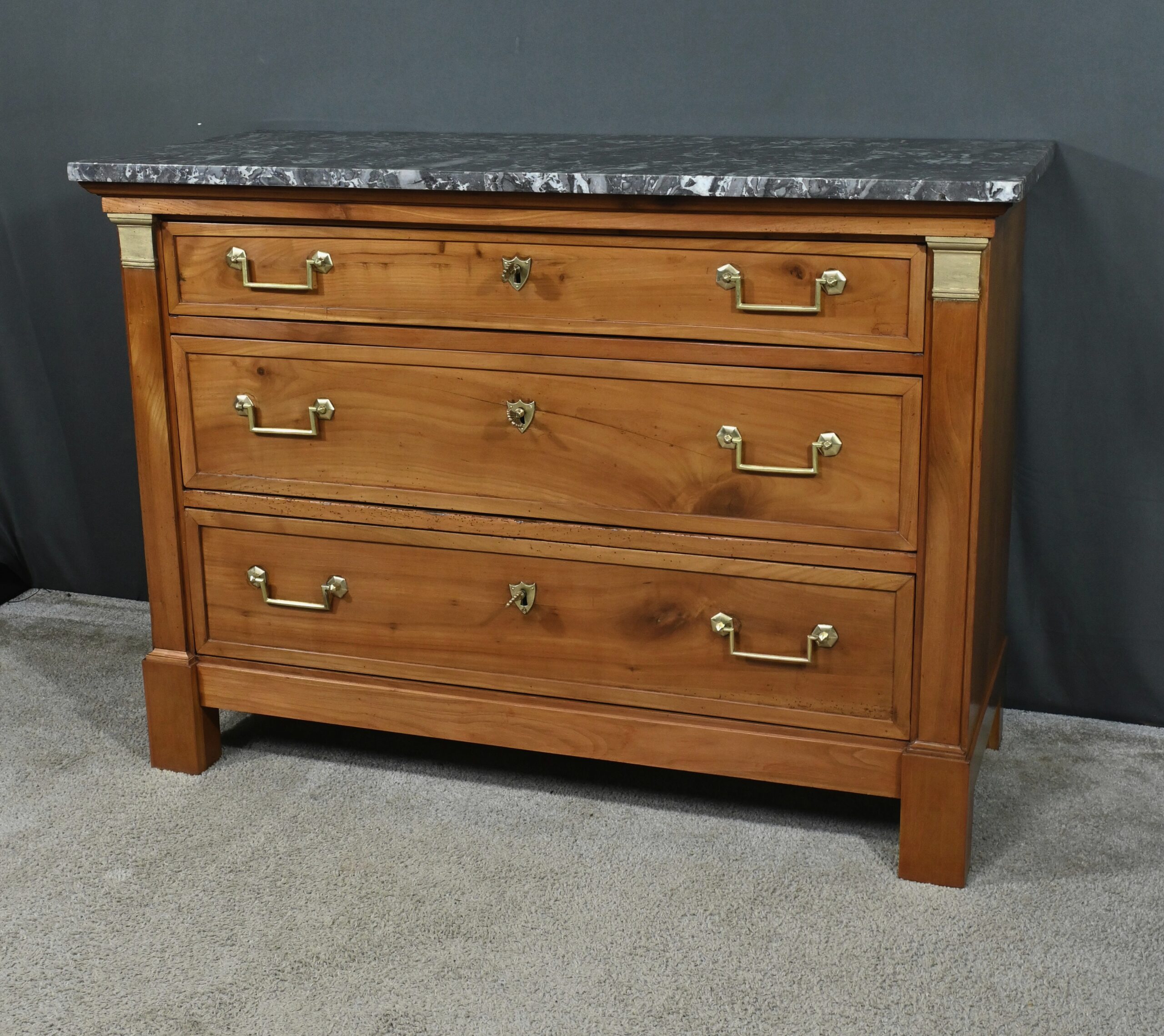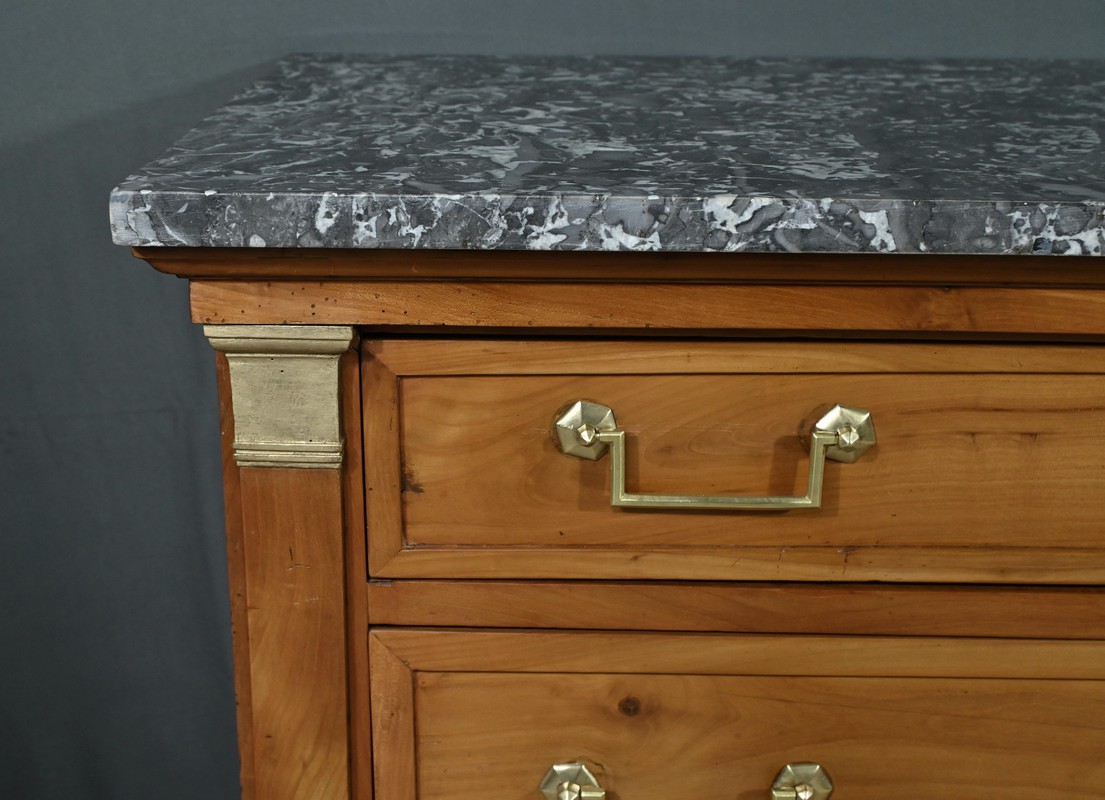 Ravissante petite commode de propriété, fabriquée en merisier et sommée d’un marbre gris belge, datant de l’époque Directoire du début du XIXe siècle. Son design raffiné et ses finitions font de cette pièce un meuble original et fonctionnel. Trois tiroirs spacieux (le plus haut est moins large) sont ornés de poignées de tirage tombantes en laiton doré et de serrures en état de fonctionnement avec entrée cœur. De chaque coté les montants sobres sont pourvus de garniture formant chapiteau en laiton qui souligne les coins supérieurs du meuble.