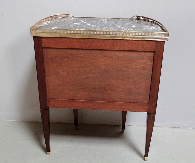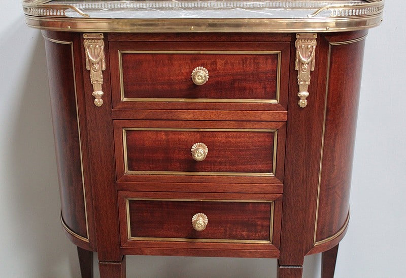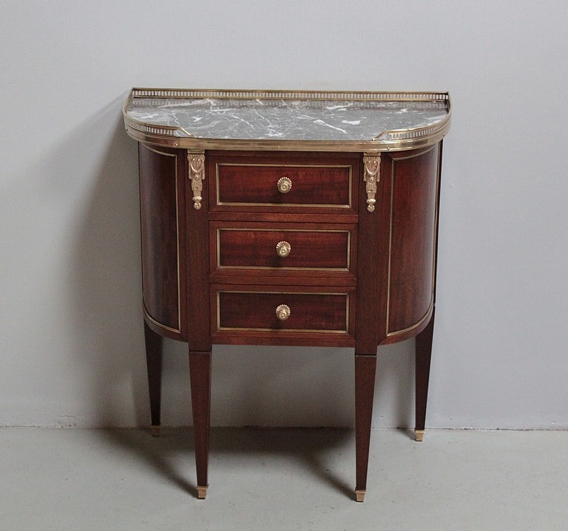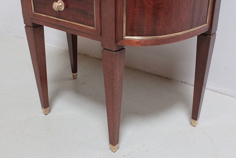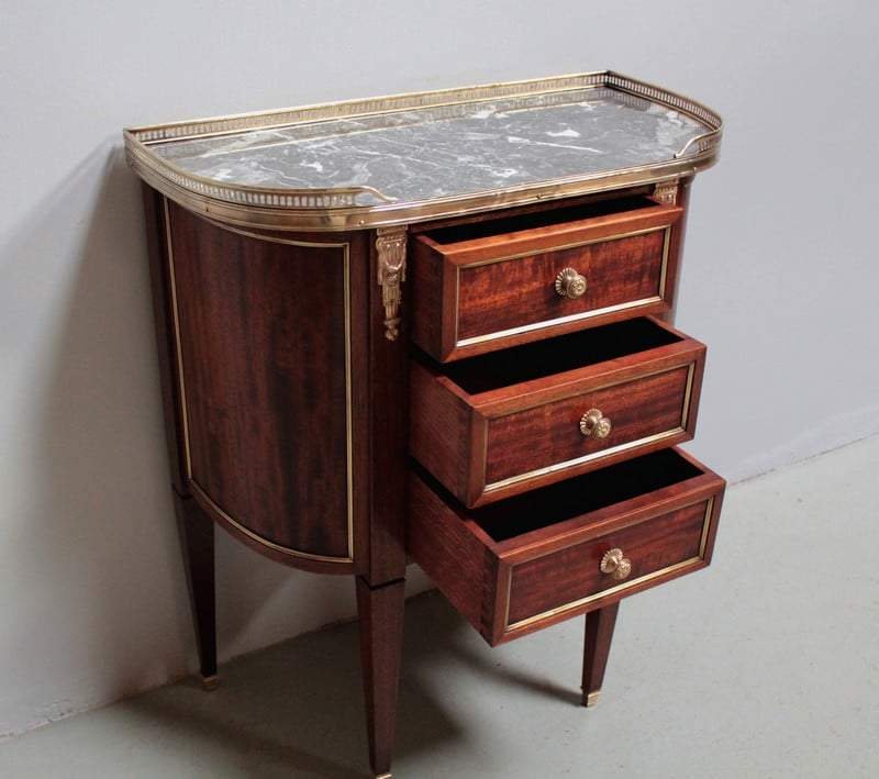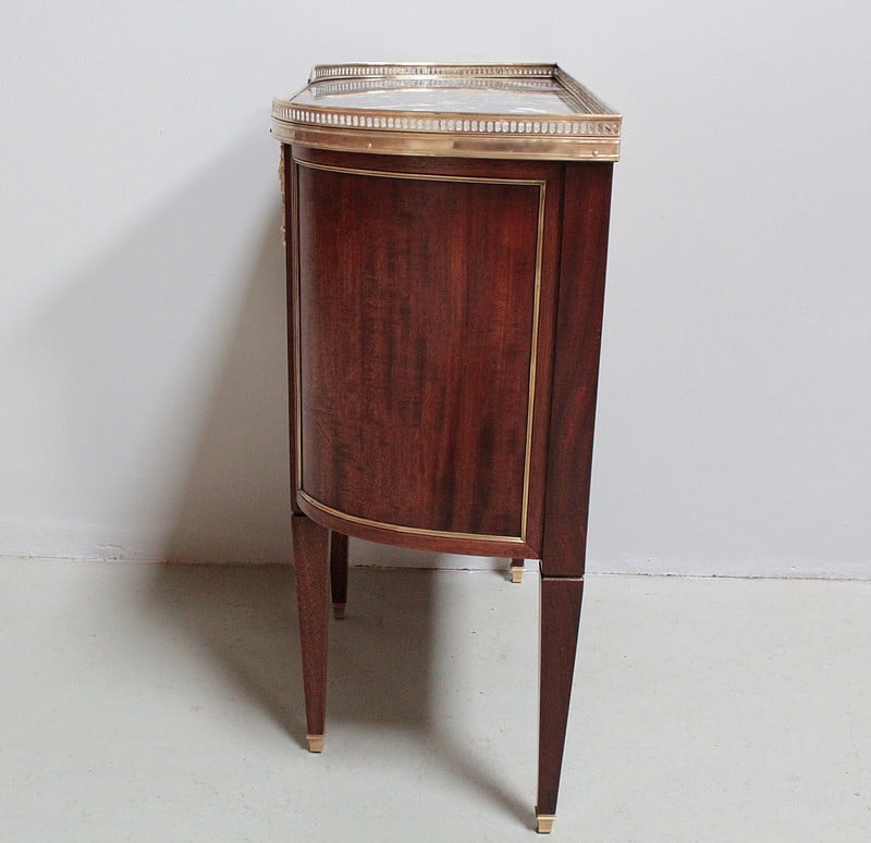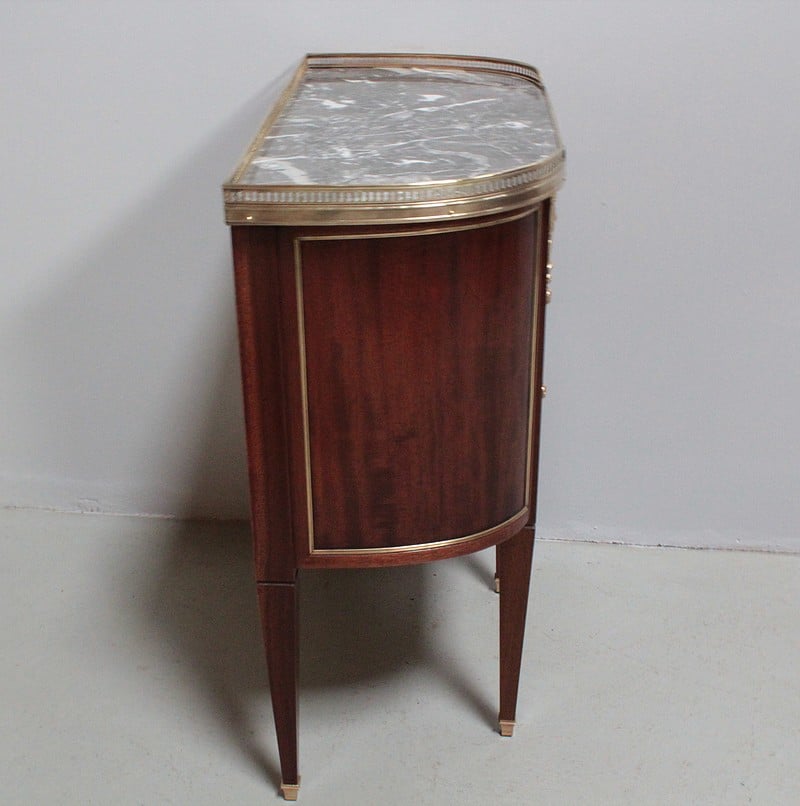 Petite commode cintrée de style Louis XVI – Directoire, en acajou et placage d’acajou. Dessus de marbre gris veiné ceinturé d’une galerie ajourée en laiton.
