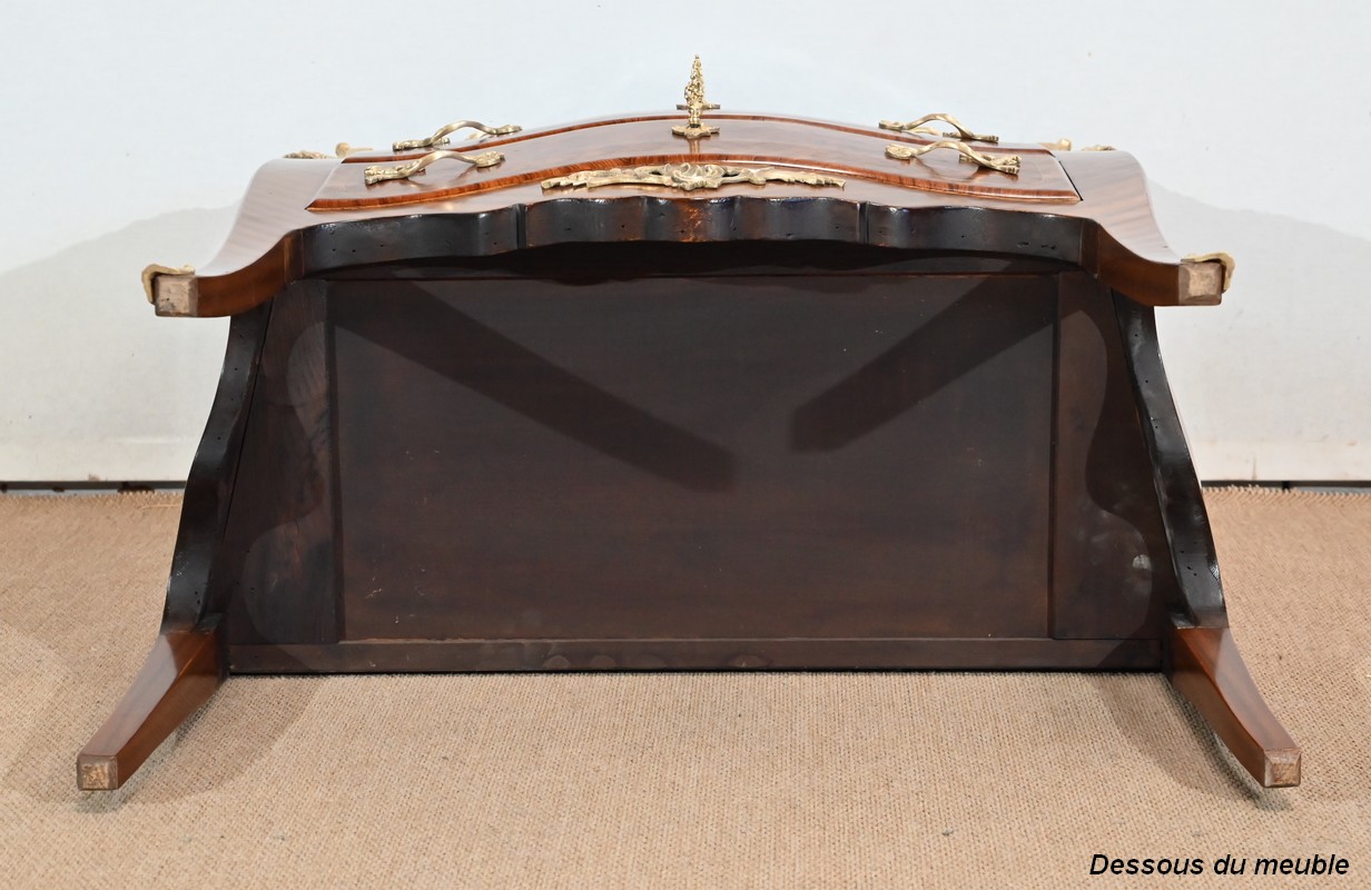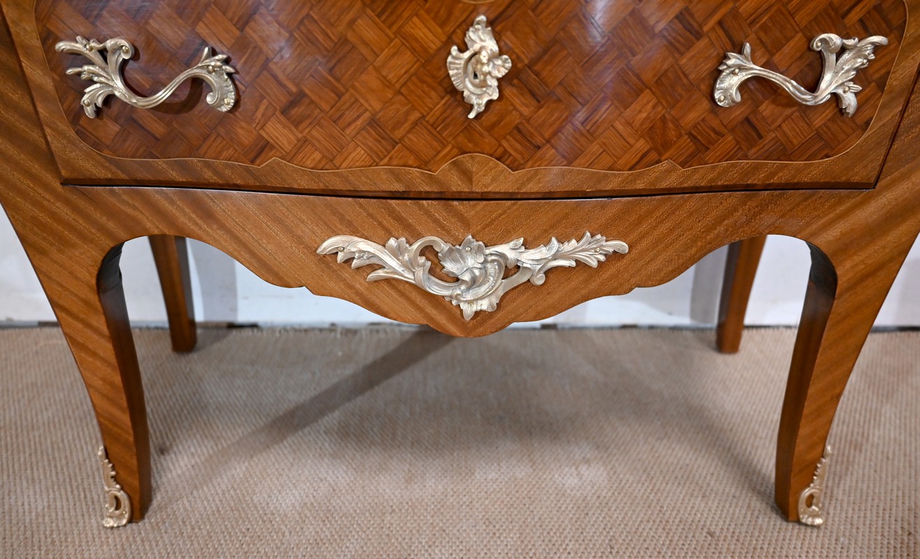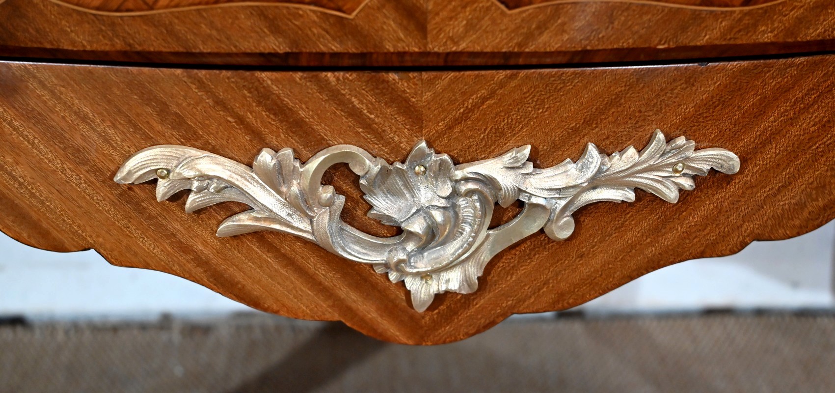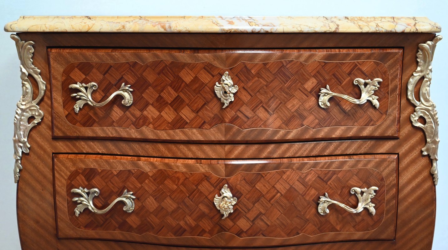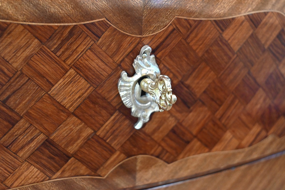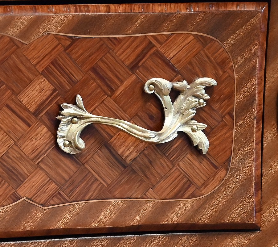 Les côtés sont galbés et ventrus dans le même esprit de marqueterie.