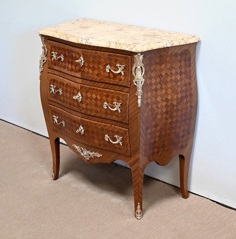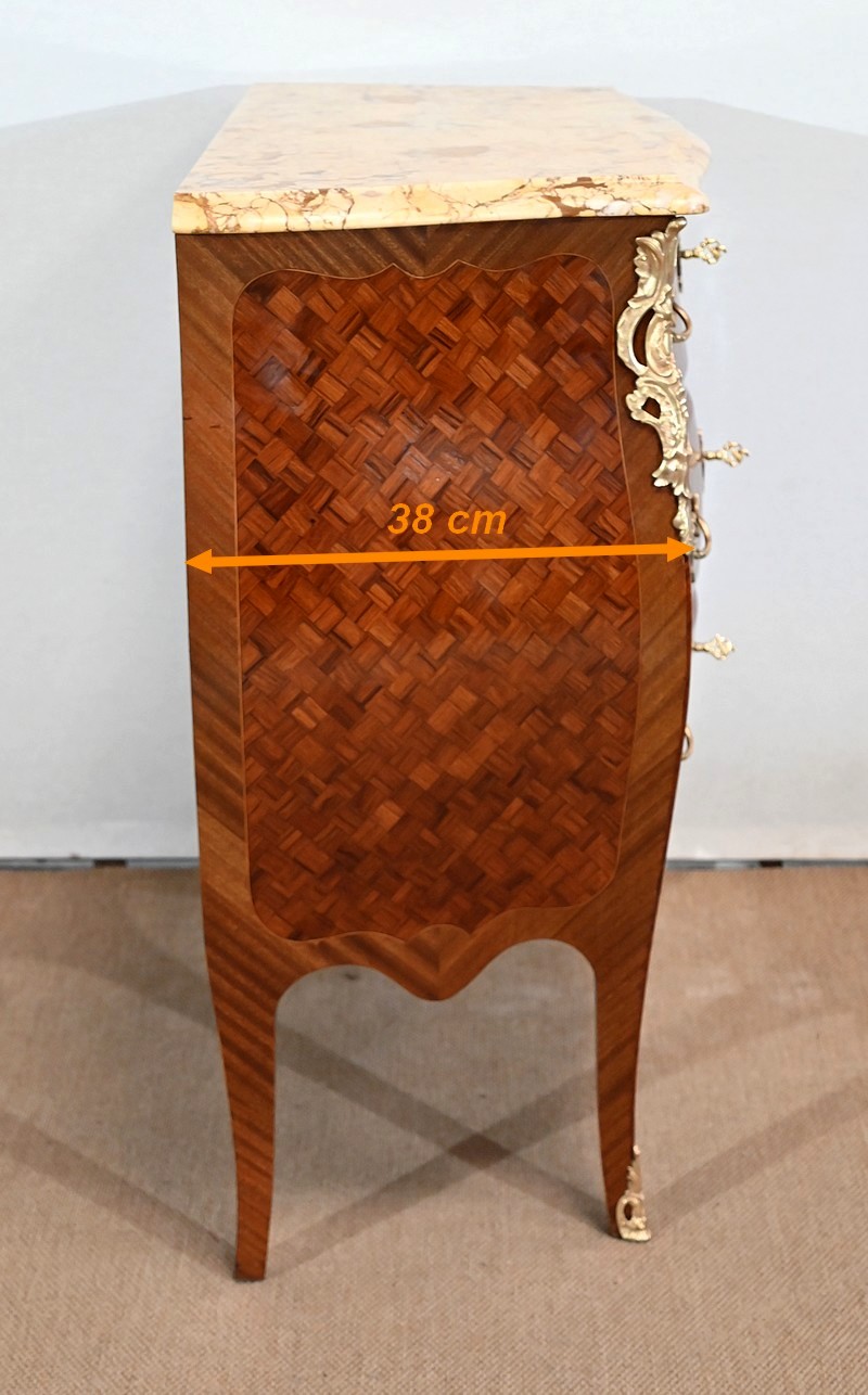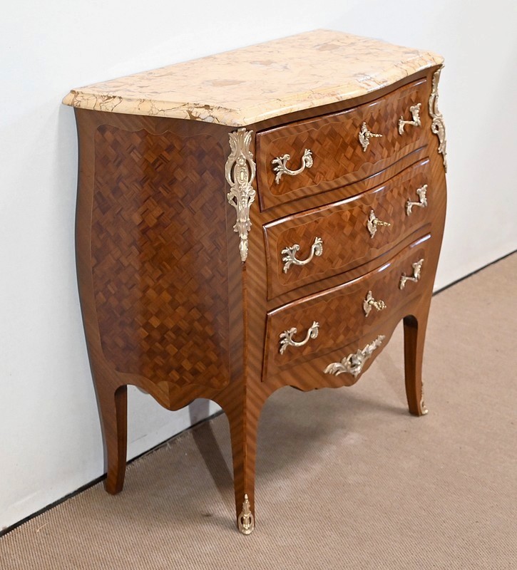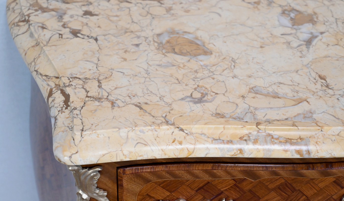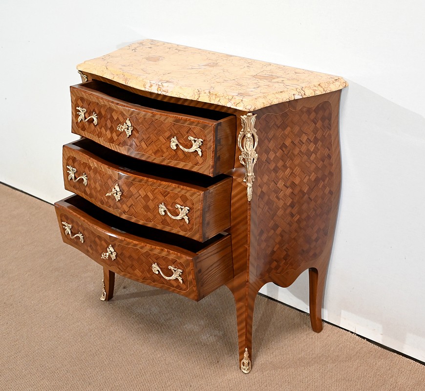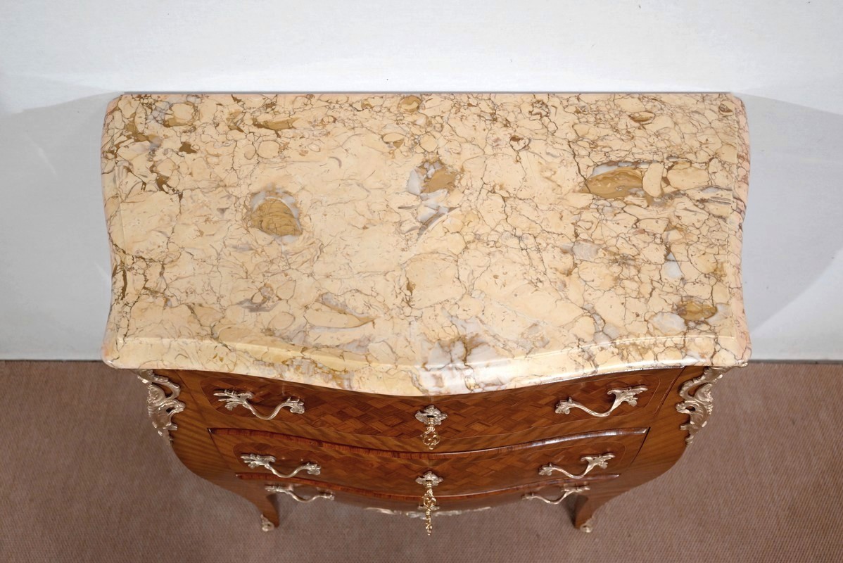 Petite commode en bois précieux, dotée d’une façade galbée et ventrue. Ce meuble est sommé d’un marbre brocatelle aux nuances jaune et Terre de Sienne à l’arête moulurée en gorge et bec-de-corbin.