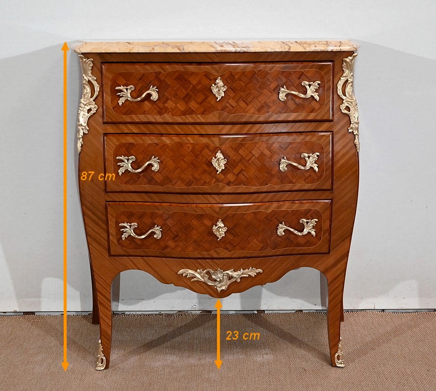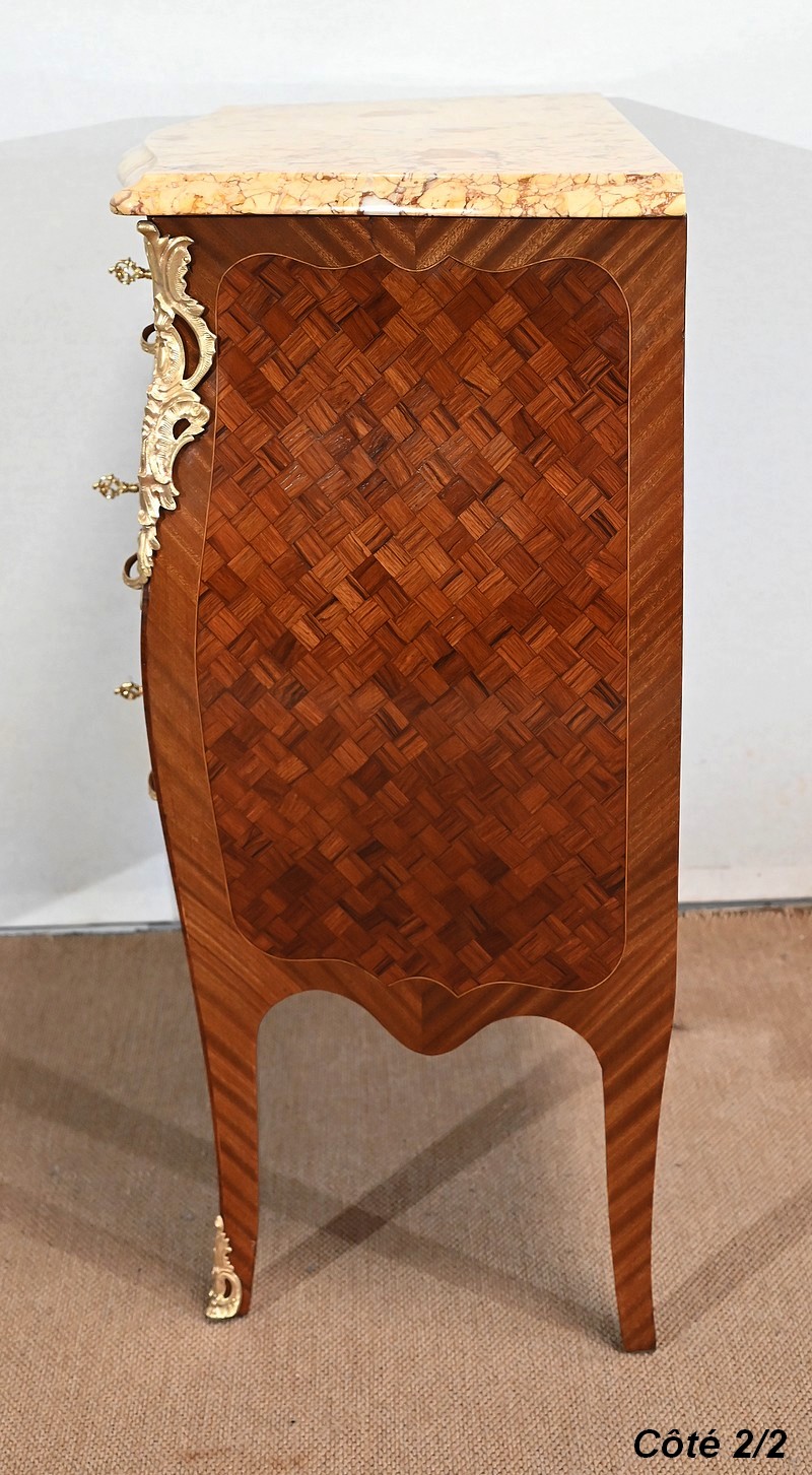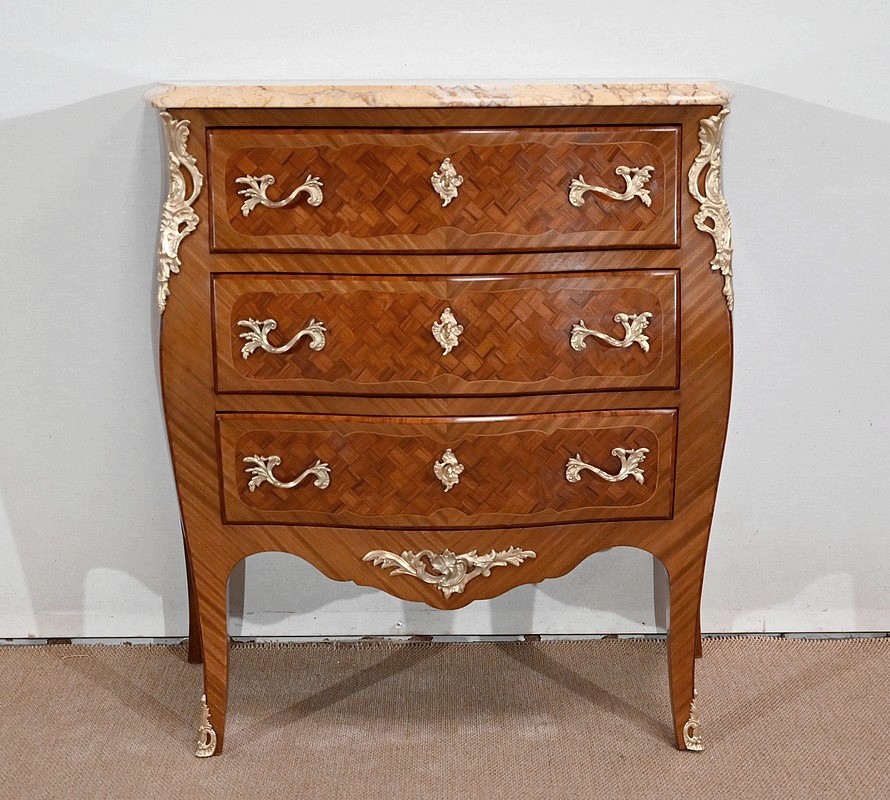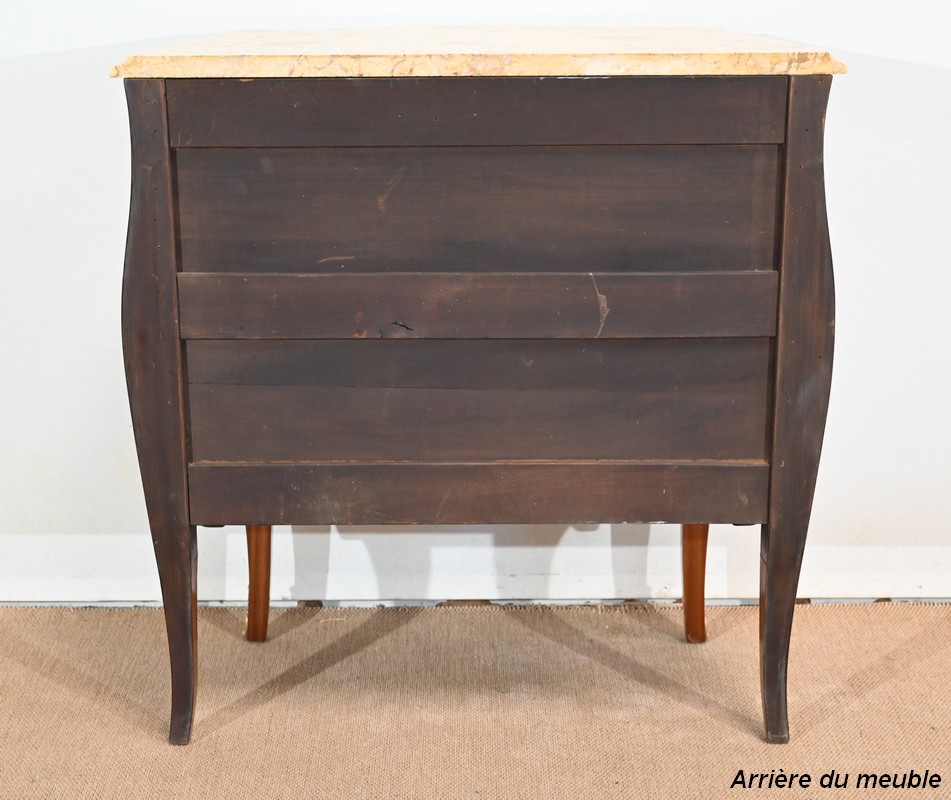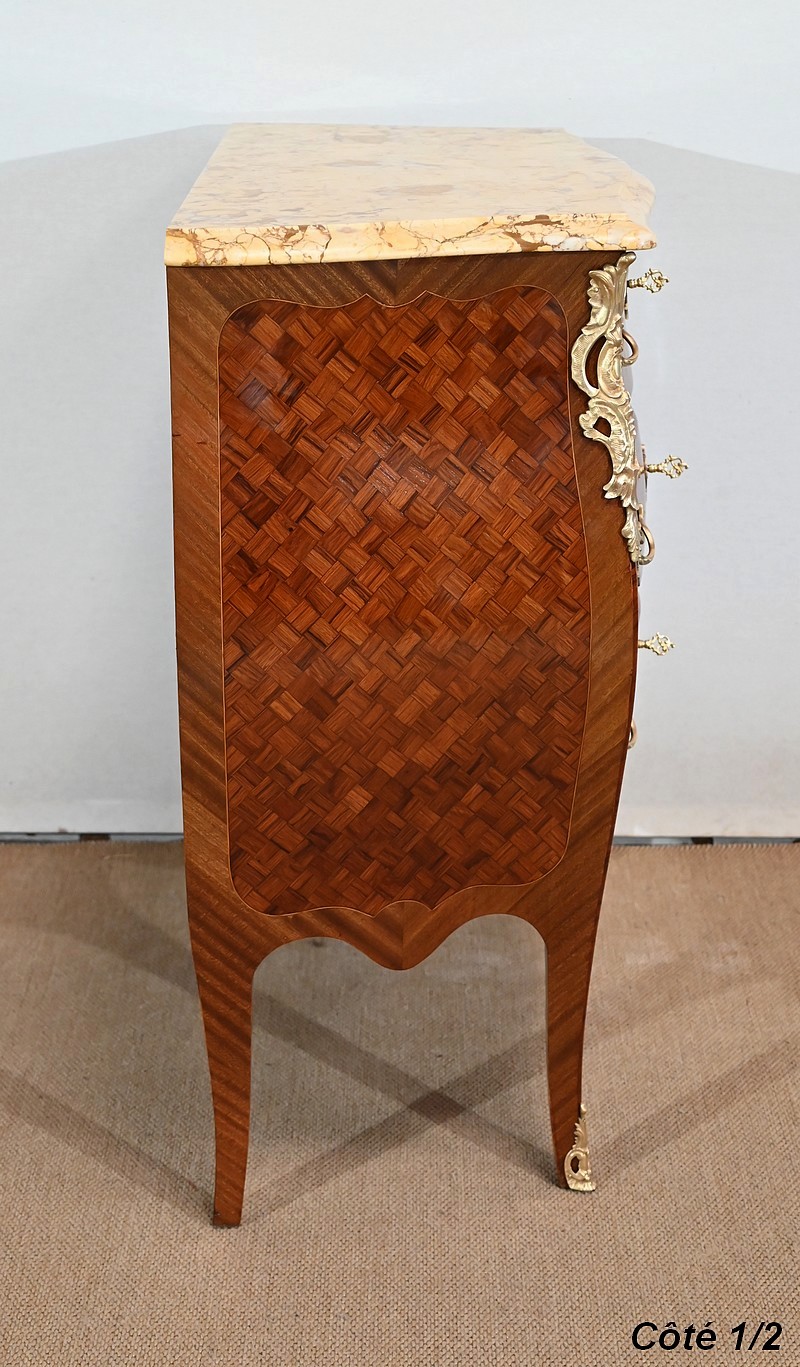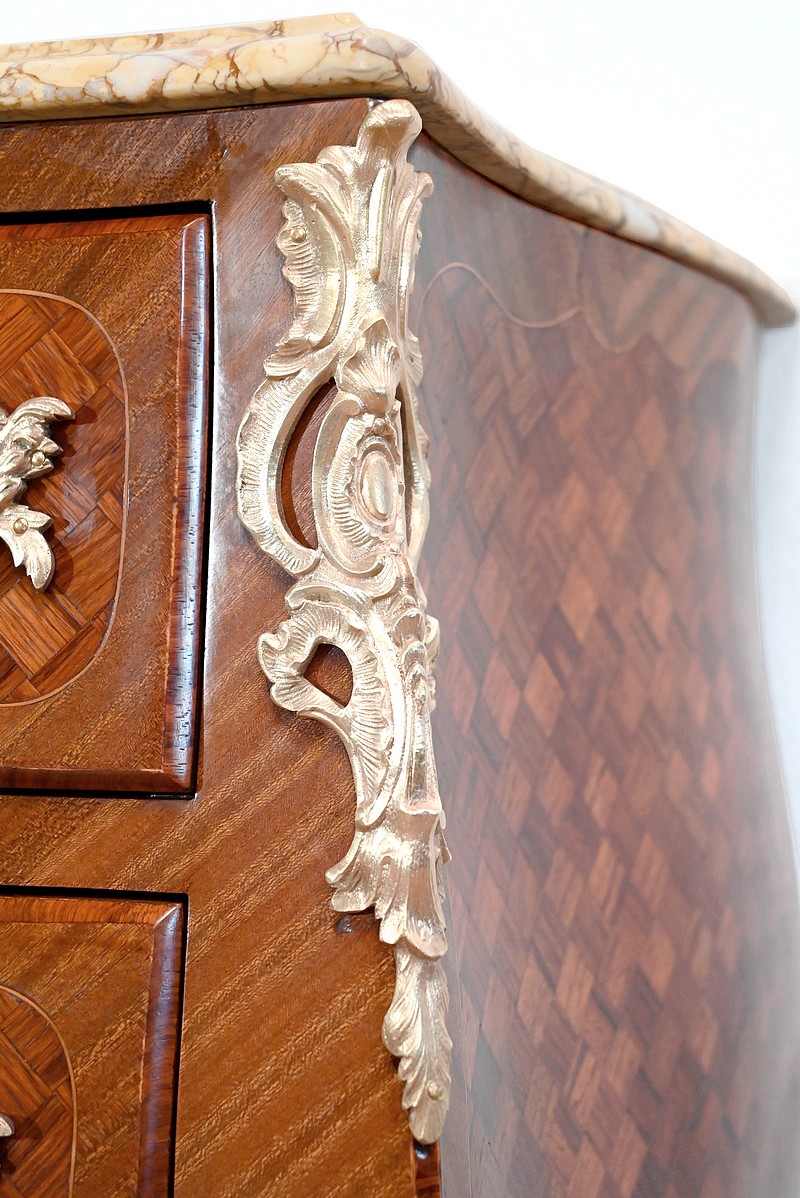 Petite commode en bois précieux, dotée d’une façade galbée et ventrue. Ce meuble est sommé d’un marbre brocatelle aux nuances jaune et Terre de Sienne à l’arête moulurée en gorge et bec-de-corbin.