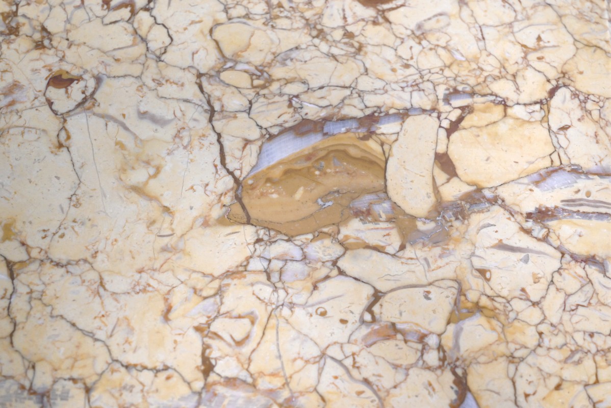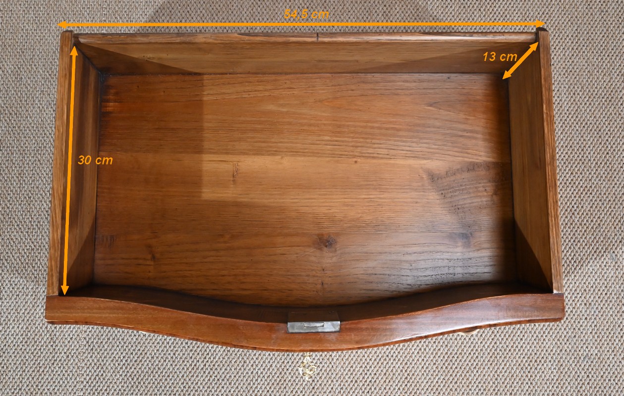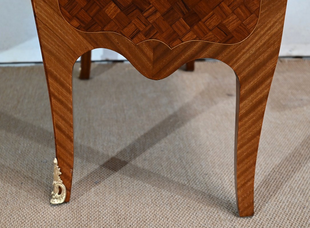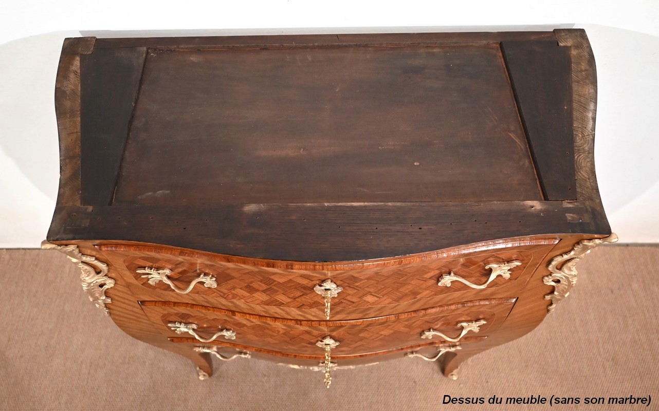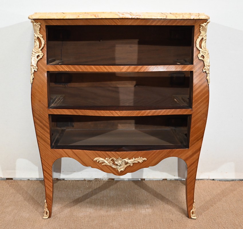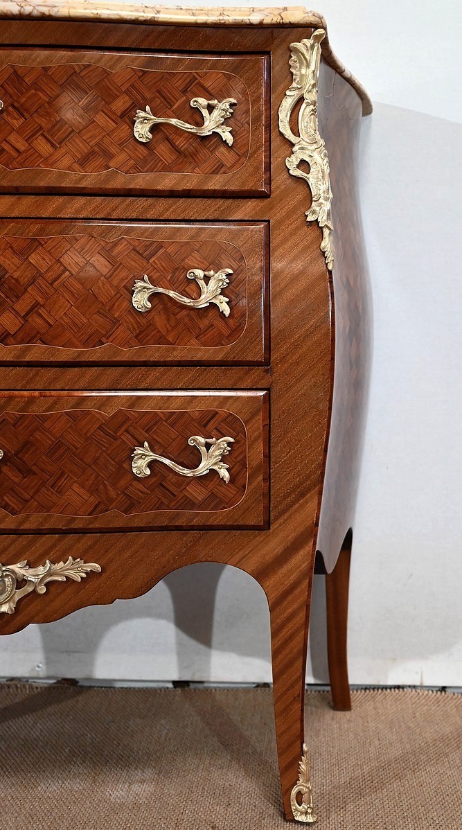 Petite commode en bois précieux, dotée d’une façade galbée et ventrue. Ce meuble est sommé d’un marbre brocatelle aux nuances jaune et Terre de Sienne à l’arête moulurée en gorge et bec-de-corbin.