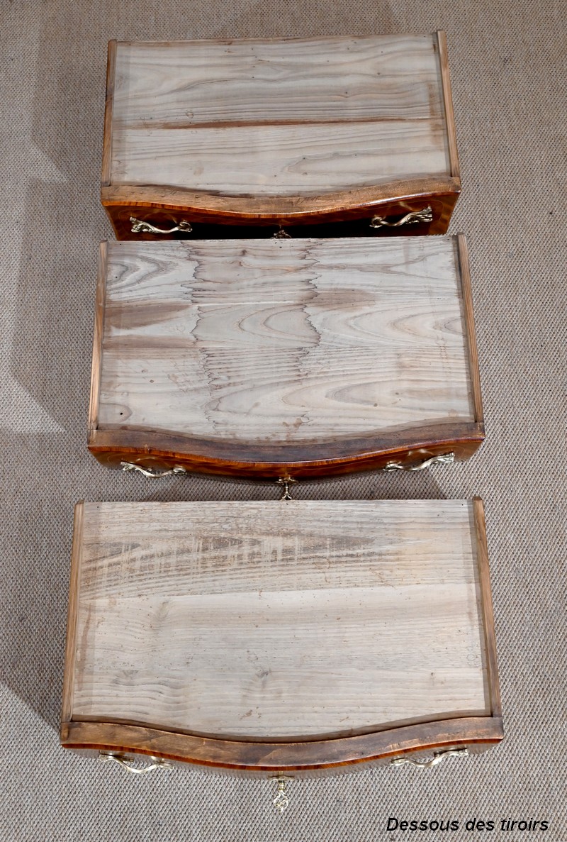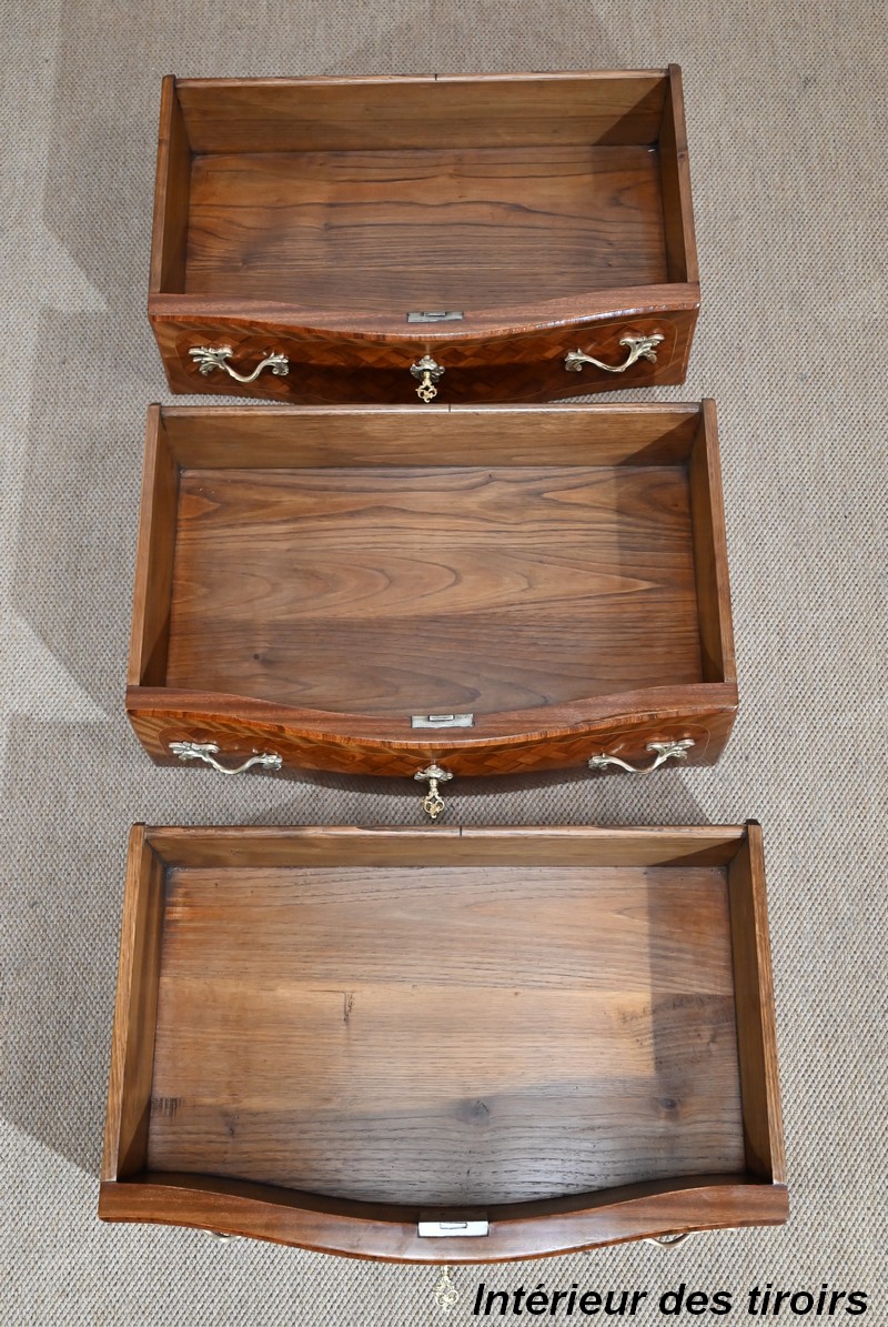 Ce mobilier est composé de trois tiroirs au pourtour en acajou satiné, offrant une marqueterie géométrique de bois de violette et filet de citronnier, formée d’un enchevêtrement de carrés parfaitement proportionnés. Chaque tiroir est agrémenté de deux poignées en miroir et d’une entrée, toutes en bronze, et accompagnées de serrures fonctionnelles d’origine et de leurs clés.