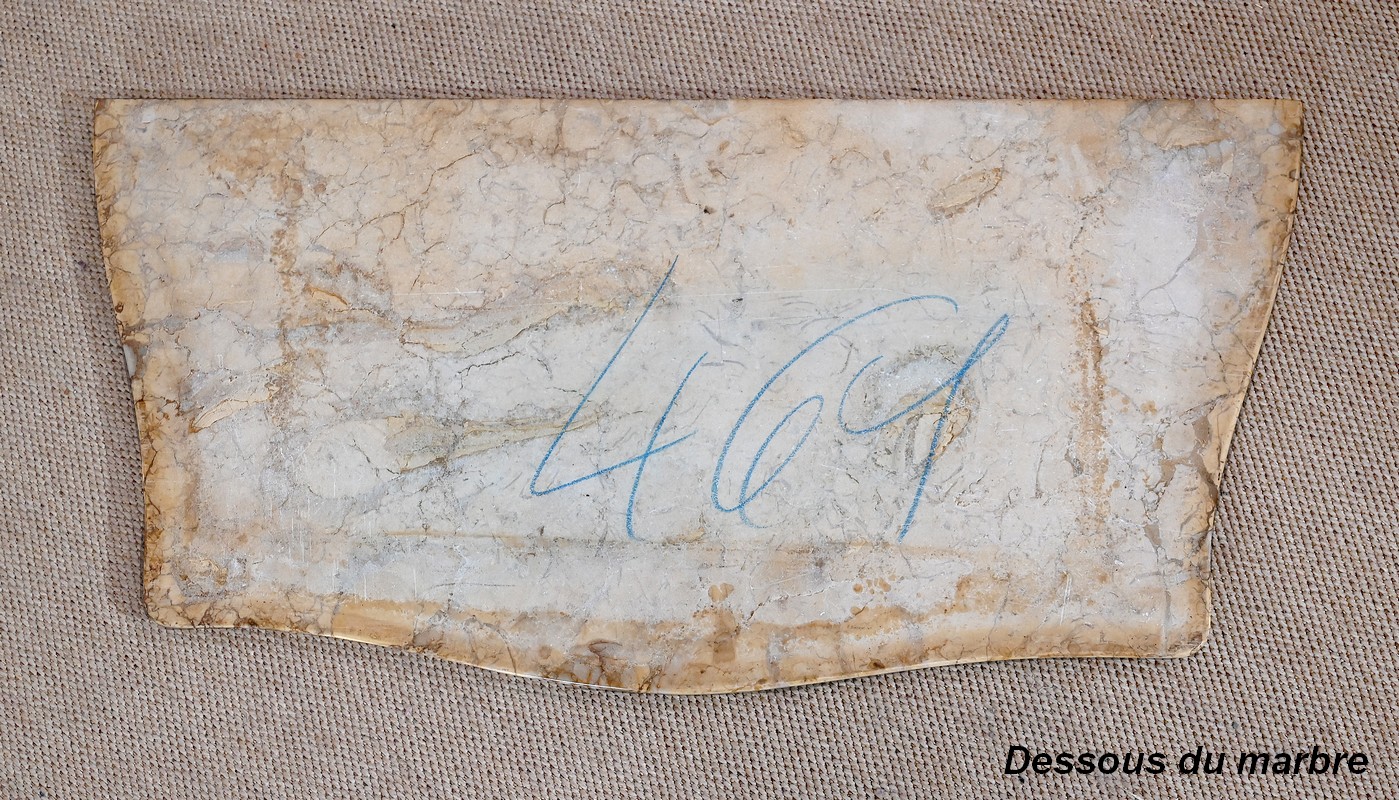 Les montants, ventrus, sont ornés d’une chute en partie supérieure et se terminent par un pied sabot bronze.