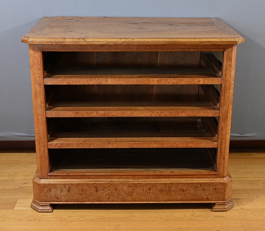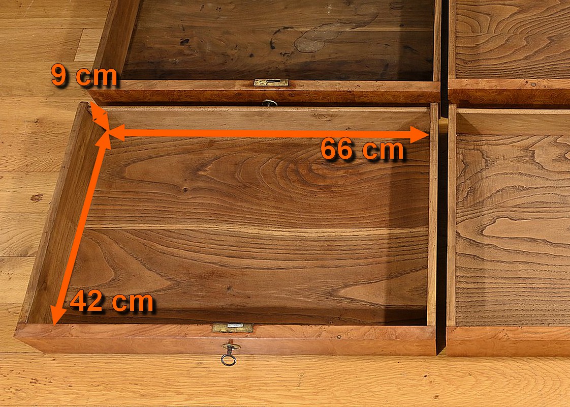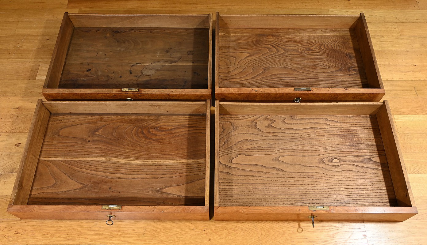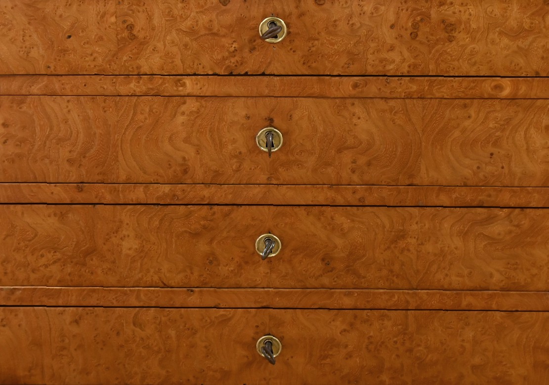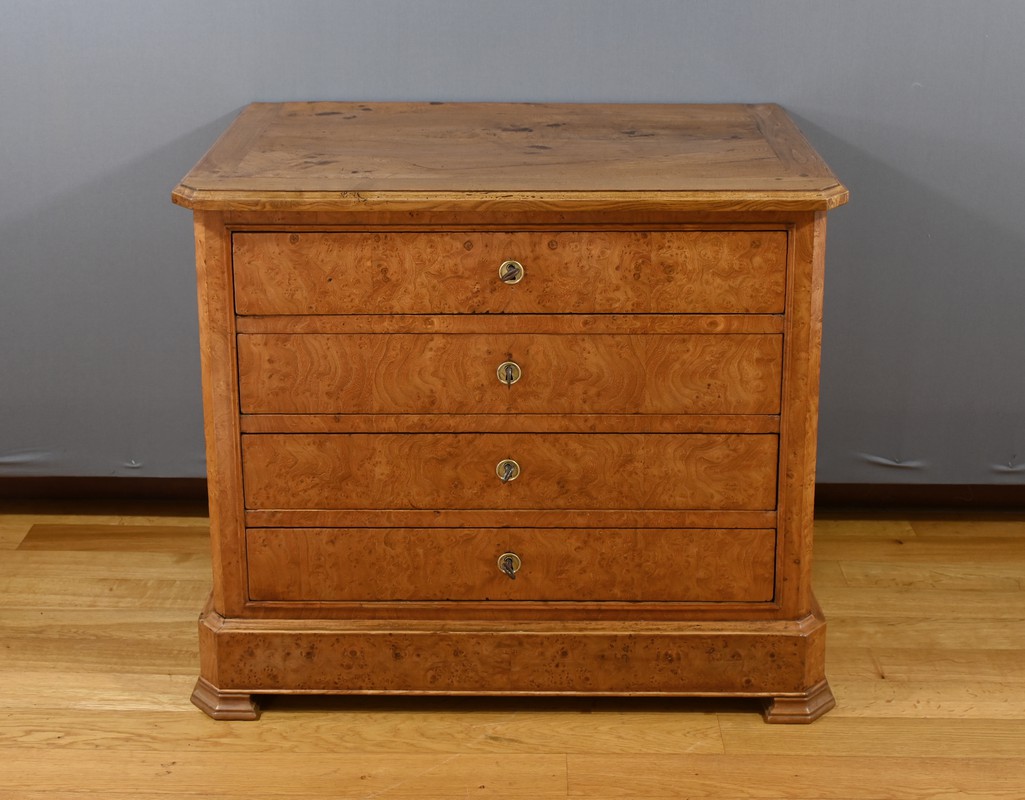 Cette commode en frêne massif et placage de loupe de frêne, datant du XIXe siècle, est une pièce de mobilier rare par sa petite dimension. Le dessus constitué de planches bien jointives est mouluré dans son pourtour et possède des angles à pans coupés à l’avant. Elle s’ouvre par 4 tiroirs identiques, chacun équipé d’une clé avec des entrées rondes en laiton ciselé. Les serrures sont fonctionnelles. Les montants de cette commode sont à pans coupés.