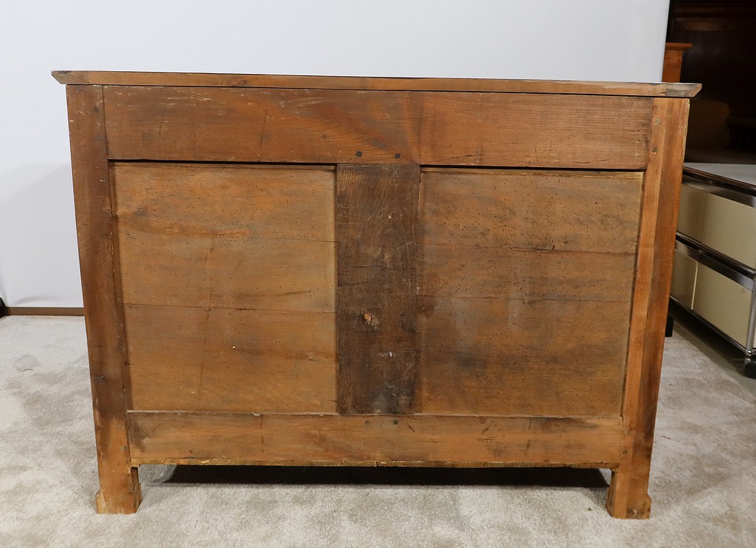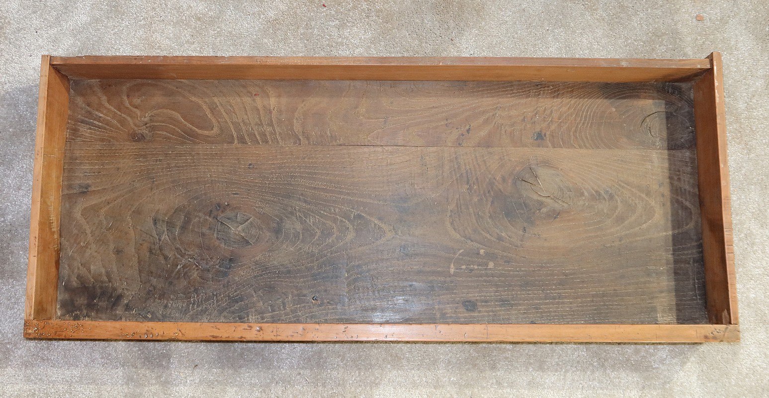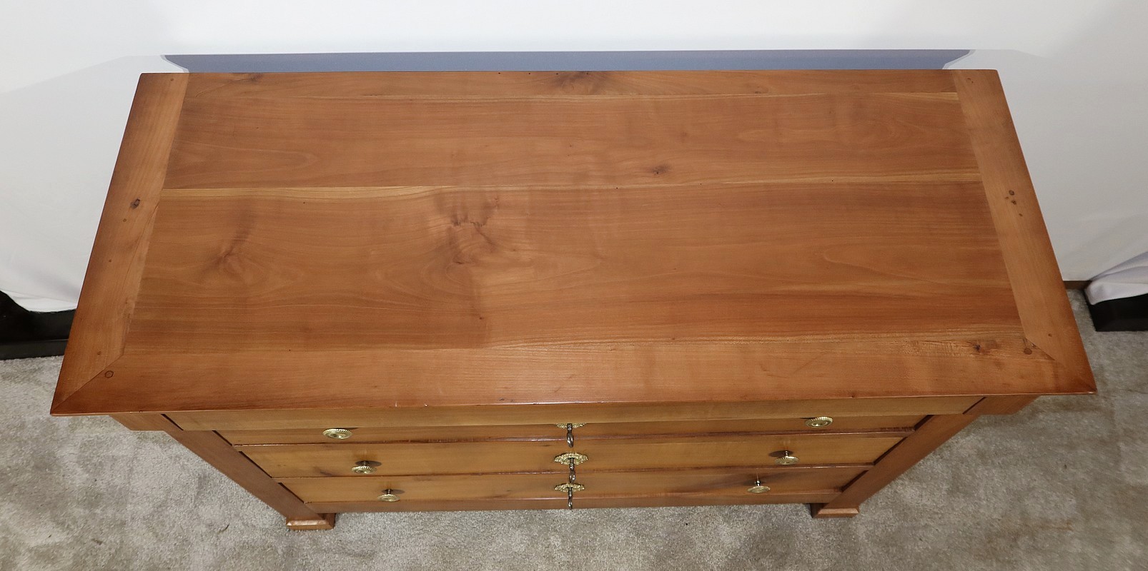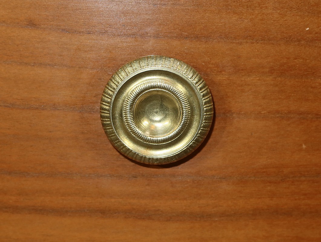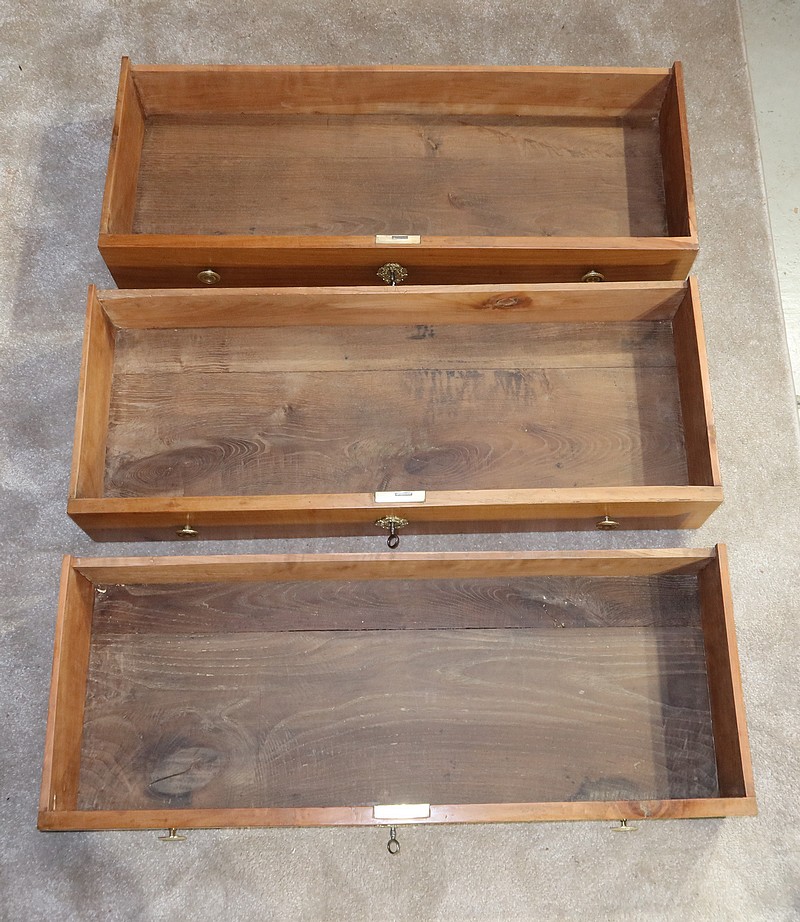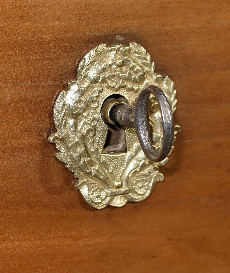 Ce mobilier comporte un tiroir en ceinture et en débord, se tirant par une gorge au dessous. En retrait, trois tiroirs identiques avec deux boutons en bronze ciselé de forme cuvette permettent l’ouverture. Au milieu de chaque tiroir, une entrée en bronze accompagne une serrure d’origine en état de fonctionnement avec trois clés rapportées et ajustées.