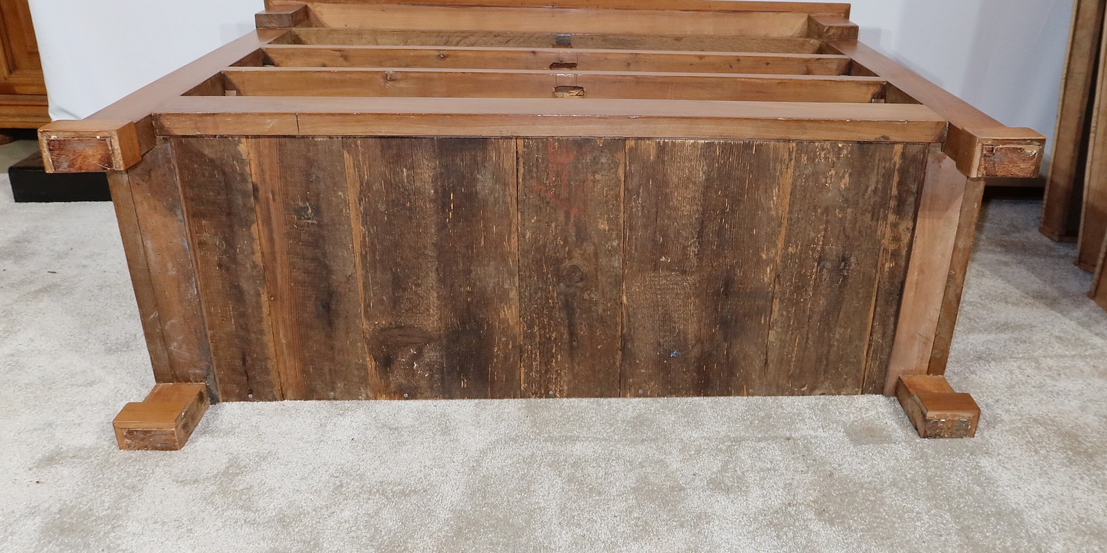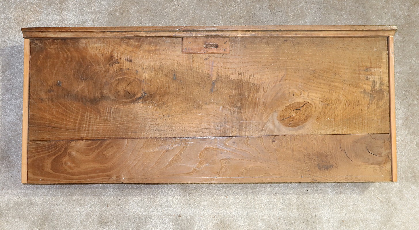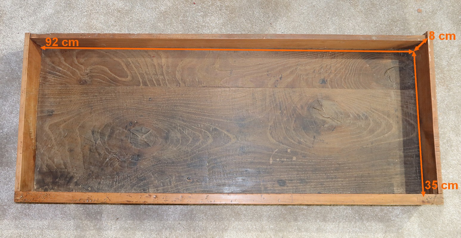 Enfin, le dessus est muni d’un encadrement à coupe d’onglet fonçé de panneaux bien jointifs. Il possède également un pourtour avec biseau au dessous.