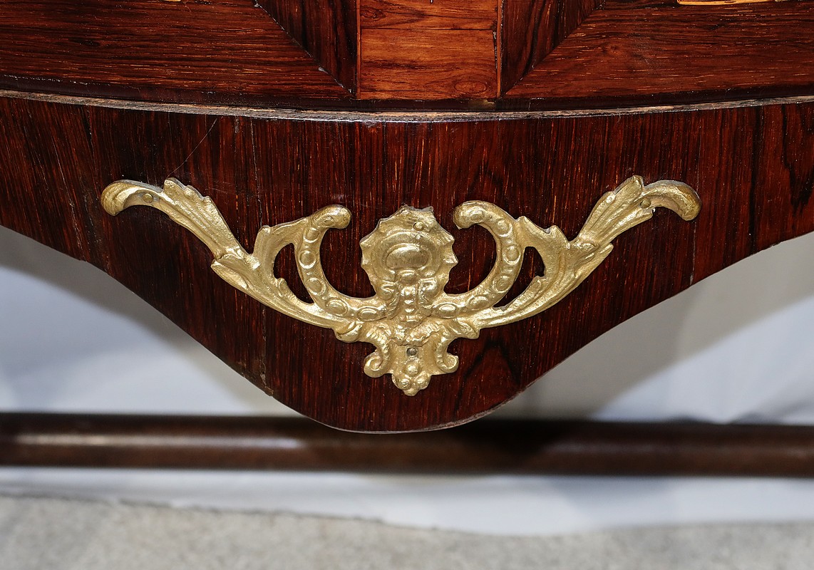 Sous les tiroirs, une traverse mouvementée est agrémentée d’une belle garniture en bronze doré.