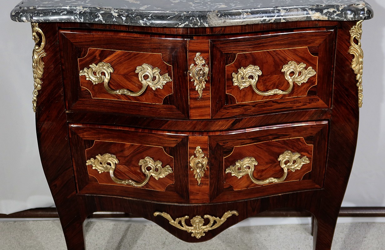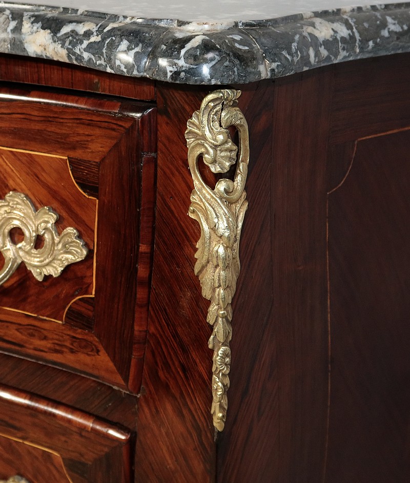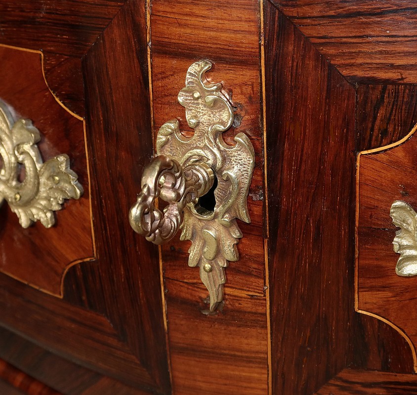 Cette commode à mouvements, comporte deux hauts tiroirs dont la façade galbée est marquetée, à ses deux extrémités, de bois de rose disposé en frise, entouré d’un filet de citronnier aux angles concaves, et encadré d’un pourtour en amarante. De chaque côté, d’importantes poignées de tirages d’origine en bronze sculpté, sont accompagnées d’une entrée de serrure feuillagée en bronze d’origine également. La clé, postérieure au XVIIIe siècle, est en état de fonctionnement.