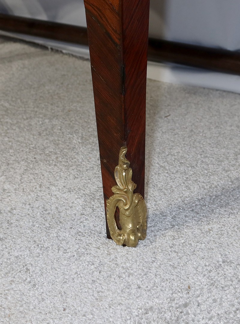 De chaque côté, des pieds ventrus en placage d’amarante sont décorés d’une chute en bronze en partie haute et d’un sabot en bronze en partie basse.
