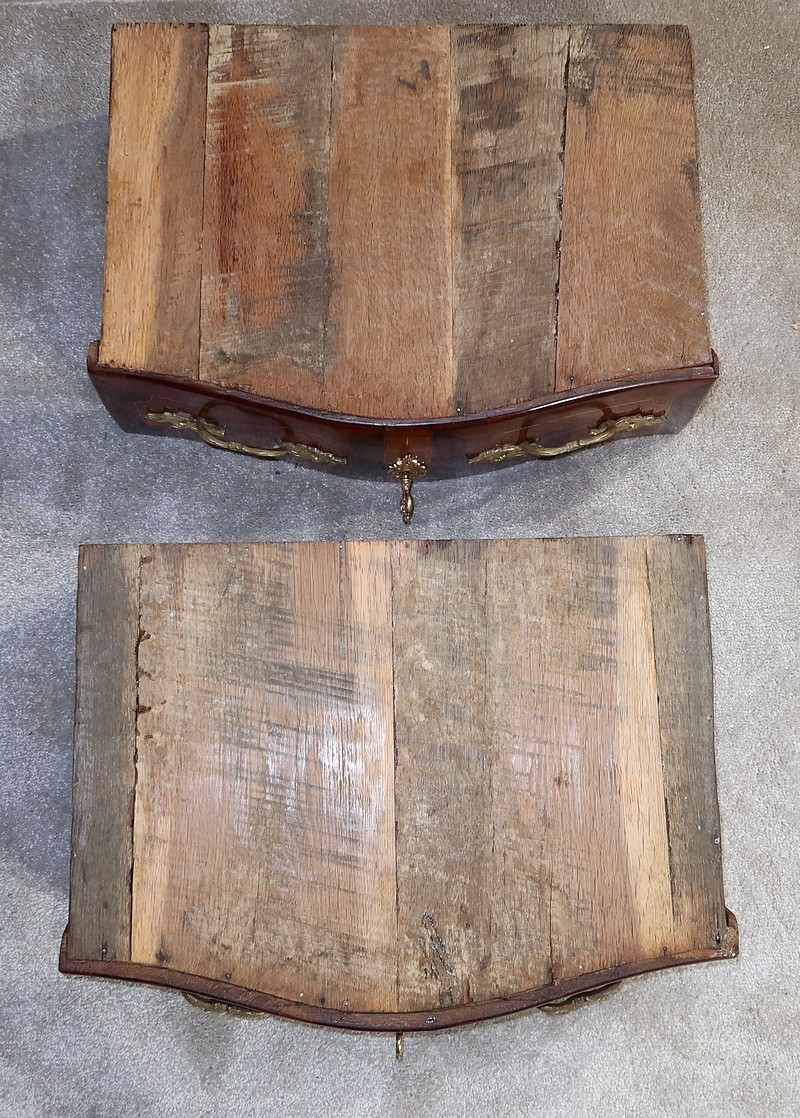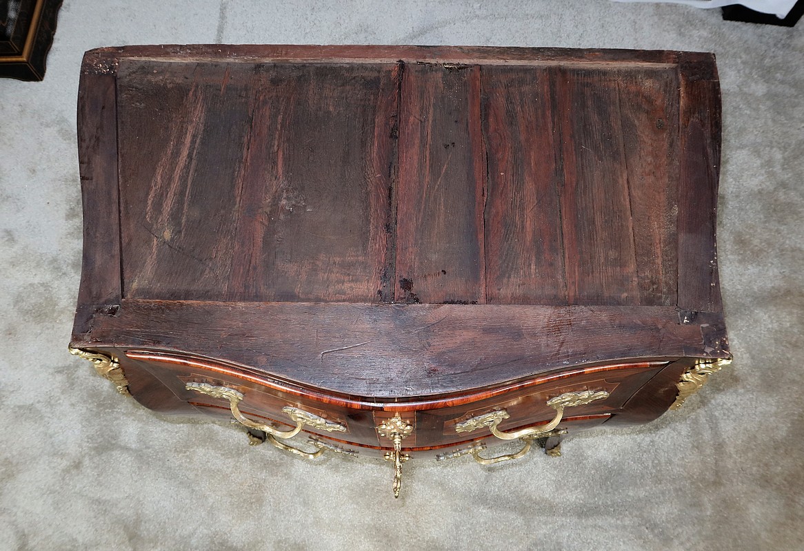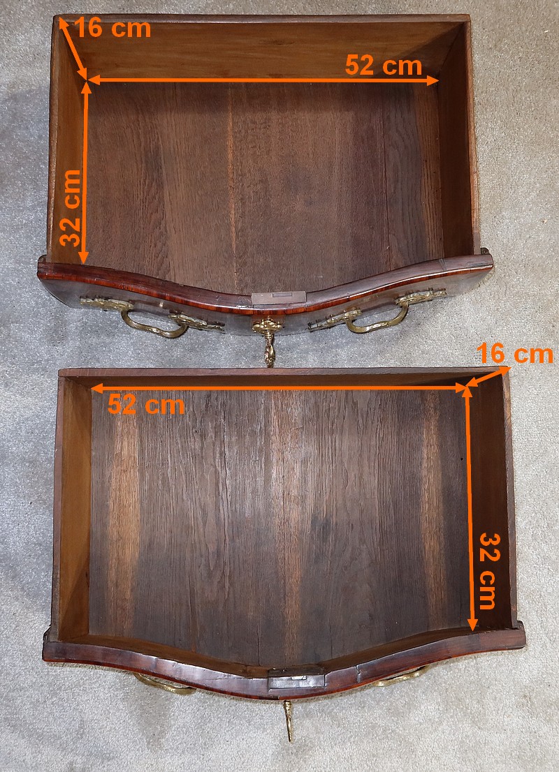 Les fonds et côtés de tiroirs ainsi que l’arrière de la commode sont en chêne. Nous retrouvons un cache-poussière entre les tiroirs.