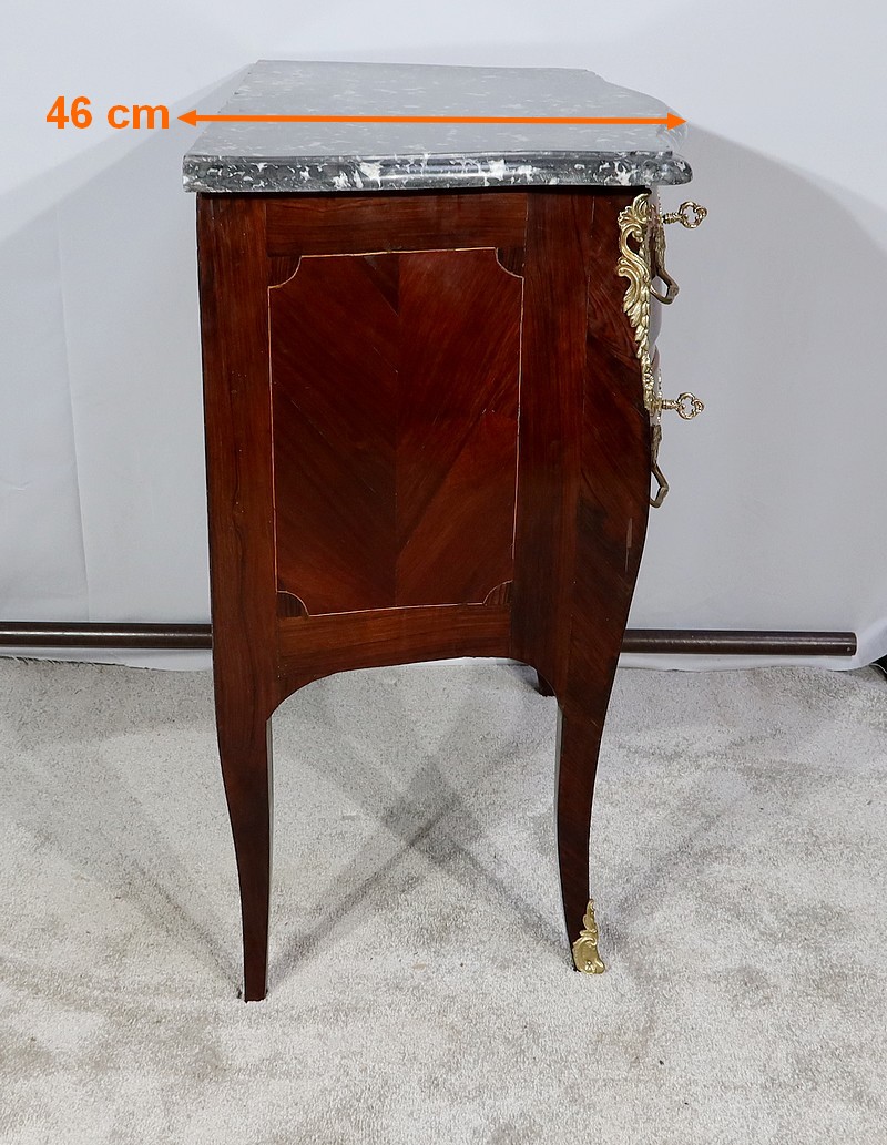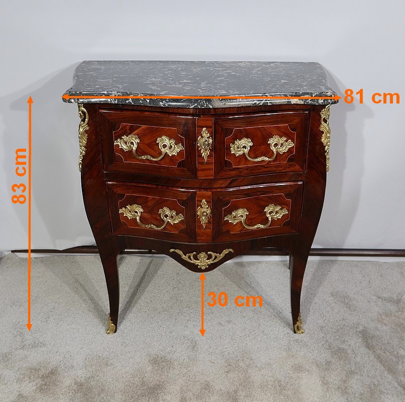 Raffinée et élégante, cette commode de qualité parisienne, vous ravira par ses ornementations de bronze doré à décor feuillagé, ses formes sinueuses et son petit dimensionnel.