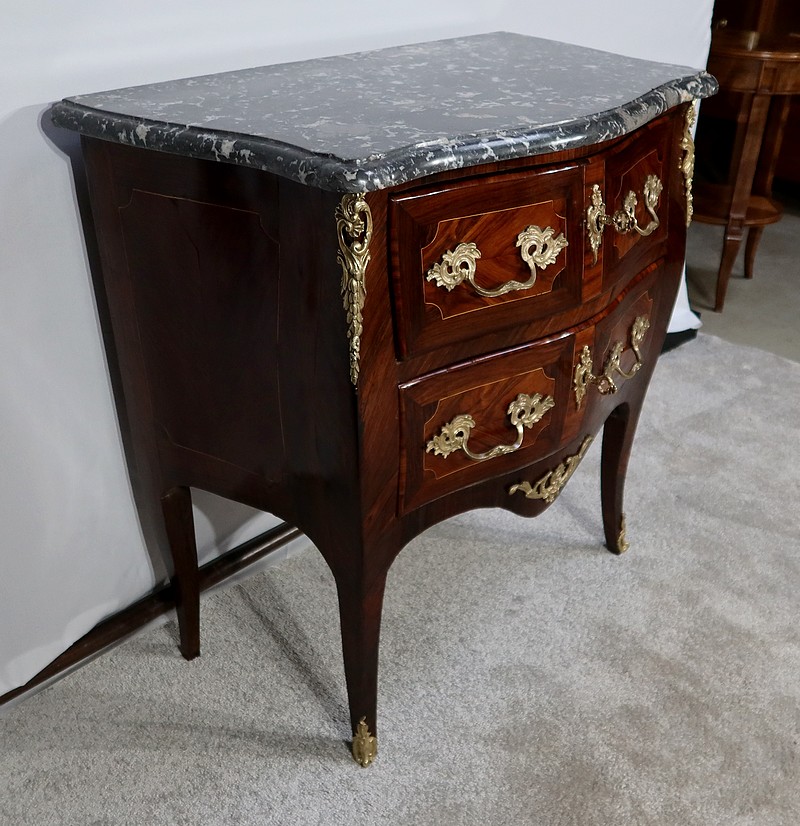 Magnifique commode « Tombeau » réalisée par un maître ébéniste parisien, en bois de rose, amarante, acajou et citronnier, agrémentée d’ornementations en bronze et sommée d’un épais Marbre gris Sainte Anne Belge. Ce marbre d’origine, entouré d’un bec de corbin, épouse parfaitement les formes du meuble.