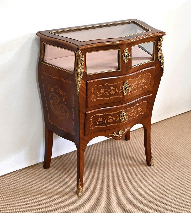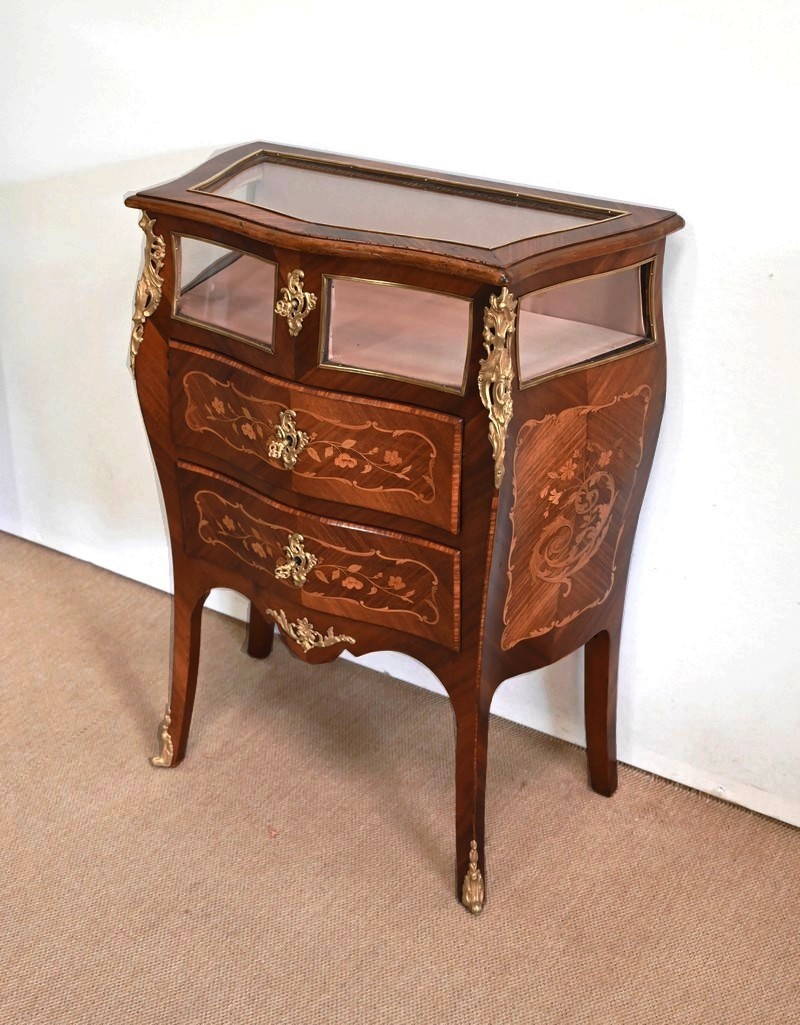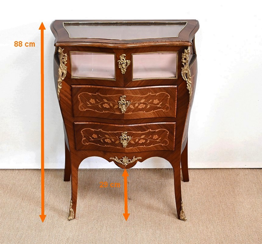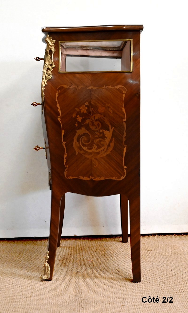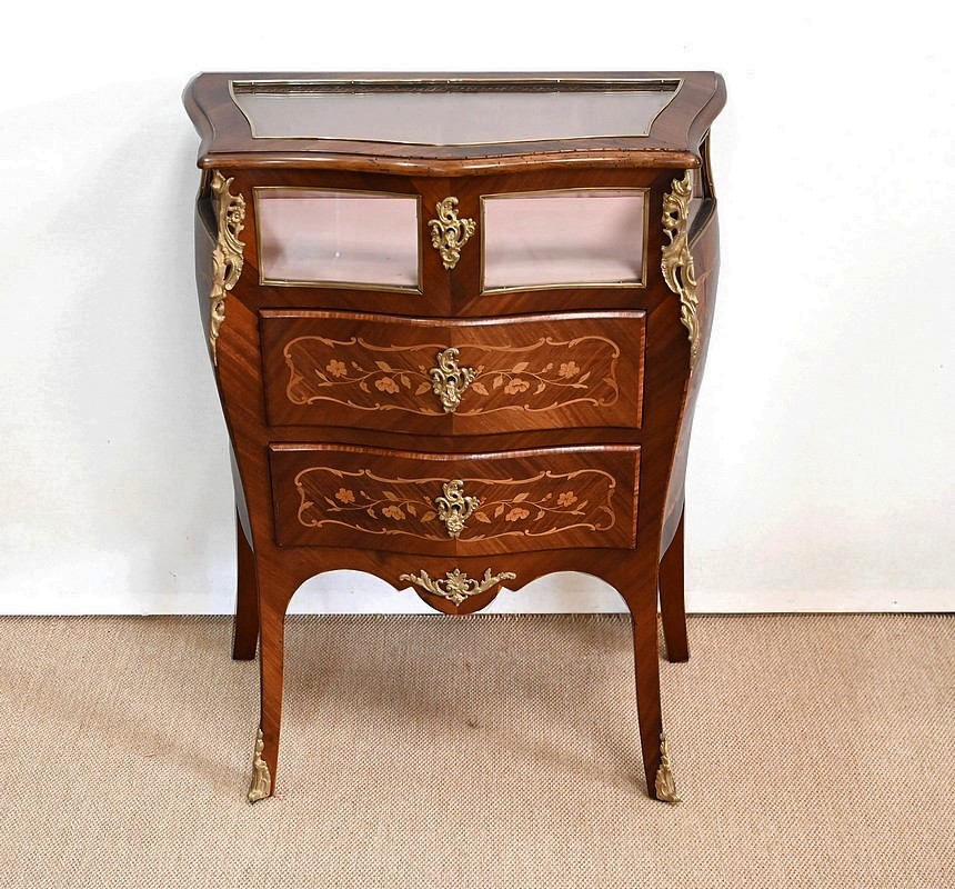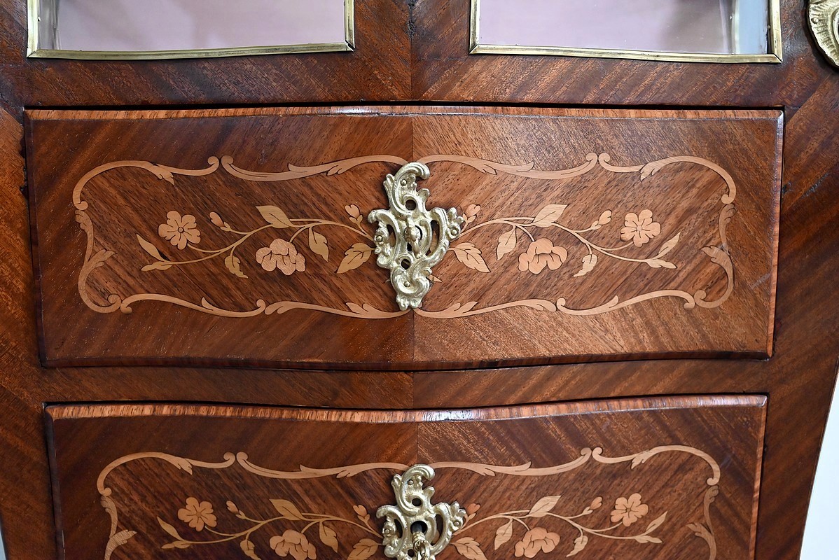 Élégante commode vitrine composée de deux tiroirs à façade galbée, en placage d’acajou et bois de violette avec incrustations représentant des feuillages, des fleurs, des rinceaux et des volutes. Ils sont munis d’entrées bronze et de serrures fonctionnelles, le tout d’origine.