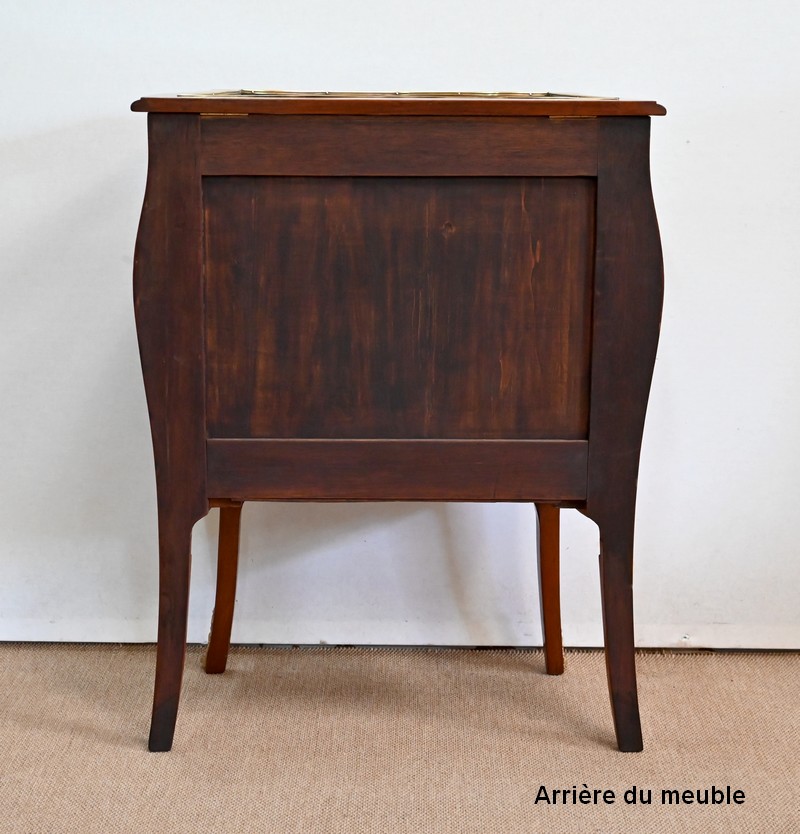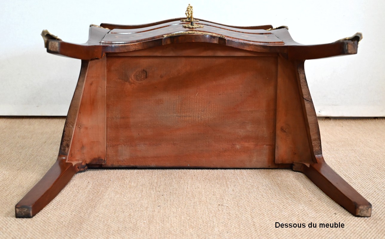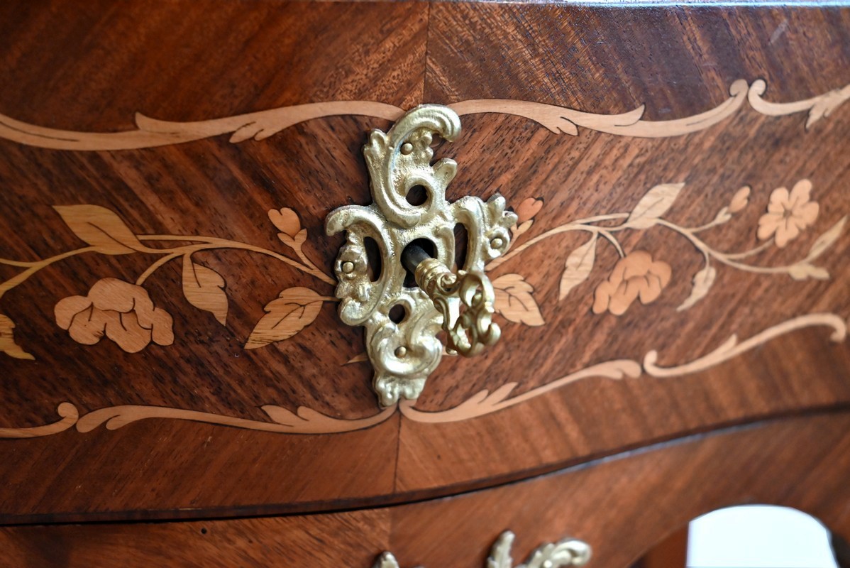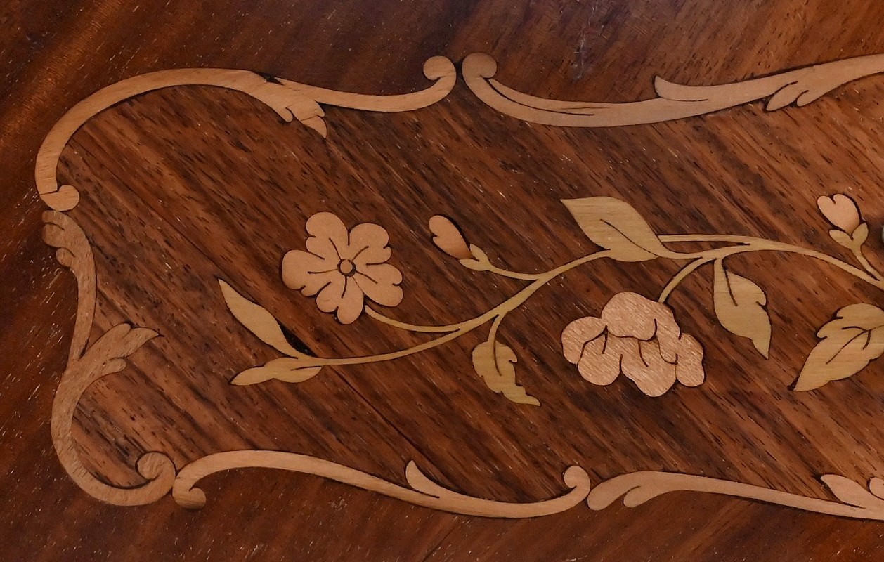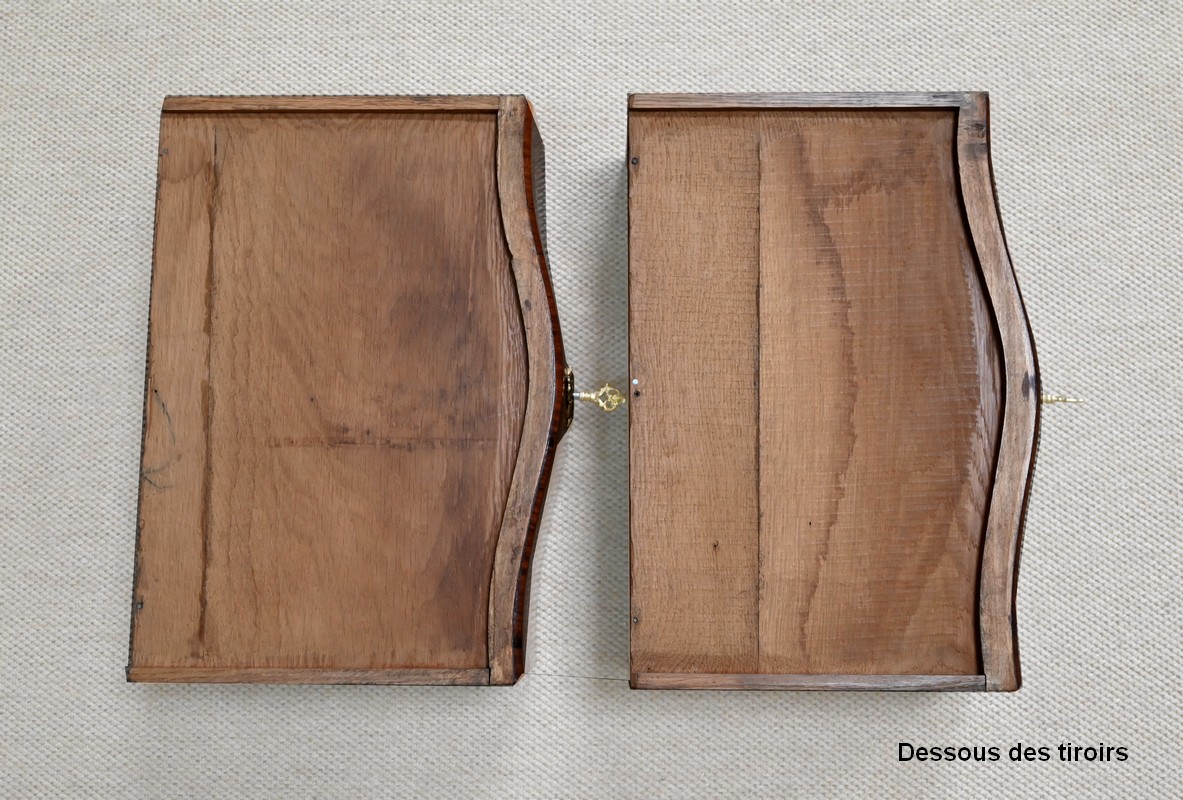 Les côtés de ce mobilier sont légèrement ventrus et s’élargissent vers l’arrière. Ils sont composés des mêmes marqueteries que la face avant.