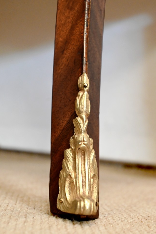 Les montants, légèrement galbés, sont habillés d’une chute en bronze en partie haute et se terminent en bas des pieds par un sabot bronze.