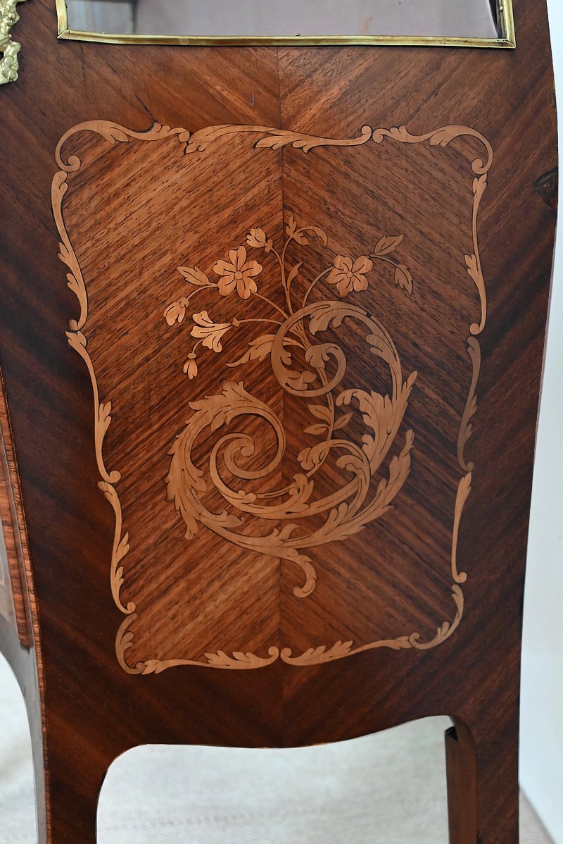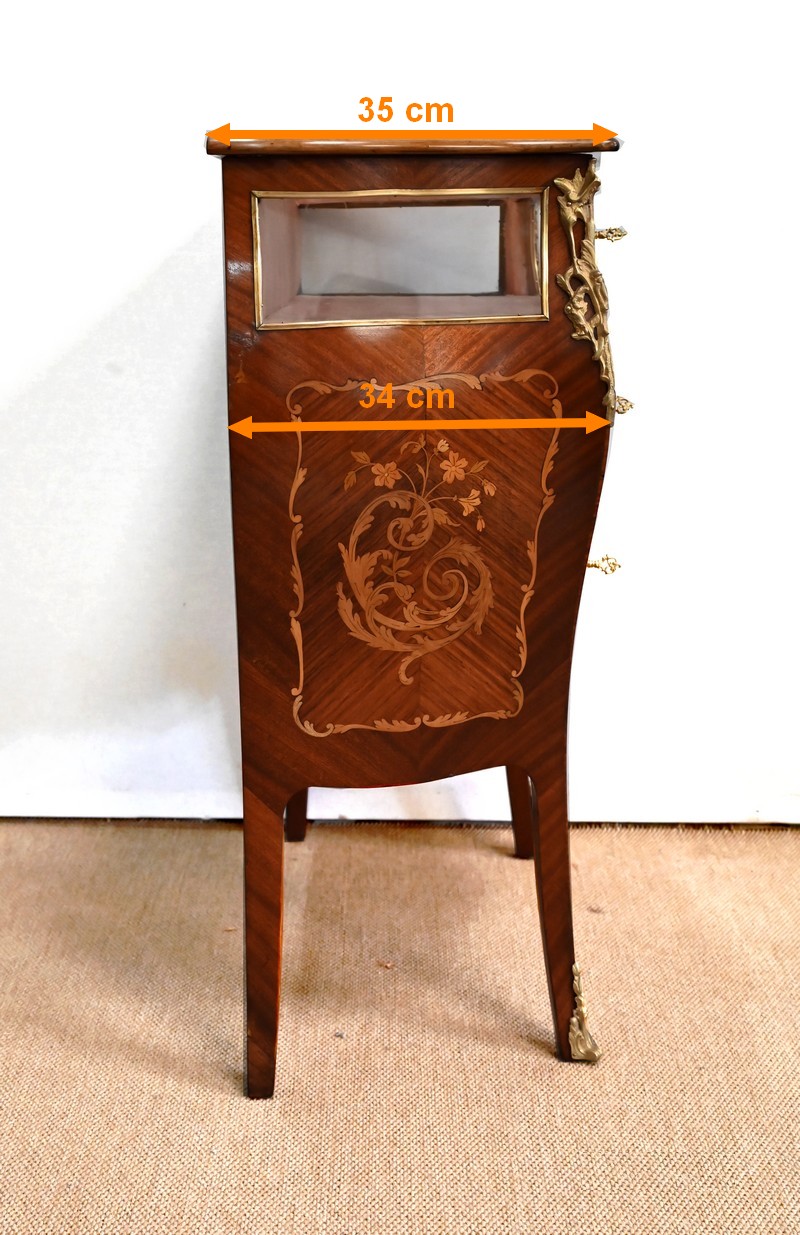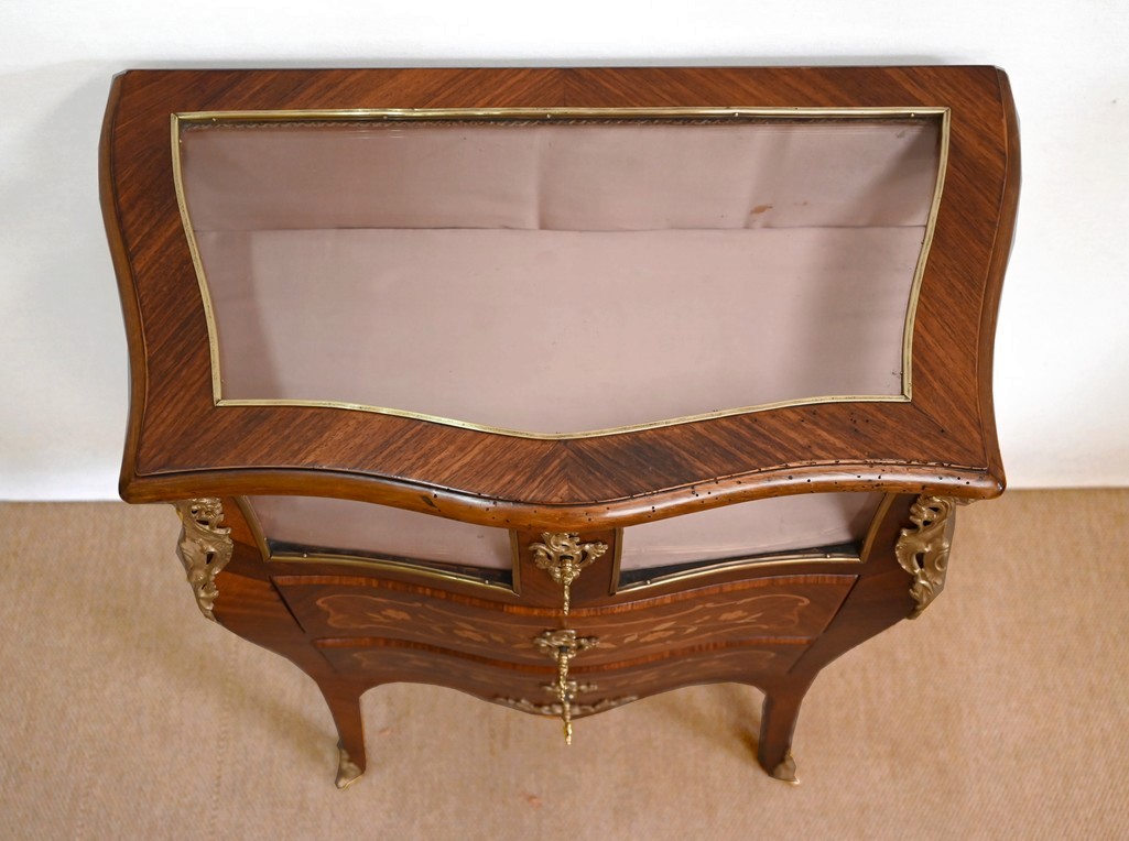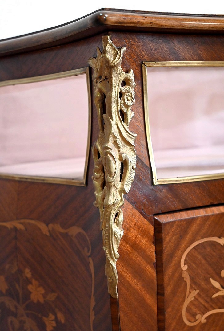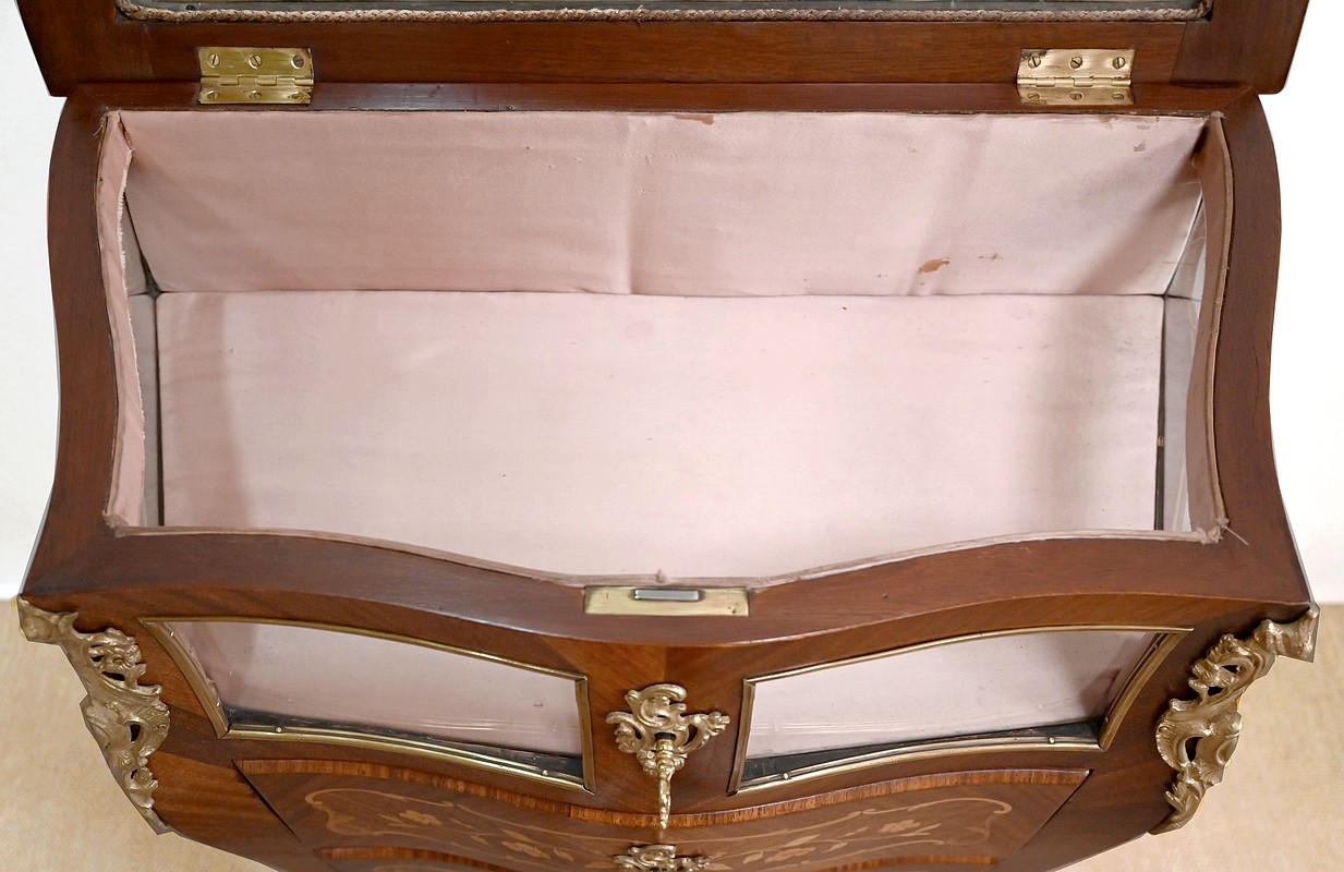 La partie supérieure est constituée de vitres entourées de baguettes laiton sur la façade, les cotés et le dessus. Ce dernier, a encadrement mouvementé en bois de violette s’ouvre sur un espace de présentation en tissu couleur vieux rose authentique. Cet abattant est équipé d’une serrure dite « à crochet » également d’origine.