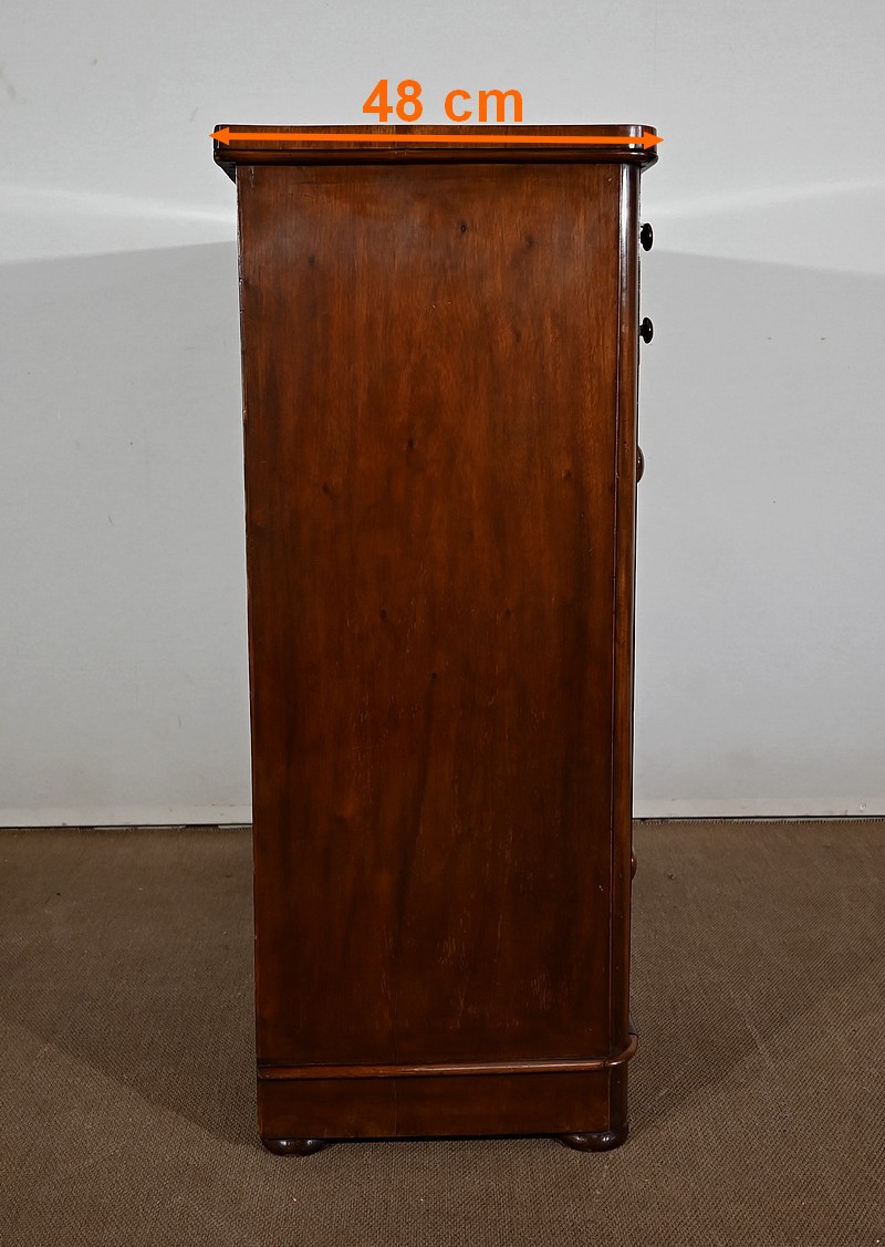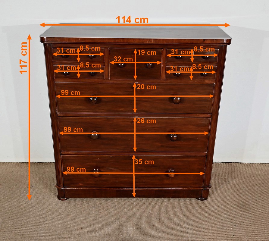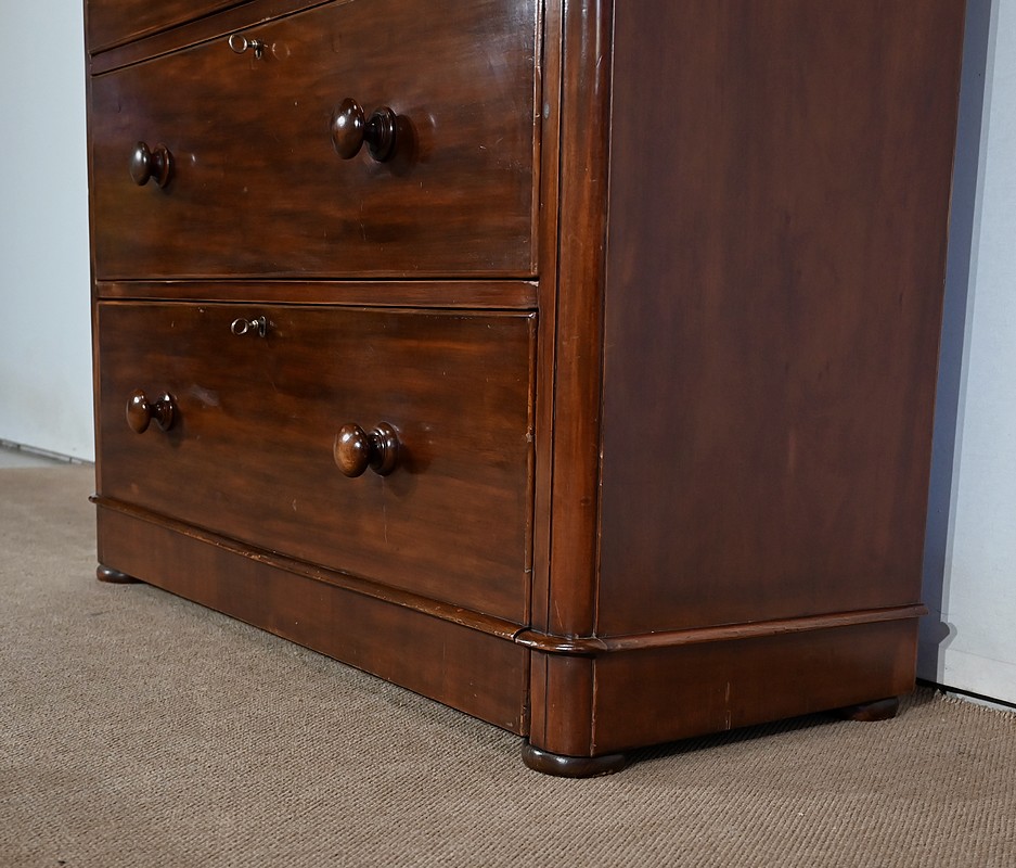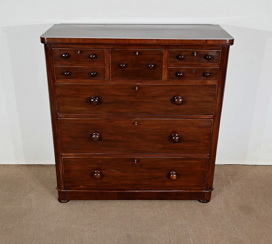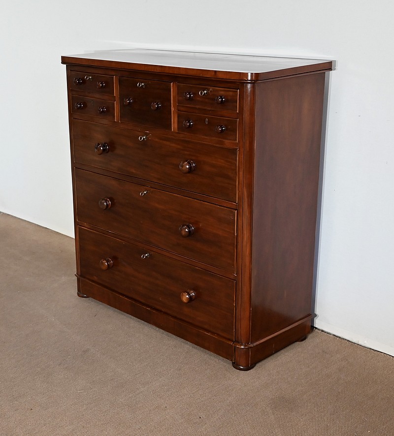 Haute commode anglaise victorienne en placage d’acajou, constituée de huit tiroirs sur quatre niveaux, fermant tous à clé.