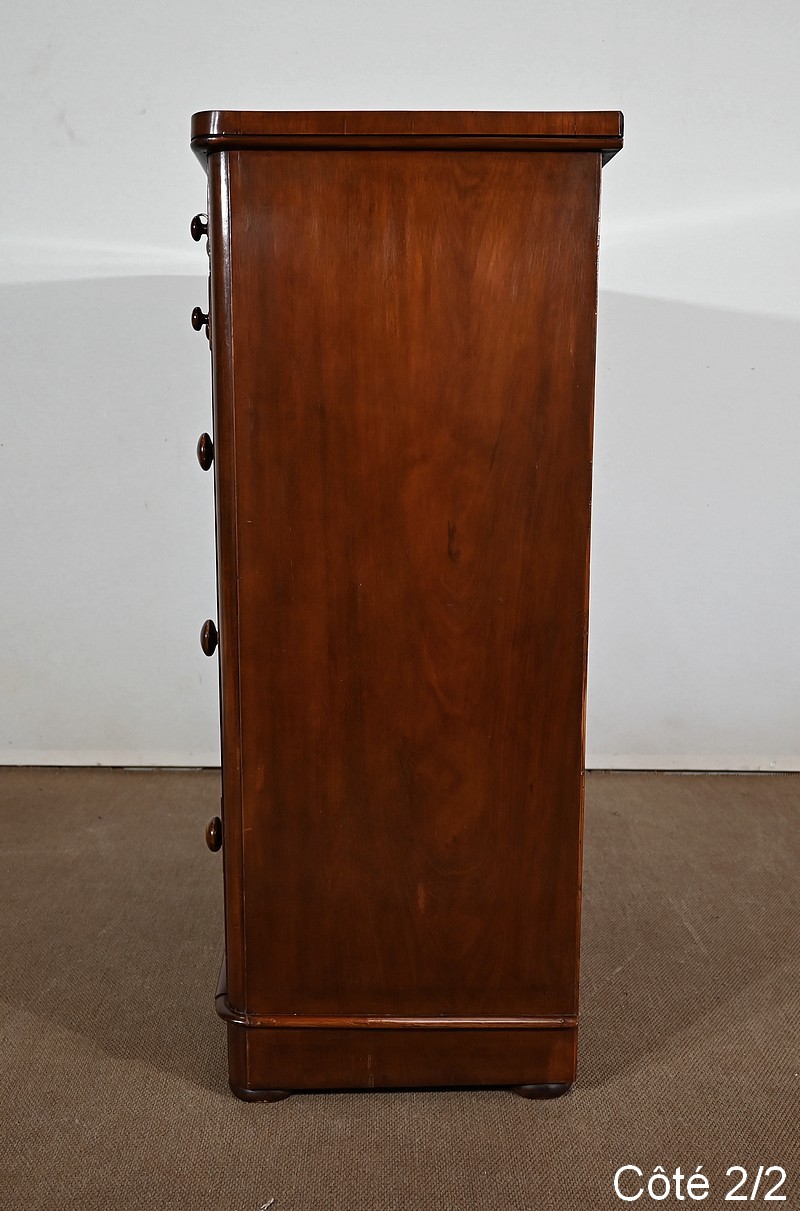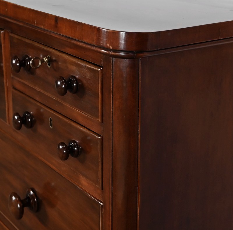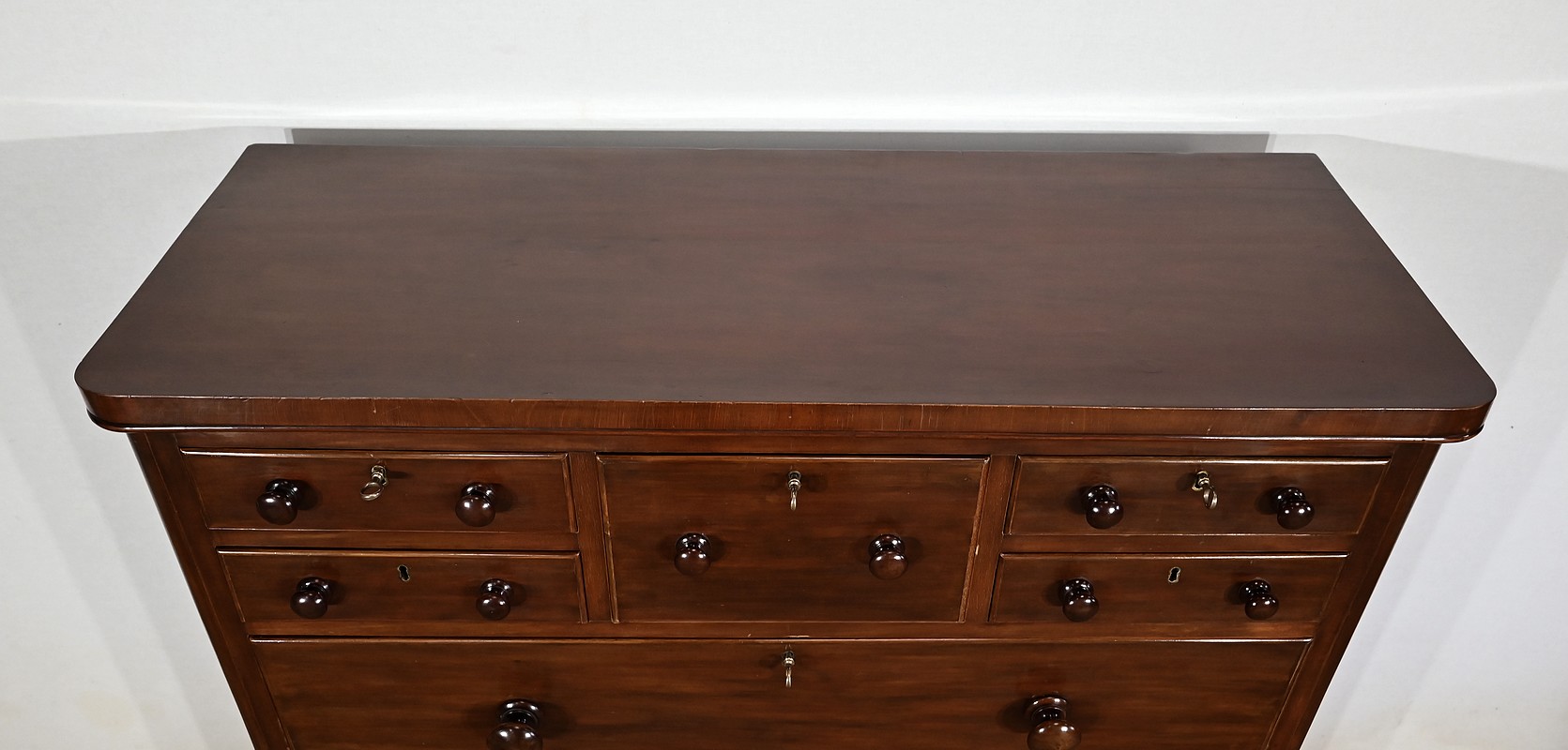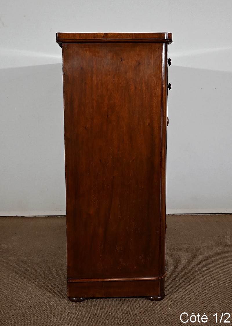 Haute commode anglaise victorienne en placage d’acajou, constituée de huit tiroirs sur quatre niveaux, fermant tous à clé.