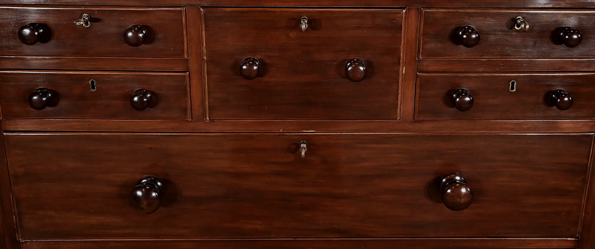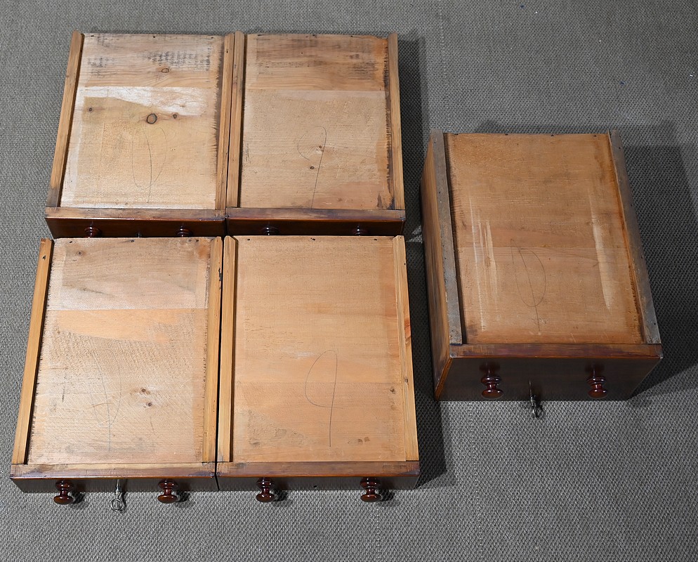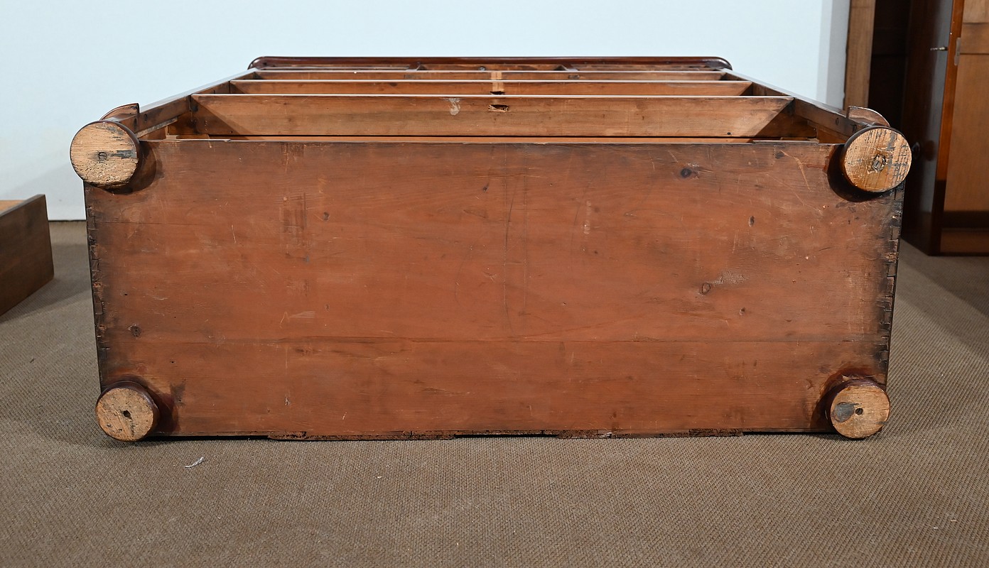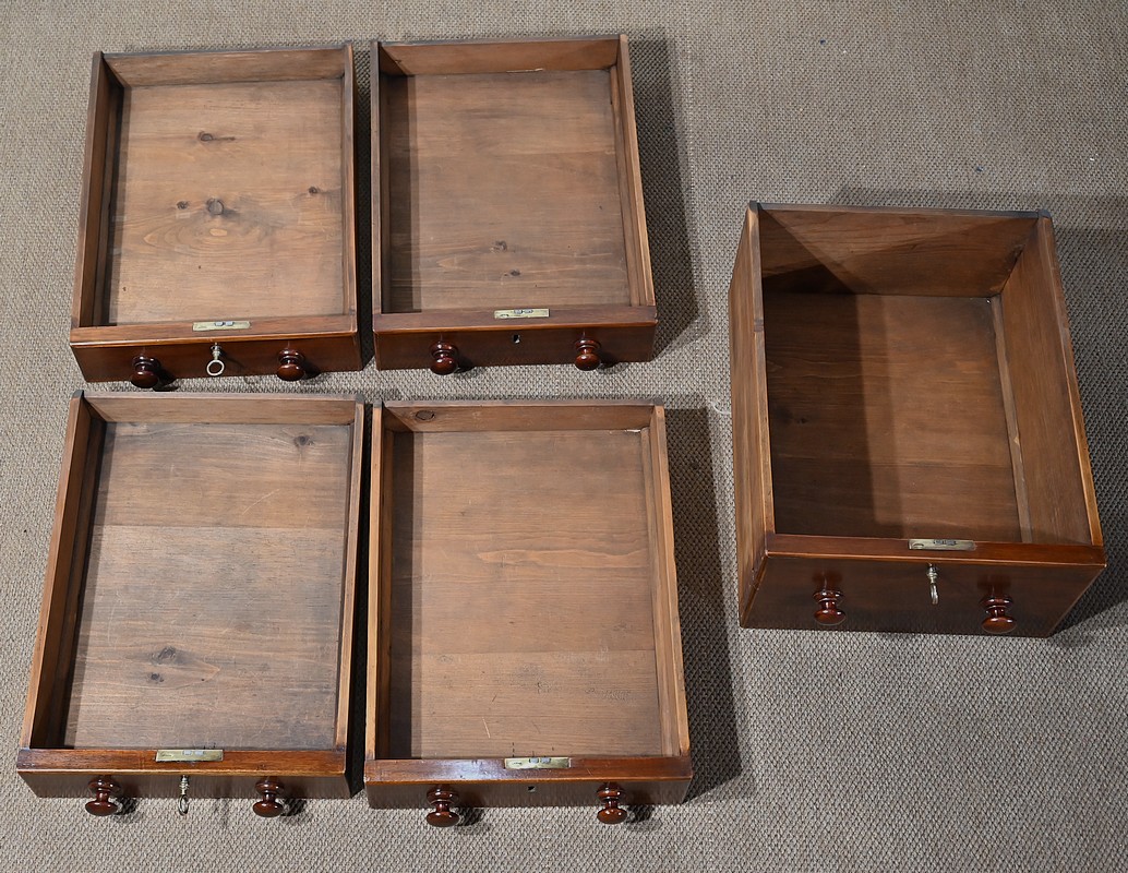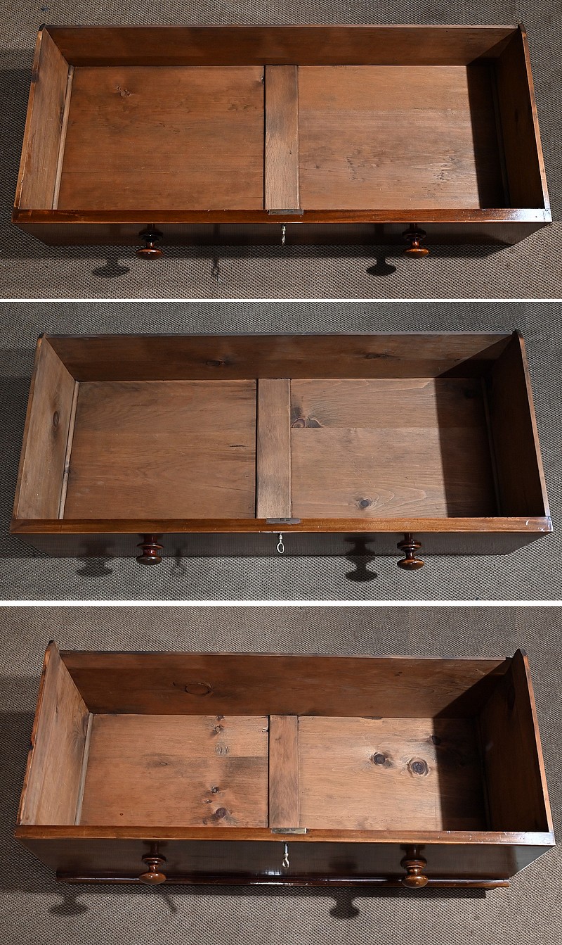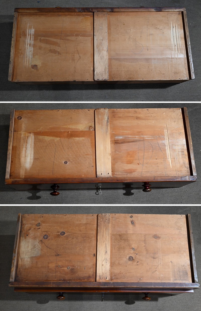 A noter la présence de cache-poussières entre tous les tiroirs. Ceux-ci ont un intérieur en pin et les trois grands sont dotés d’une traverse centrale qui en cas de charge lourde évite la déformation du fond, soulignant ainsi la qualité de fabrication de ce meuble.
