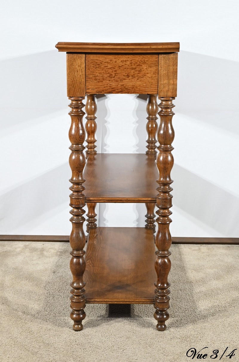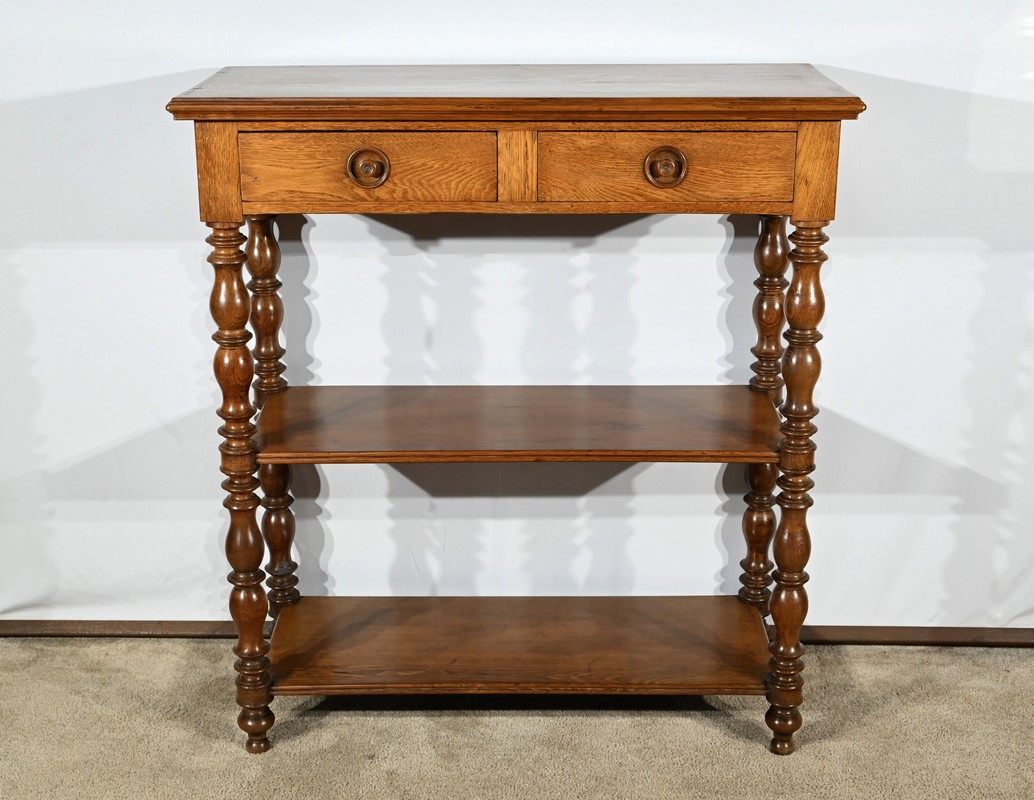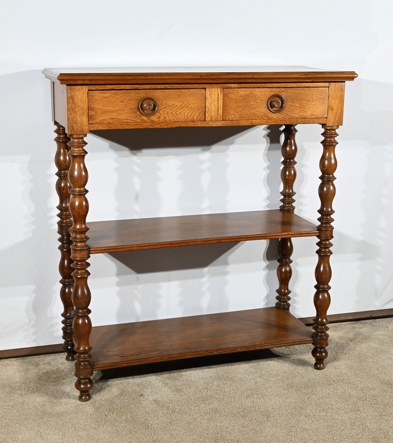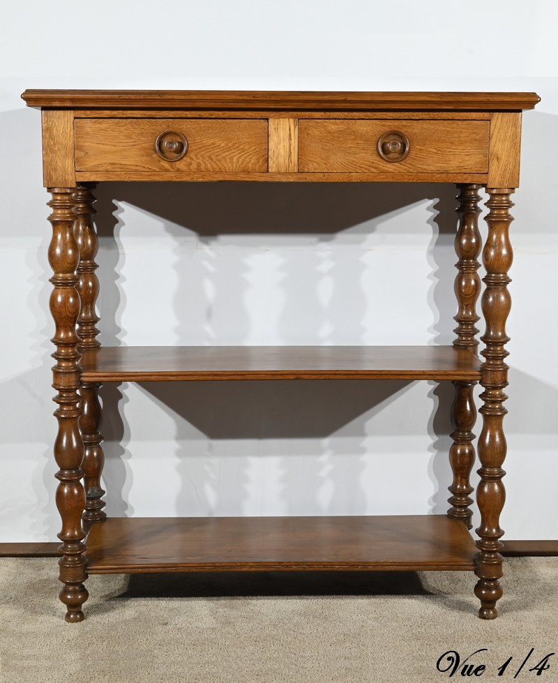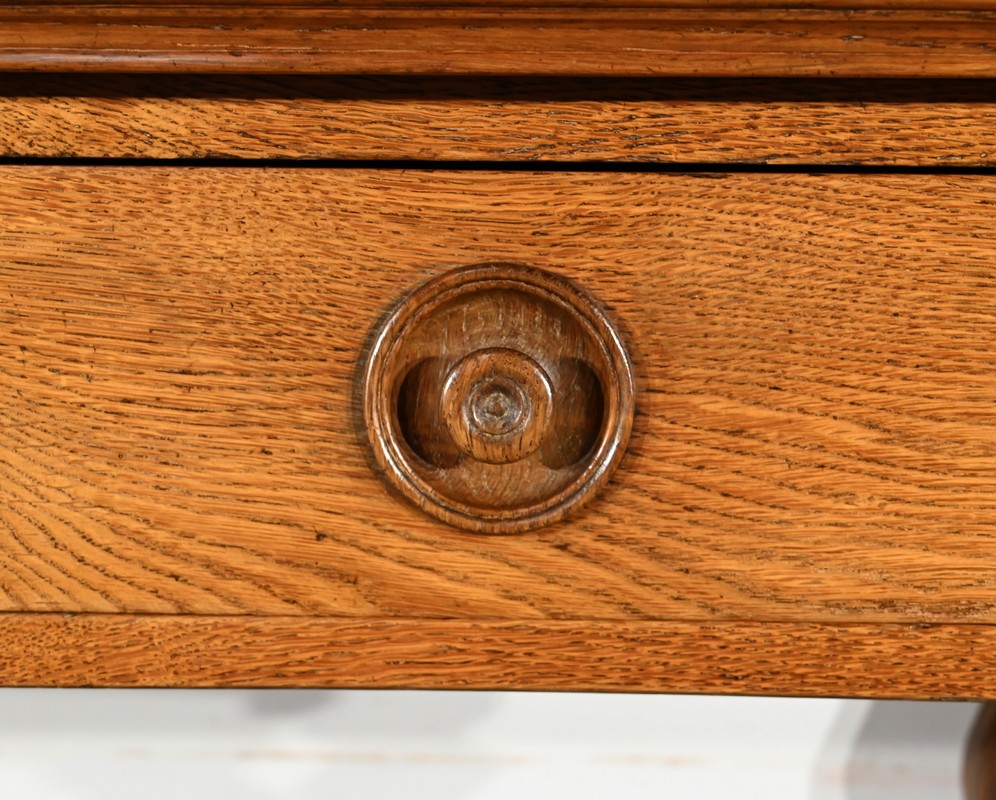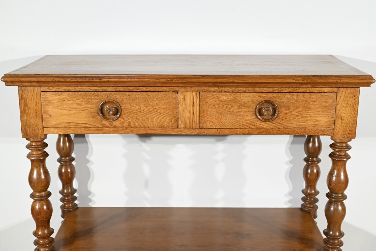 Cette desserte à hauteur d’appui en chêne massif ouvre par deux tiroirs en ceinture à boutons bois tournés.