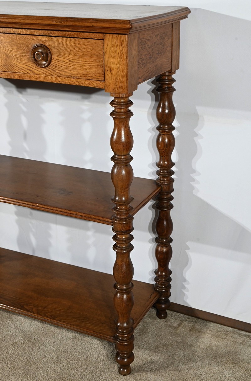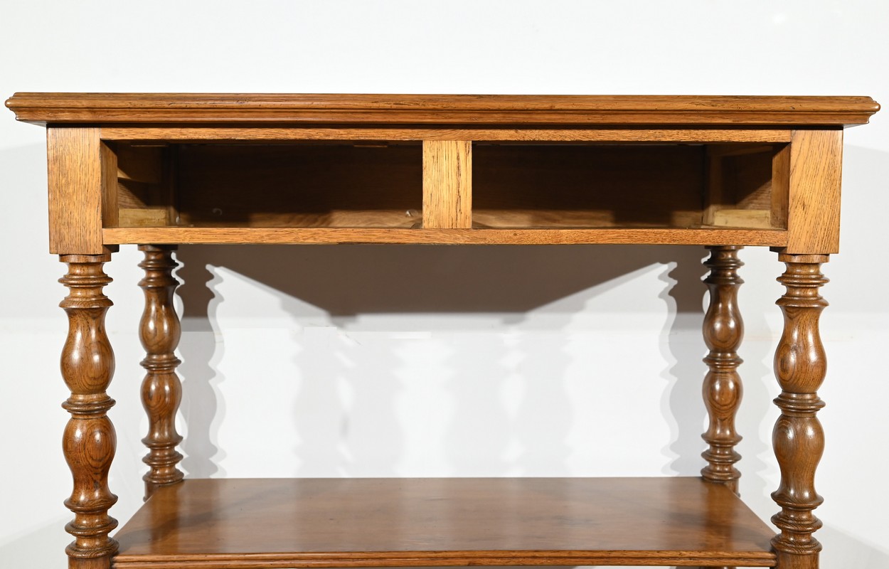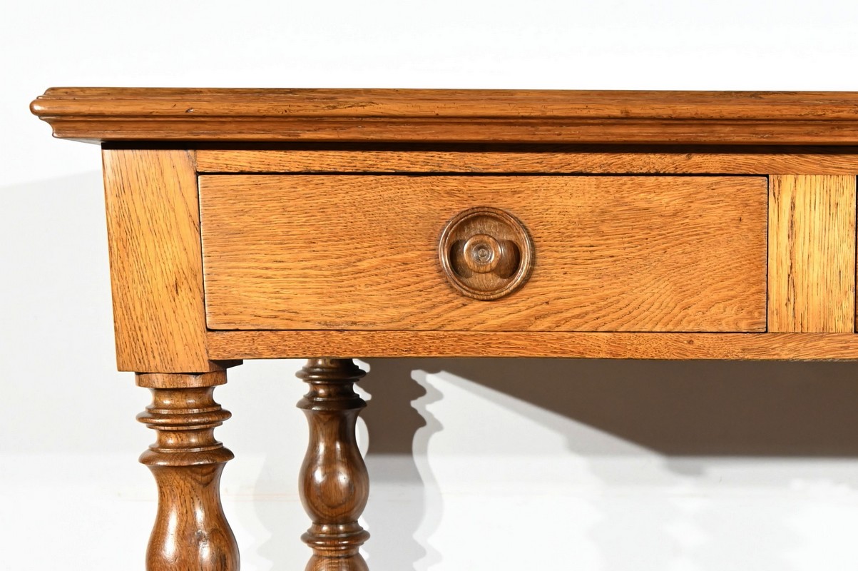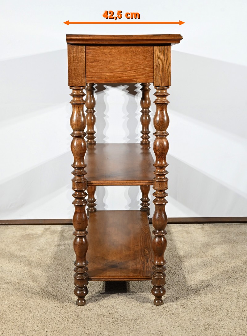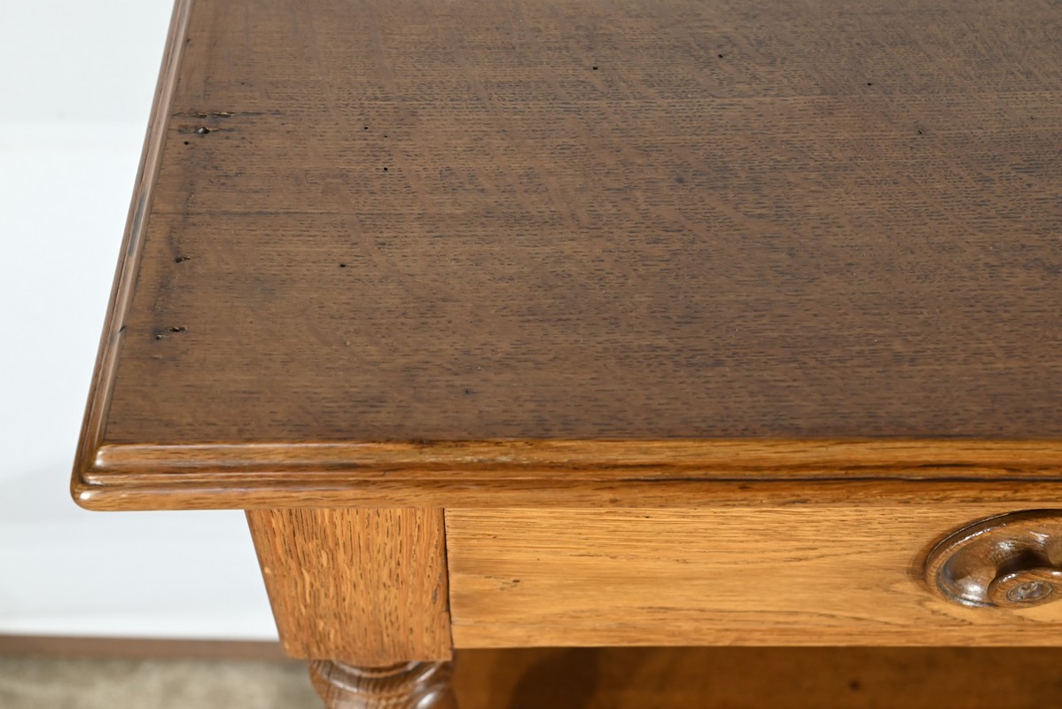 Cette desserte à hauteur d’appui en chêne massif ouvre par deux tiroirs en ceinture à boutons bois tournés.