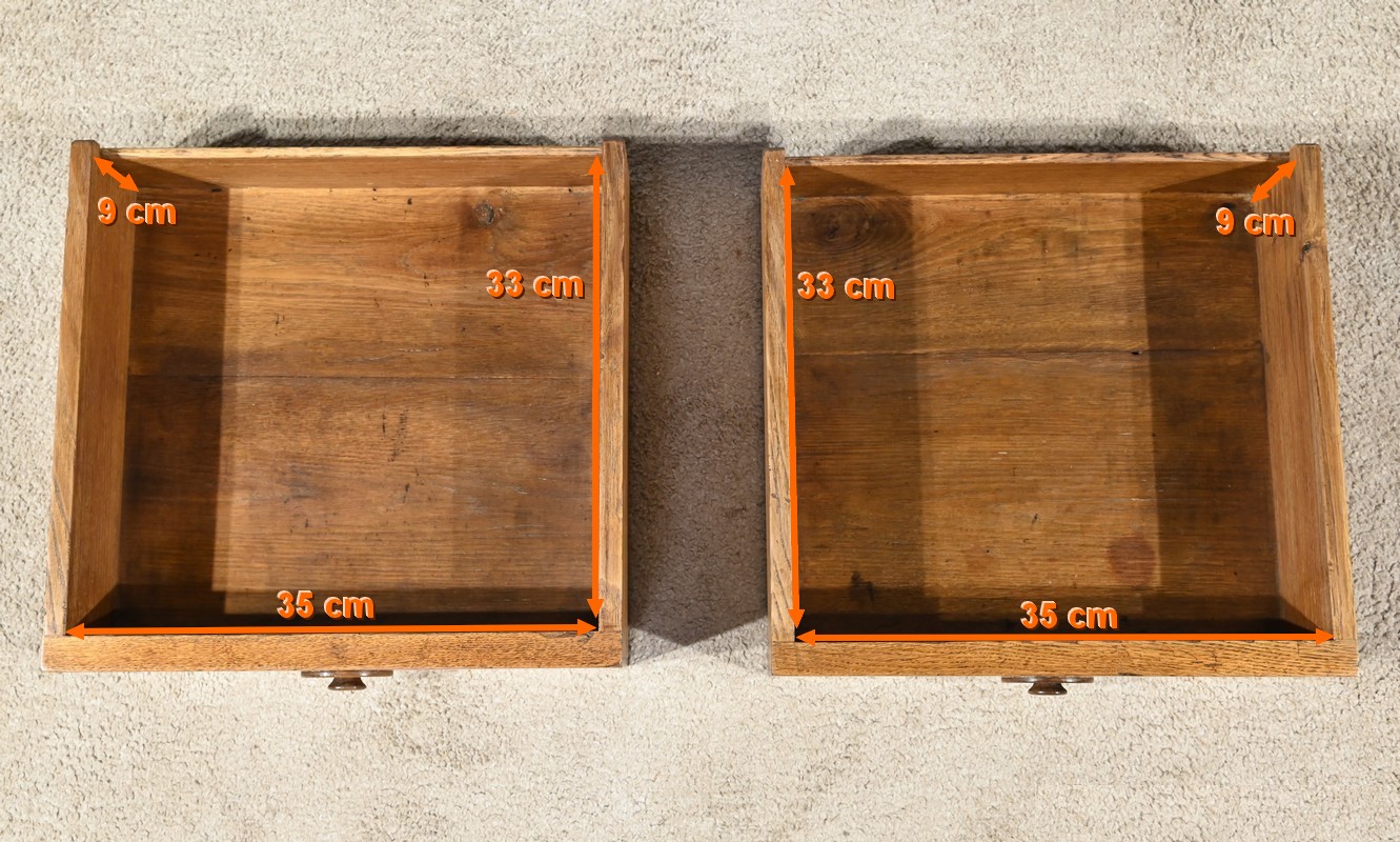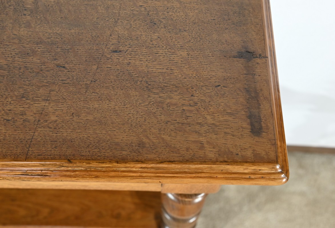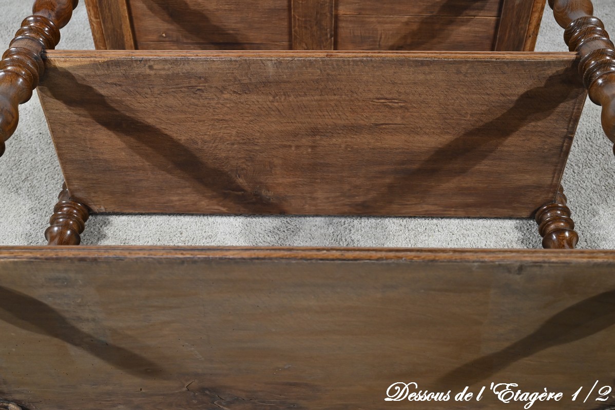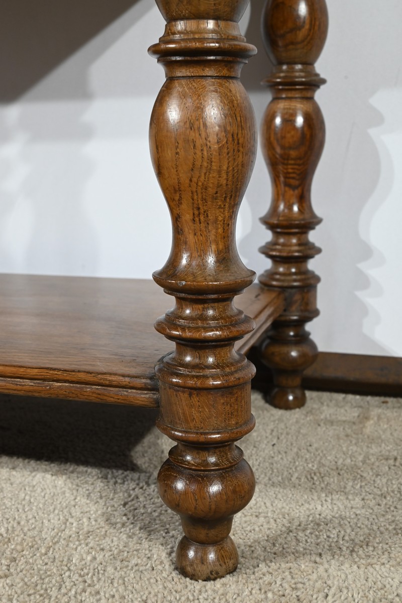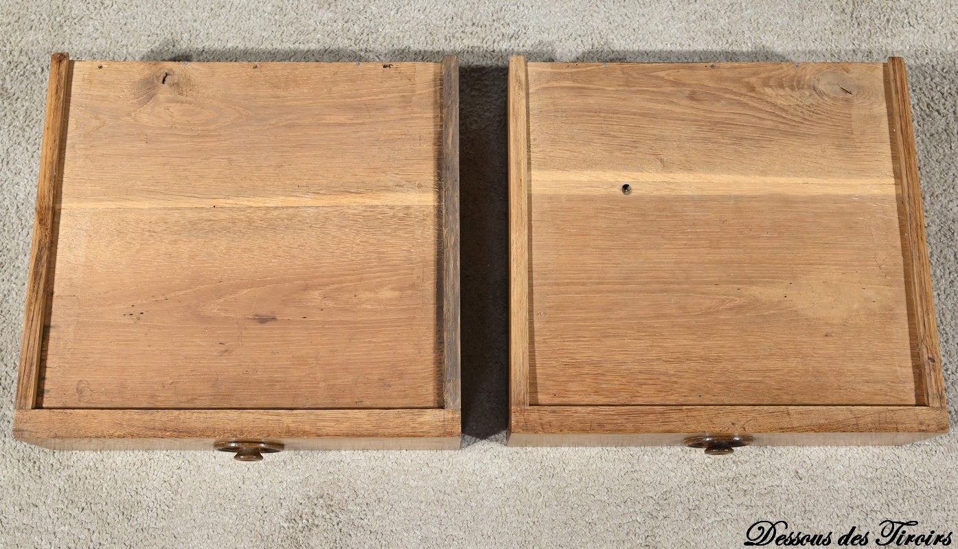 Cette desserte à hauteur d’appui en chêne massif ouvre par deux tiroirs en ceinture à boutons bois tournés.