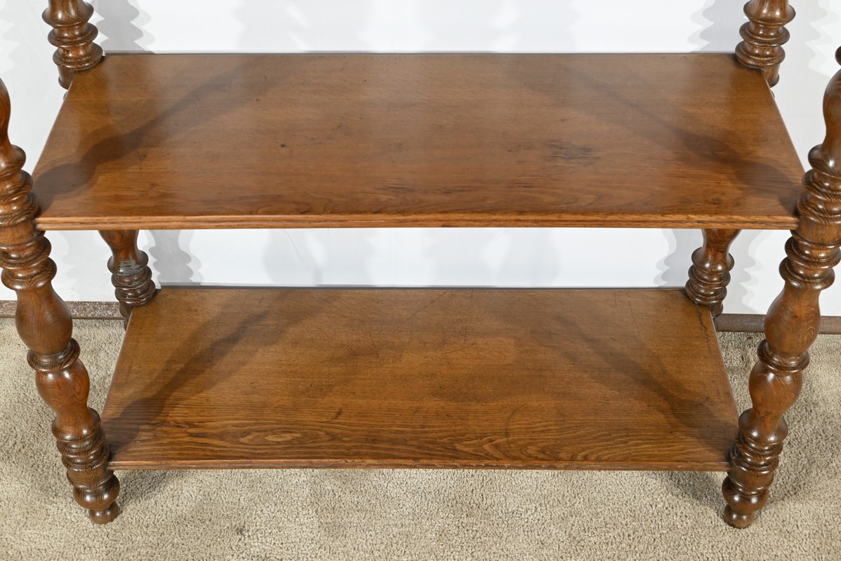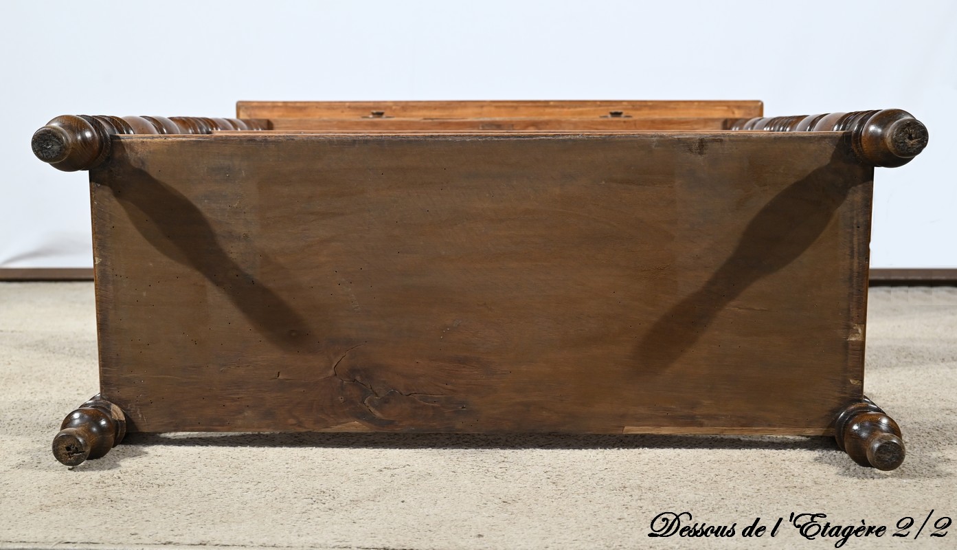 Les montants, tournés à étranglement, sont rejoints par deux étagères aux chants moulurés à gorge.