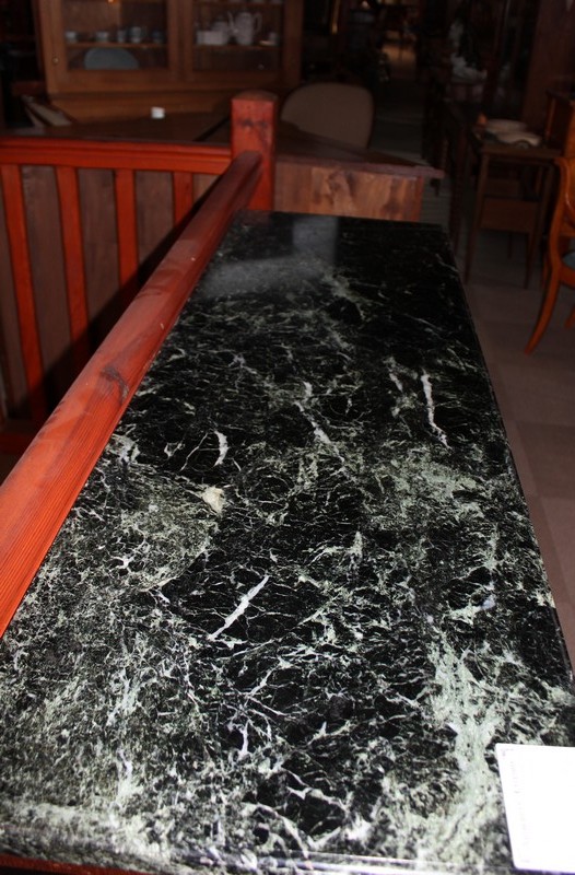 Console Art-Déco en acajou avec dessus en marbre noir veiné de vert.