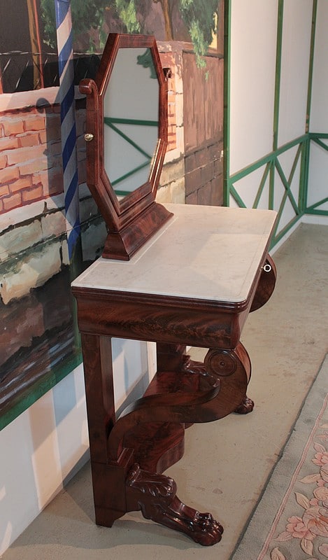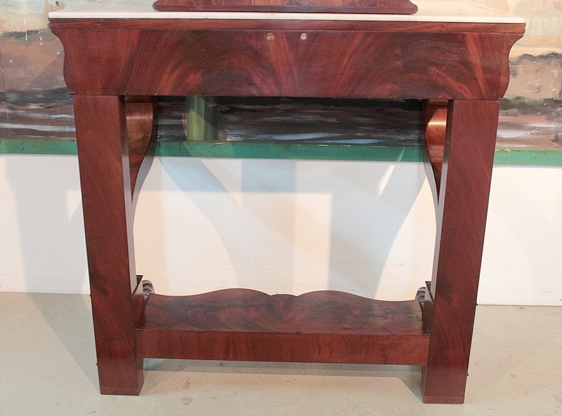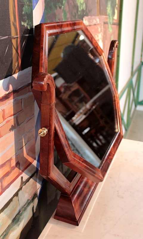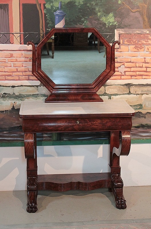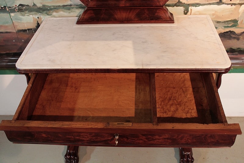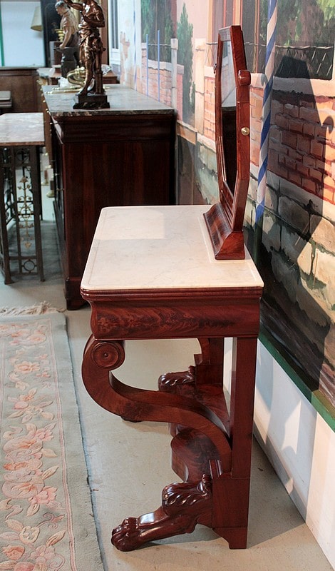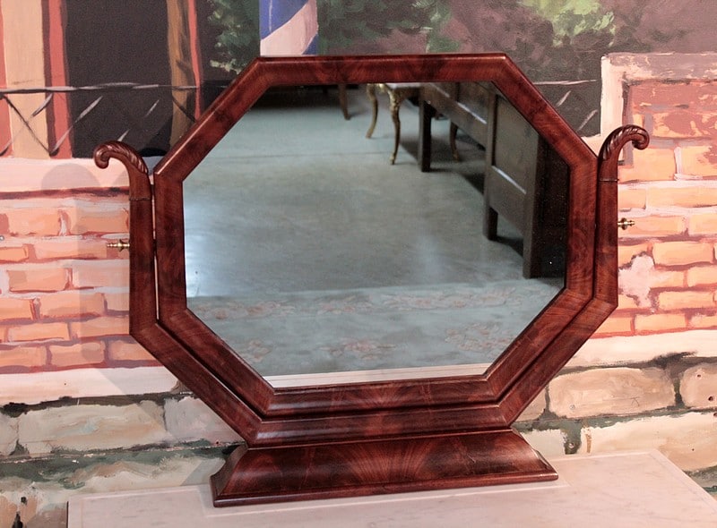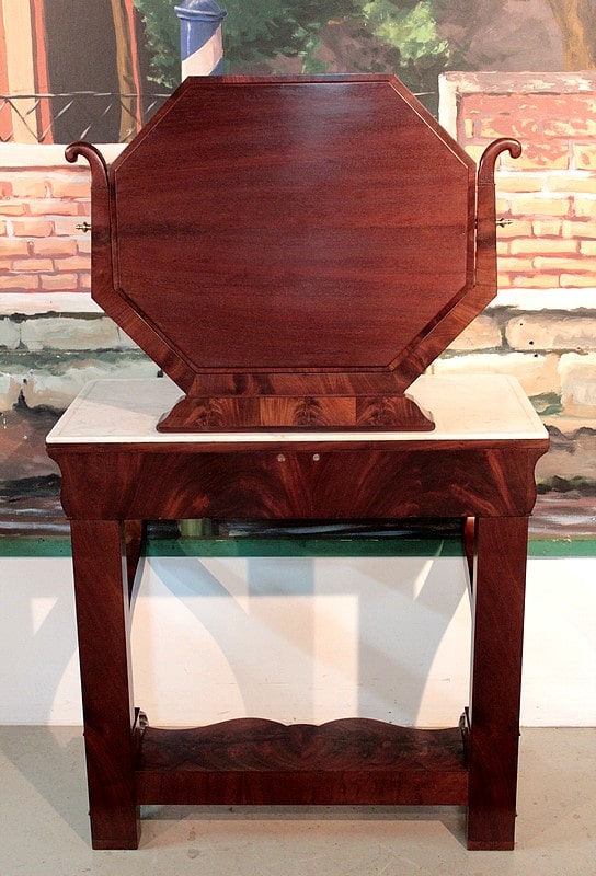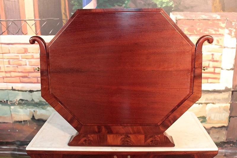 Console-Coiffeuse Restauration en acajou massif pour les pieds et placage d’acajou. Dessus de marbre blanc surmonté d’un miroir octogonal inclinable.