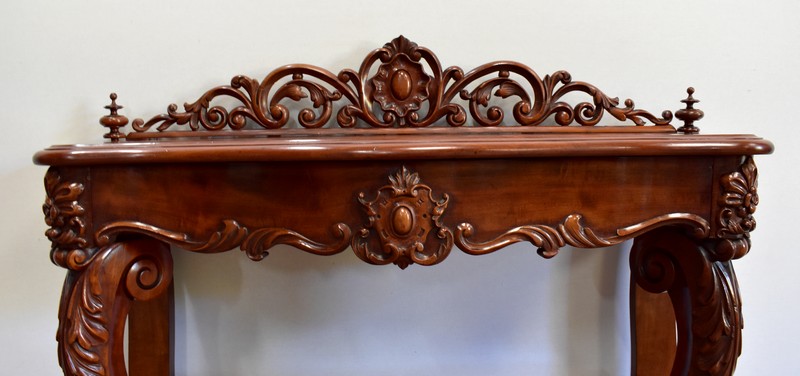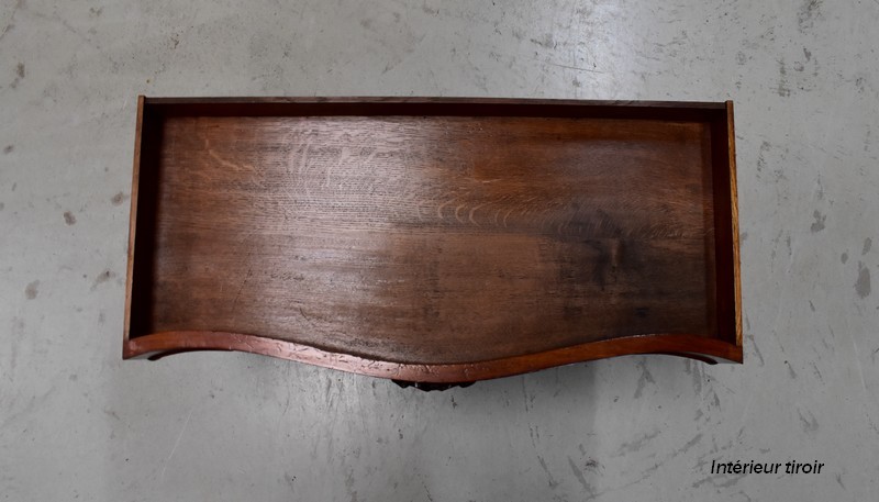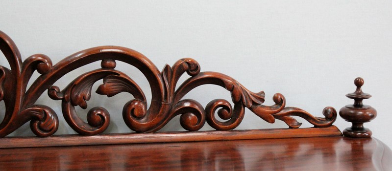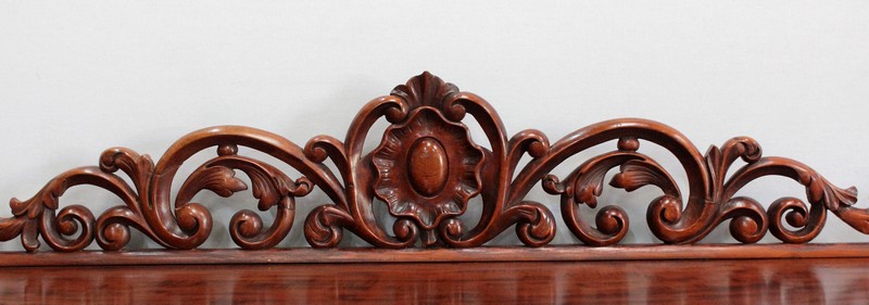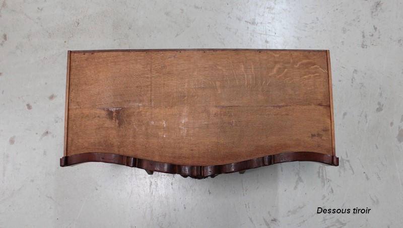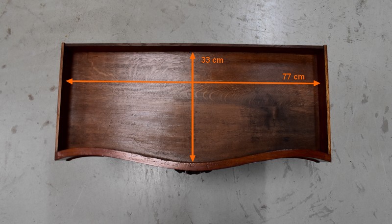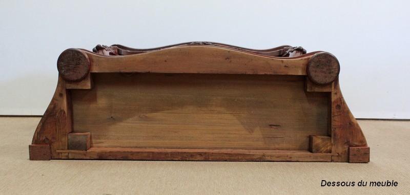 Son dessus consiste en un élégant plateau présentant une gorge et une moulure en bec-de-corbin sur son pourtour. Un fronton joliment sculpté de volutes vient l’enjoliver en partie arrière, accompagné à chaque extrémité d’une pièce tournée en toupie.