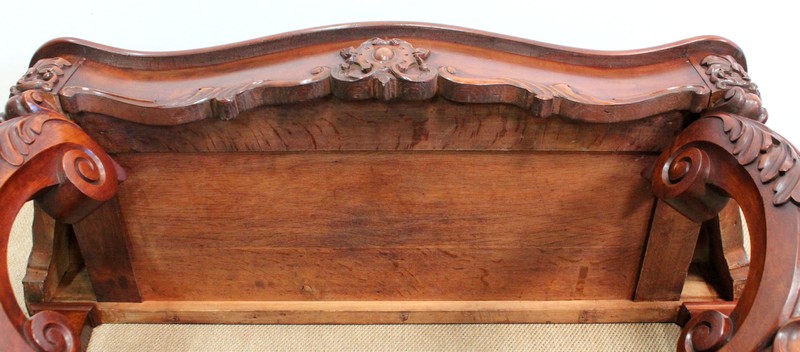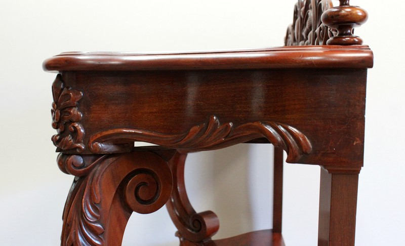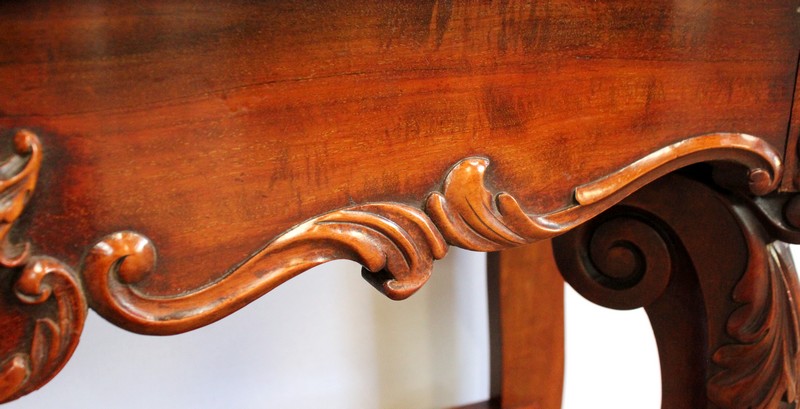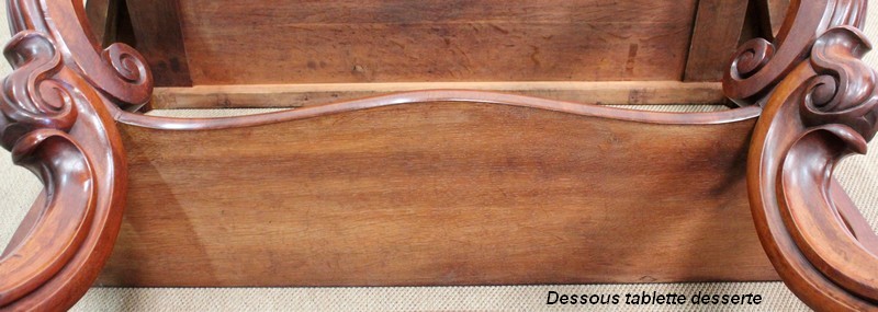 Elle repose en façade sur deux pieds consoles très cambrés en acajou massif, sculptés en partie haute d’une importante feuille d’acanthe : ils présentent une forme de double volute, inversée dans le milieu, sur laquelle vient prendre appui une tablette desserte en dégradé.
