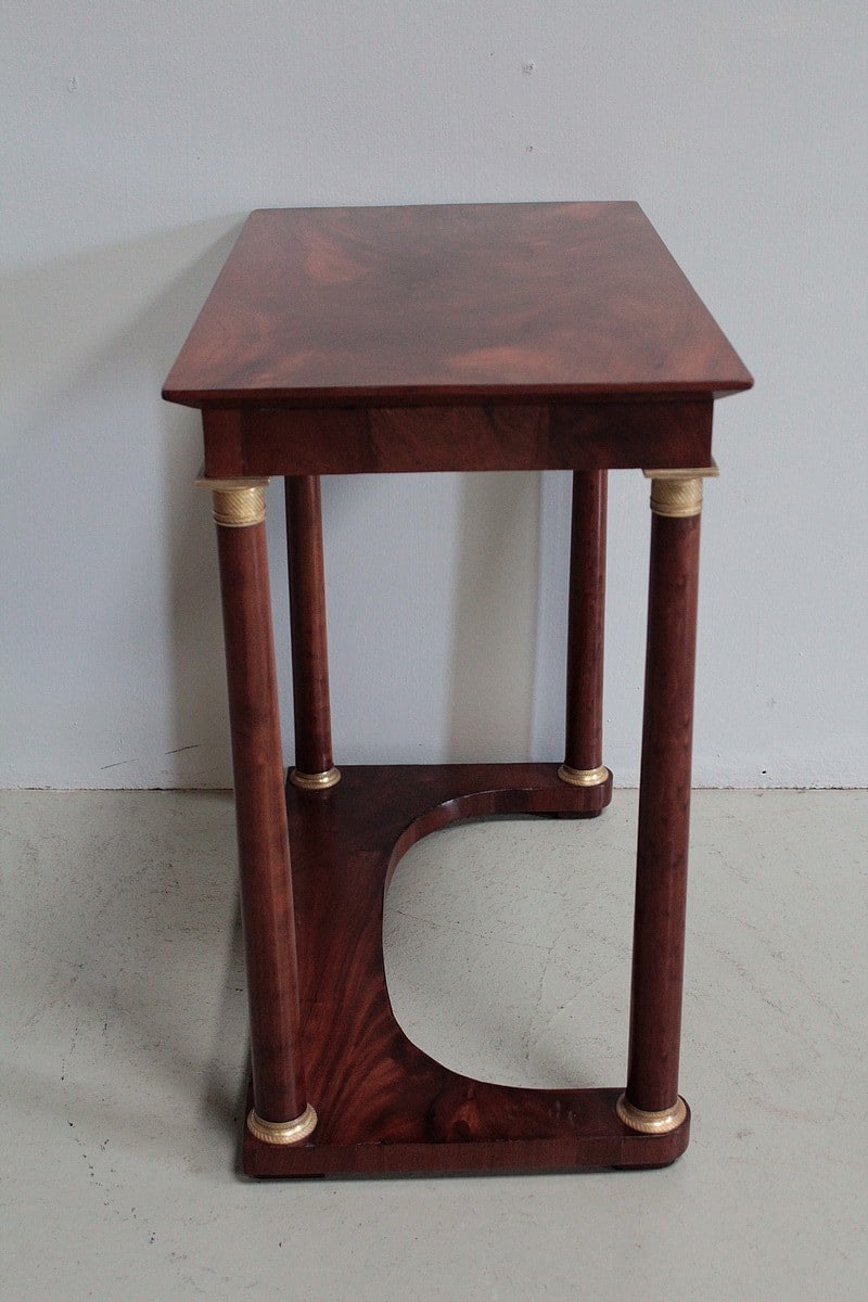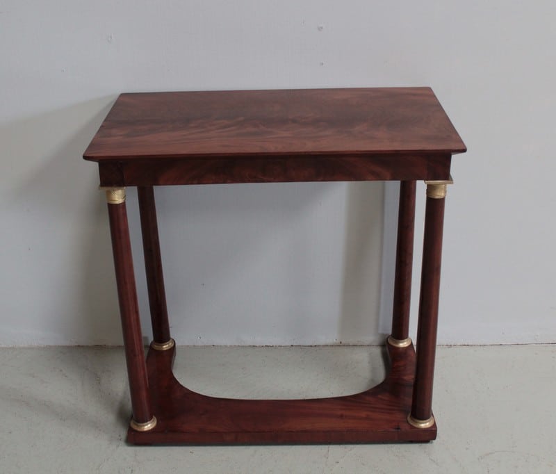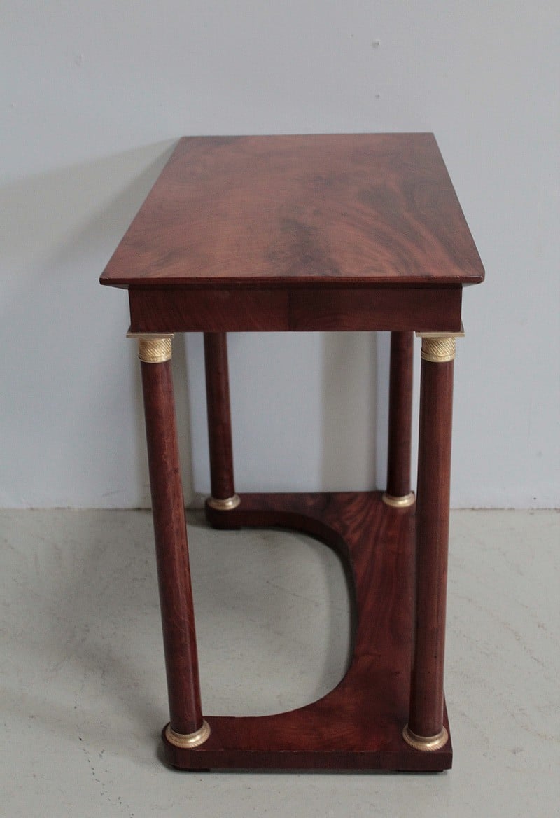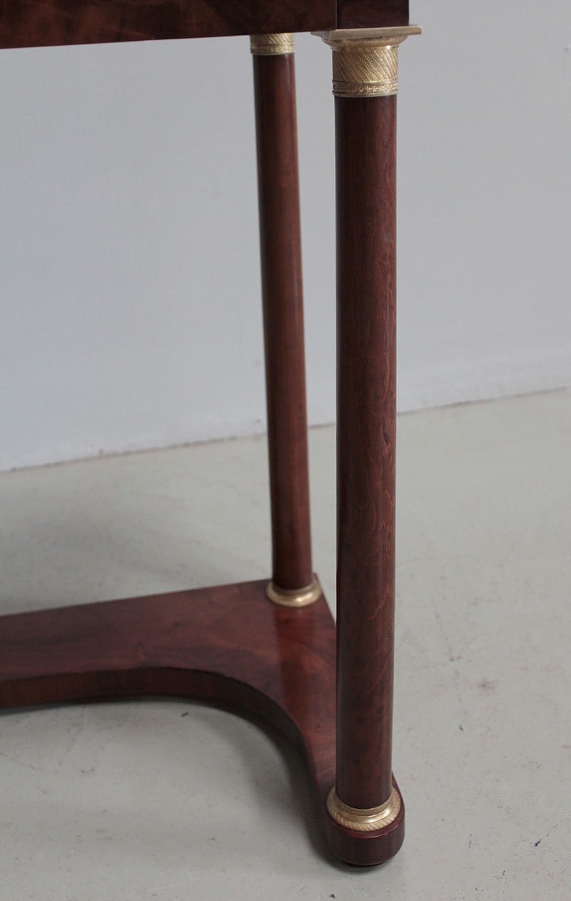 Petite console Empire en placage de ronce d’acajou à 4 colonnes en placage d’acajou moucheté, baguées de bronze haut et bas, reposant sur un socle.