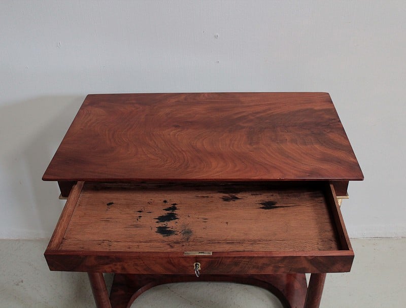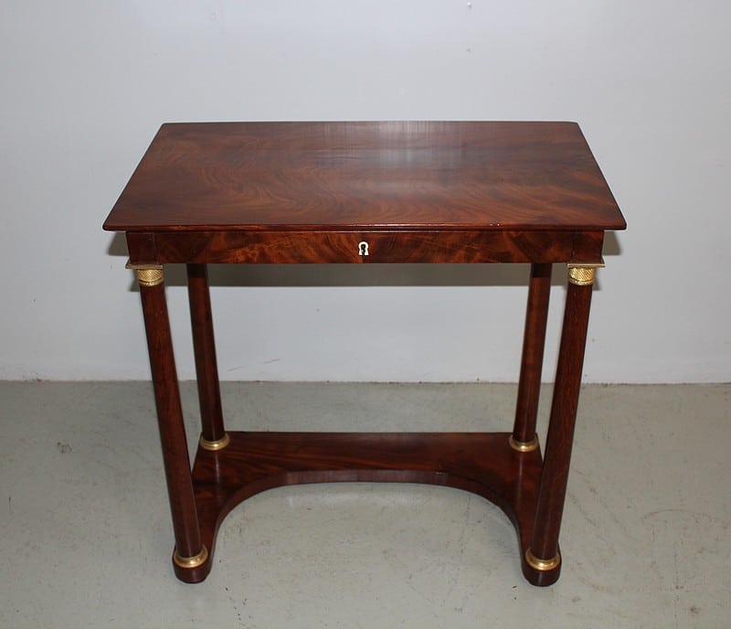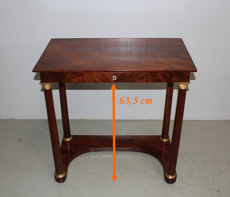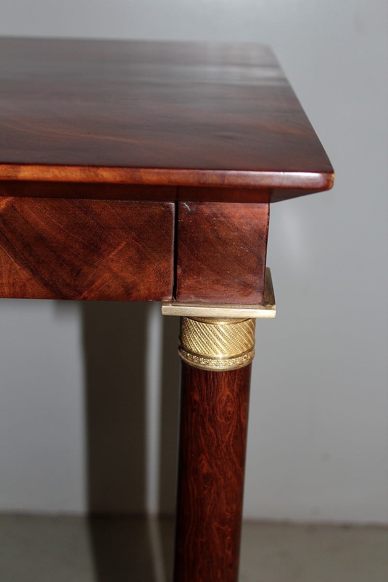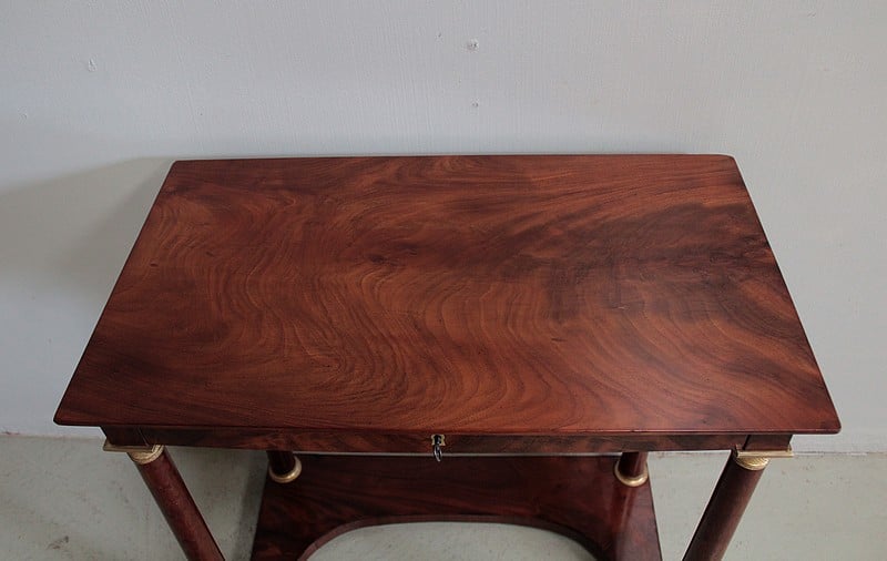 Petite console Empire en placage de ronce d’acajou à 4 colonnes en placage d’acajou moucheté, baguées de bronze haut et bas, reposant sur un socle.