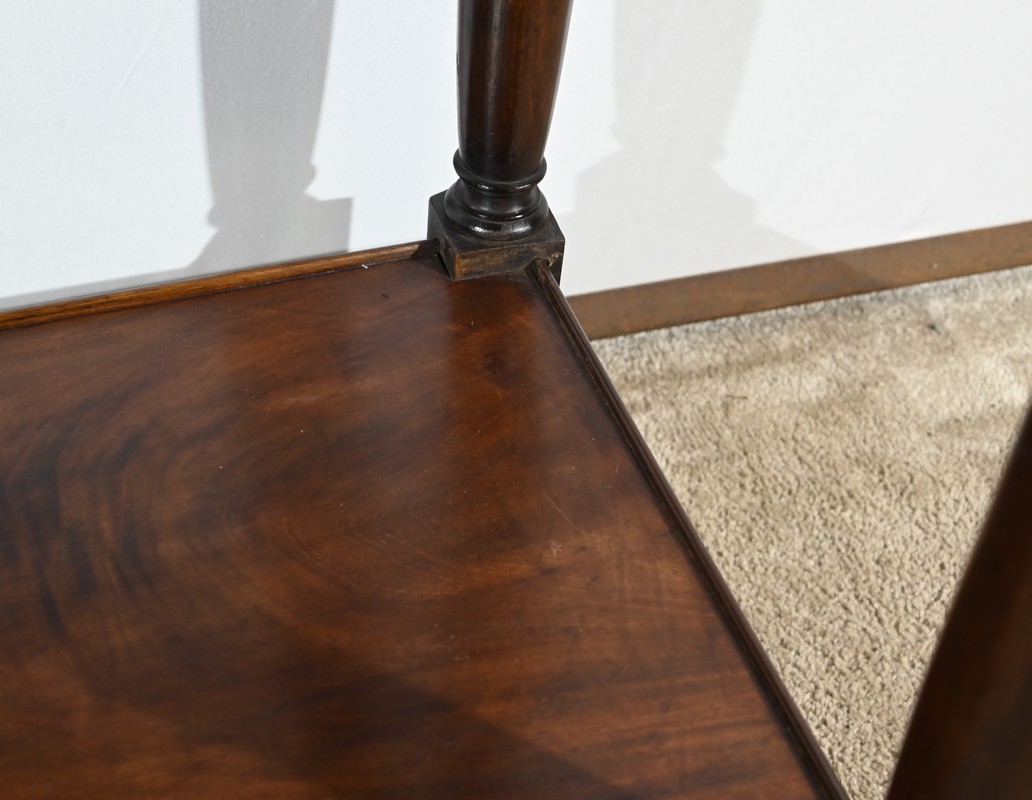 La tablette d’entretoise en acajou massif, avec baguette saillie, est légèrement en retrait.