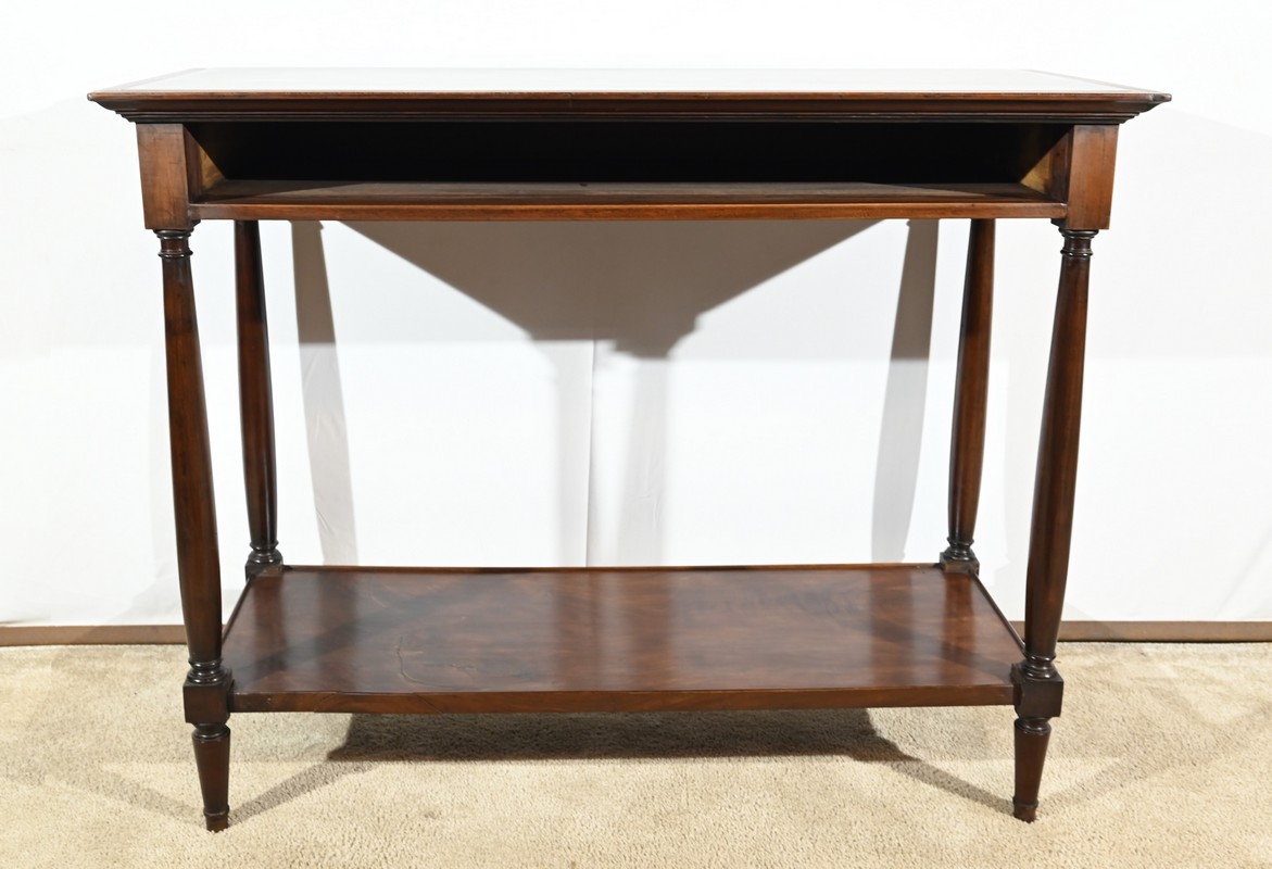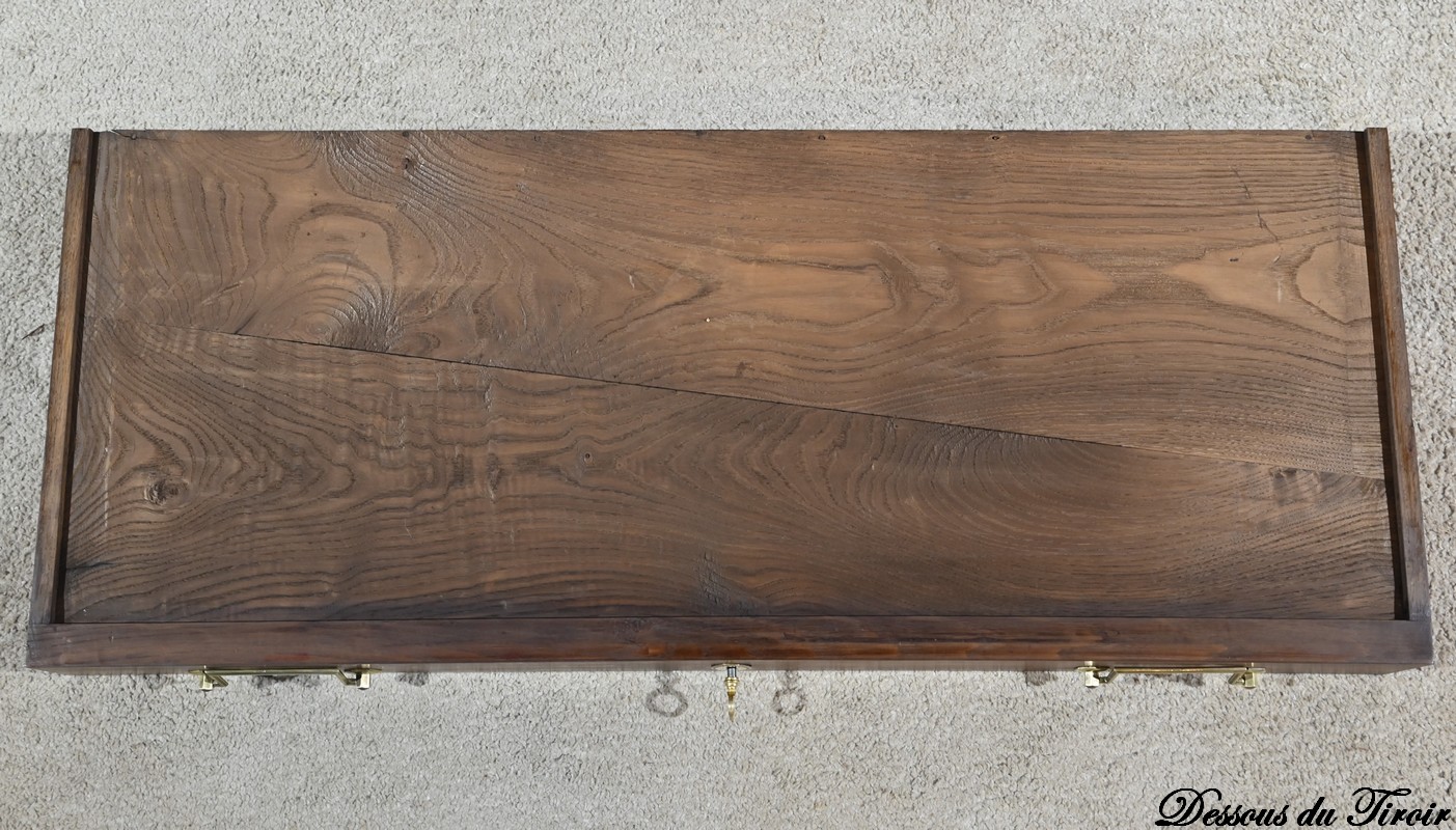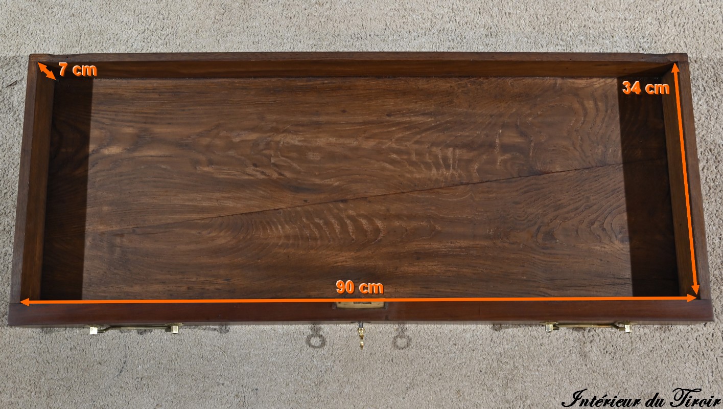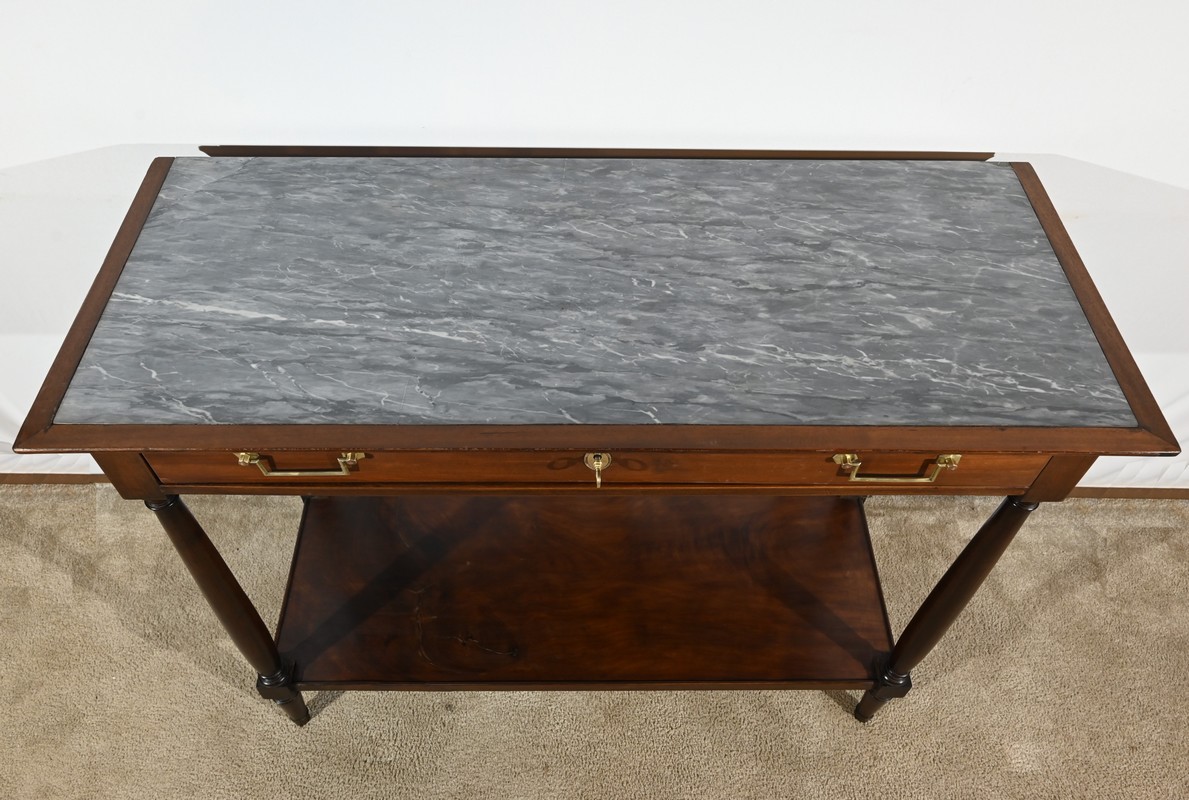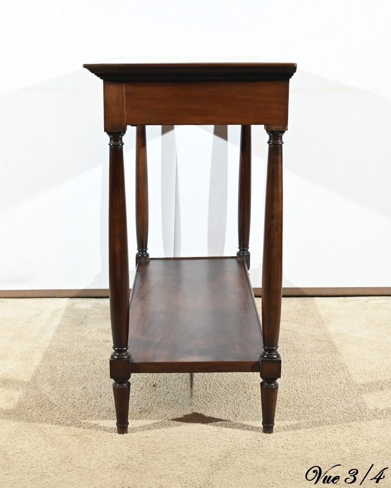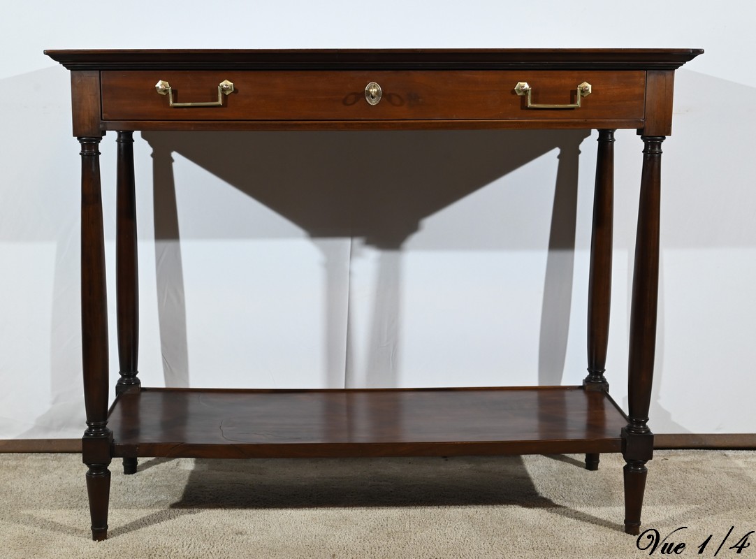 Cette console en acajou massif et plaqué ouvre en ceinture par un grand tiroir muni de deux poignées rabattables avec serrure d’origine fonctionnelle et entrée accompagné de leur clé ajustée.